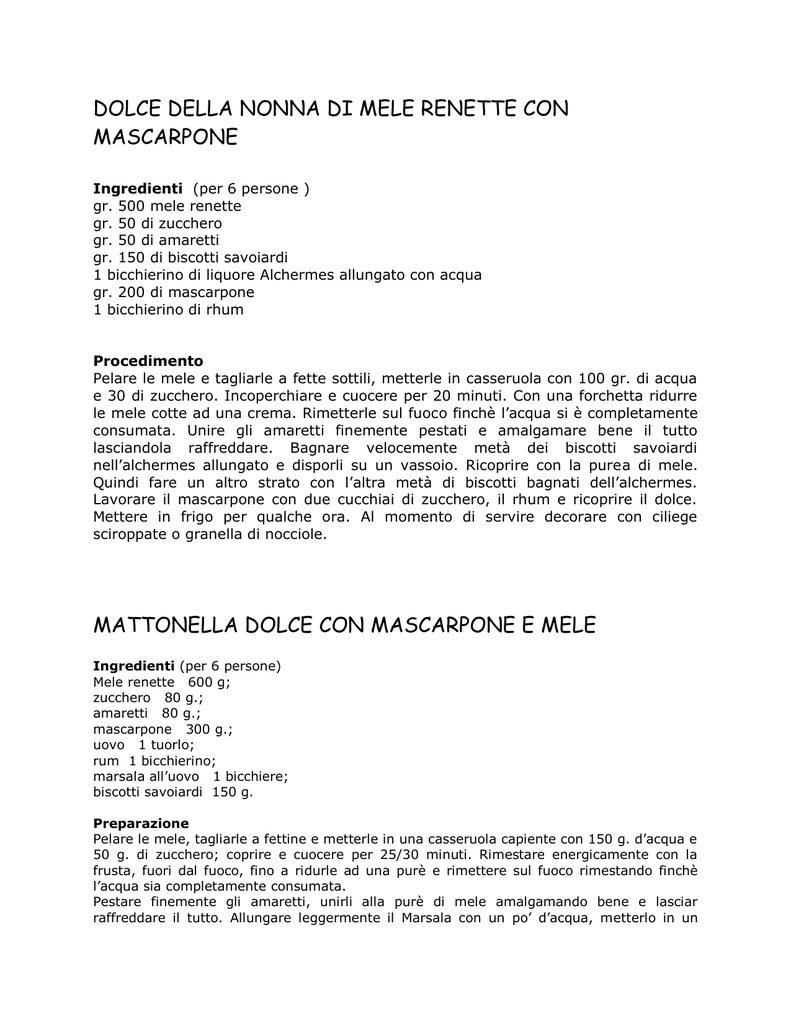 DOLCE DELLA NONNA DI MELE RENETTE CON MASCARPONE Ingredienti (per 6 persone ) gr. 500 mele renette gr. 50 di zucchero gr. 50 di amaretti gr. 150 di biscotti savoiardi 1 bicchierino di liquore Alchermes allungato con acqua gr. 200 di mascarpone 1 bicchierino di rhum Procedimento Pelare le mele e tagliarle a fette sottili, metterle in casseruola con 100 gr. di acqua e 30 di zucchero. Incoperchiare e cuocere per 20 minuti. Con una forchetta ridurre le mele cotte ad una crema. Rimetterle sul fuoco finchè l’acqua si è completamente consumata. Unire gli amaretti finemente pestati e amalgamare bene il tutto lasciandola raffreddare. Bagnare velocemente metà dei biscotti savoiardi nell’alchermes allungato e disporli su un vassoio. Ricoprire con la purea di mele. Quindi fare un altro strato con l’altra metà di biscotti bagnati dell’alchermes. Lavorare il mascarpone con due cucchiai di zucchero, il rhum e ricoprire il dolce. Mettere in frigo per qualche ora. Al momento di servire decorare con ciliege sciroppate o granella di nocciole. MATTONELLA DOLCE CON MASCARPONE E MELE Ingredienti (per 6 persone) Mele renette 600 g; zucchero 80 g.; amaretti 80 g.; mascarpone 300 g.; uovo 1 tuorlo; rum 1 bicchierino; marsala all’uovo 1 bicchiere; biscotti savoiardi 150 g. Preparazione Pelare le mele, tagliarle a fettine e metterle in una casseruola capiente con 150 g. d’acqua e 50 g. di zucchero; coprire e cuocere per 25/30 minuti. Rimestare energicamente con la frusta, fuori dal fuoco, fino a ridurle ad una purè e rimettere sul fuoco rimestando finchè l’acqua sia completamente consumata. Pestare finemente gli amaretti, unirli alla purè di mele amalgamando bene e lasciar raffreddare il tutto. Allungare leggermente il Marsala con un po’ d’acqua, metterlo in un piatto e bagnare velocemente rigirandoli per quattro volte metà dei biscotti savoiardi e disporli in un piatto da portata di forma rettangolare di cm. 34. Versarvi sopra la purè di mele e amaretti e ricoprire con l’altra metà di biscotti bagnati con il marsala come prima. Lavorare il tuorlo d’uovo con il rimanente zucchero (30 g.), unire il mascarpone e il rum e versarlo sul dolce ricoprendo anche i bordi. Livellarlo con una forchetta formando dei ciuffetti e mettere in frigo per almeno 3-4 ore. Presentazione Decorare con amarene sciroppate con anche un po’ del loro sciroppo e servire. PESCHE RIPIENE Ingredienti per 6 persone Sei pesche fresche intere (fuori stagione anche sciroppate) 60 g. di amaretti sbriciolati 2 cucchiai di zucchero 1 cucchiaino di cacao amaro 1 cucchiaino di cacao zuccherato 1 tuorlo di uovo crudo Scorza di ½ limone grattugiata 1 cucchiaio di marsala all’uovo Esecuzione Tagliare le pesche a metà e rimuovere il nocciuolo. Amalgamare gli amaretti sbriciolati con i rimanenti ingredienti e riempire le mezze pesche. Imburrare una teglia da forno e aggiungere ½ bicchiere di vino bianco dolce, disporre le mezze pesche ripiene nella teglia, infornare a 180 gradi per 30 minuti circa se le pesche sono fresche. Sfornarle, lasciarle raffreddare e servire. SEMIFREDDO ALLE FRAGOLE E AMARETTI Ingredienti per 6 persone 4 dl. di panna fresca da montare 150 gr. di amaretti 4-5 meringhe medie 20 gr. di zucchero a velo vanigliato 6 grosse fragole 200 gr. di nocciole tritate Esecuzione Versare la panna fredda in una ciotola e montarla. Unire lo zucchero a velo vanigliato e continuare a montarla finché sarà densa. Amalgamare con delicatezza 100 gr. di amaretti sbriciolati e tanta meringa spezzettata q.b. per ottenere un composto compatto. Stendere metà su un foglio di carta forno dandogli la forma di un lungo rettangolo. Distribuire sopra le fragole tagliate in 4 e ricoprire il composto rimasto. Avvolgere il composto nella carta dandogli la forma di un rotolo e metterlo in frizer per 4 o 5 ore. Scongelare il semifreddo 30 minuti prima di servirlo. Eliminare la carta e ricoprirlo completamente con le nocciole e gli amaretti rimasti. Tagliare il rotolo a fette e servirlo. SEMIFREDDO ROBERTA Ingredienti: (per ? persone) ½ litro di panna fresca da montare 120 gr. di zucchero 4 uova intere 1 bicchiere di nutella da 200 gr. 1 pacco di Pavesini da 200 gr. (forse un po’ di più) 1 caffettiera grande (da 6 tazze) di caffè 2 cucchiai di liquore all’amaretto Preparazione: Montare i 4 tuorli con lo zucchero, montare a neve gli albumi, montare la panna. Mescolare i tre composti, quindi dividerli in due parti. In una delle due parti mescolare insieme la nutella. Aggiungere il liquore al caffè freddo e inzuppare i Pavesini. In una tortiera di ceramica o di vetro di forma rettangolare o quadrata che possa andare in tavola fare uno strato leggero di composto, bianco o scuro, non importa, uno strato di Pavesini, uno strato di composto bianco, un altro strato di Pavesini, un altro strato di composto scuro. Mettere in freezer. Preparare almeno un giorno prima. Toglierlo dal freezer ¼ d’ora prima di servire. SEMOLINI DOLCI (“Fritura dusa” Ingredienti – un vessillo della piemontesità) - 1 litro di latte intero 5 cucchiai di zucchero 200 gr. Di semola 2 uova intere la buccia di due limoni grattugiati 1 puntina di vanillina Pane grattugiato q.b. Esecuzione In un tegame di alluminio bollire il latte con la vanillina. Togliere dal fuoco, aggiungere lo zucchero e versare il semolino a pioggia girando con la frusta evitando di formare grumi. Rimettere sul fuoco e cuocere per dieci minuti, sempre girando con un cucchiaio di legno. Dopo di chè ritirare di nuovo dal fuoco. Aggiungere il limone grattugiato, le uova intere, girando velocemente affinché l’uovo non si scuocia. Rimettere sul fuoco per un minuto senza girare per farlo gonfiare. Versarlo in una teglia rettangolare bagnata da acqua livellandolo col dorso del cucchiaio bagnato d’acqua fredda allo spessore di 2 cm. circa. Raffreddare, tagliare a losanghe, impanare con uovo sbattuto leggermente salato e passare nel pan grattato. Friggere in abbondante olio d’oliva f