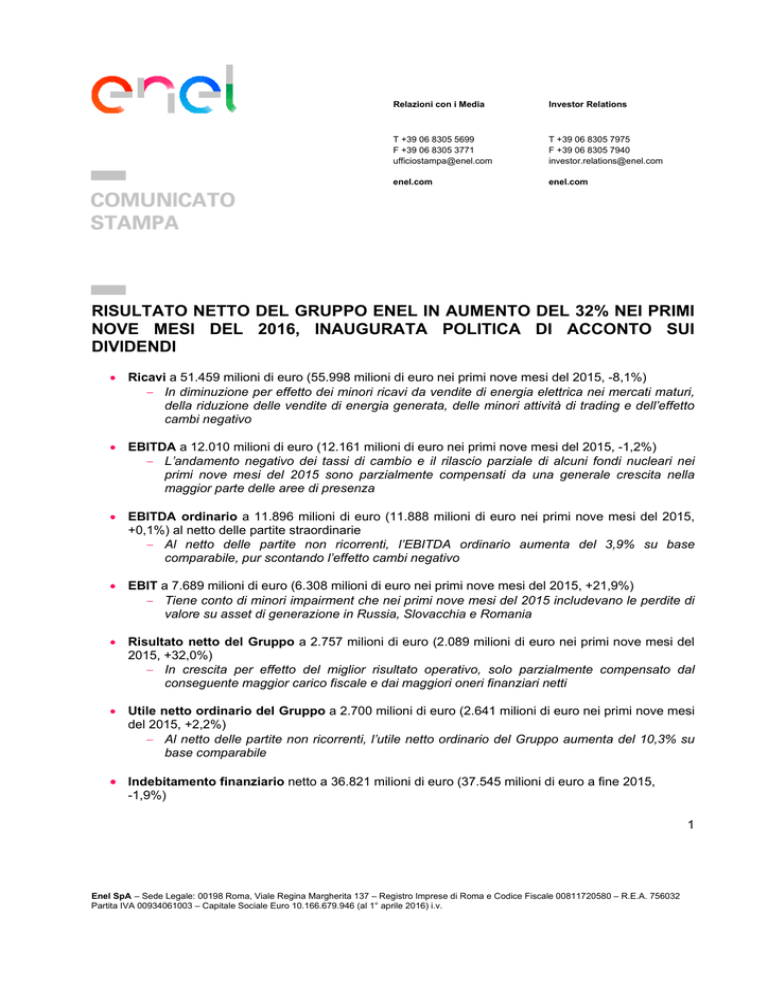 Relazioni con i Media Investor Relations T +39 06 8305 5699 F +39 06 8305 3771 [email protected] T +39 06 8305 7975 F +39 06 8305 7940 [email protected] enel.com enel.com RISULTATO NETTO DEL GRUPPO ENEL IN AUMENTO DEL 32% NEI PRIMI NOVE MESI DEL 2016, INAUGURATA POLITICA DI ACCONTO SUI DIVIDENDI Ricavi a 51.459 milioni di euro (55.998 milioni di euro nei primi nove mesi del 2015, -8,1%) In diminuzione per effetto dei minori ricavi da vendite di energia elettrica nei mercati maturi, della riduzione delle vendite di energia generata, delle minori attività di trading e dell’effetto cambi negativo EBITDA a 12.010 milioni di euro (12.161 milioni di euro nei primi nove mesi del 2015, -1,2%) L’andamento negativo dei tassi di cambio e il rilascio parziale di alcuni fondi nucleari nei primi nove mesi del 2015 sono parzialmente compensati da una generale crescita nella maggior parte delle aree di presenza EBITDA ordinario a 11.896 milioni di euro (11.888 milioni di euro nei primi nove mesi del 2015, +0,1%) al netto delle partite straordinarie Al netto delle partite non ricorrenti, l’EBITDA ordinario aumenta del 3,9% su base comparabile, pur scontando l’effetto cambi negativo EBIT a 7.689 milioni di euro (6.308 milioni di euro nei primi nove mesi del 2015, +21,9%) Tiene conto di minori impairment che nei primi nove mesi del 2015 includevano le perdite di valore su asset di generazione in Russia, Slovacchia e Romania Risultato netto del Gruppo a 2.757 milioni di euro (2.089 milioni di euro nei primi nove mesi del 2015, +32,0%) In crescita per effetto del miglior risultato operativo, solo parzialmente compensato dal conseguente maggior carico fiscale e dai maggiori oneri finanziari netti Utile netto ordinario del Gruppo a 2.700 milioni di euro (2.641 milioni di euro nei primi nove mesi del 2015, +2,2%) Al netto delle partite non ricorrenti, l’utile netto ordinario del Gruppo aumenta del 10,3% su base comparabile Indebitamento finanziario netto a 36.821 milioni di euro (37.545 milioni di euro a fine 2015, -1,9%) 1 Enel SpA – Sede Legale: 00198 Roma, Viale Regina Margherita 137 – Registro Imprese di Roma e Codice Fiscale 00811720580 – R.E.A. 756032 Partita IVA 00934061003 – Capitale Sociale Euro 10.166.679.946 (al 1° aprile 2016) i.v. In diminuzione per effetto dei flussi di cassa della gestione operativa e dell’andamento positivo della variazione dei tassi di cambio di alcune valute in cui è espresso parte dell’indebitamento Deliberato un acconto sul dividendo 2016 pari a 0,09 euro per azione, in pagamento dal 25 gennaio 2017 Il CdA Enel inaugura una politica di acconto sui dividendi, prevista dal nuovo piano strategico le cui linee guida saranno illustrate alla comunità finanziaria a Londra il prossimo 22 novembre Francesco Starace, amministratore delegato e direttore generale di Enel, ha così commentato: “Nei primi nove mesi del 2016 abbiamo registrato una solida performance, con continui progressi rispetto agli obiettivi strategici di Gruppo. I nostri risultati economico-finanziari sono diretta conseguenza degli avanzamenti realizzati nel raggiungimento dei nostri obiettivi strategici. Questi progressi si traducono in una stabile generazione di cassa e in un notevole miglioramento dell’utile ordinario al netto delle partite non ricorrenti. Su queste basi abbiamo deciso di reintrodurre una politica di acconto sui dividendi, applicabile già a partire dai risultati del 2016. Confermiamo i target economico-finanziari per l’anno corrente, che abbiamo rivisto al rialzo in occasione della presentazione dei risultati del semestre, e ci attendiamo a fine anno un indebitamento finanziario netto inferiore di circa 1 miliardo di euro rispetto alle previsioni del piano strategico 2016-2019.” ***** Roma, 10 novembre 2016 – Il Consiglio di Amministrazione di Enel S.p.A. (“Enel” o la “Società”), presieduto da Patrizia Grieco, ha esaminato ed approvato il resoconto intermedio di gestione al 30 settembre 2016, nonché il prospetto contabile di Enel riferito alla medesima data e la relazione, da cui risulta che la situazione patrimoniale, economica e finanziaria della Società consente la distribuzione di un acconto sul dividendo per l’esercizio 2016 pari a 0,09 euro per azione, che verrà messo in pagamento dal 25 gennaio 2017. Dati economico-finanziari consolidati dei primi nove mesi del 2016 RICAVI Nella seguente tabella sono esposti i ricavi dettagliati per aree di business: Ricavi (milioni di euro) 2016 2015 Variazione Italia 26.335 29.205 -9,8% Iberia 14.048 15.474 -9,2% America Latina 7.923 8.125 -2,5% Europa e Nord Africa 3.075 3.658 -15,9% 672 633 6,2% 18 3 - (612) (1.100) 44,4% 51.459 55.998 -8,1% Nord e Centro America Africa Sub-Sahariana e Asia Altro, elisioni e rettifiche TOTALE 2 I ricavi dei primi nove mesi del 2016 presentano un decremento di 4.539 milioni di euro rispetto all’analogo periodo del 2015, sostanzialmente dovuto: a minori ricavi da vendite di energia nei mercati maturi; alla riduzione delle vendite di energia generata, che risentono anche del deconsolidamento di Slovenské elektrárne avvenuto nel mese di luglio 2016; a minori attività di trading di energia elettrica; all’effetto cambi negativo, che ha avuto un impatto significativo prevalentemente nei Paesi dell’America Latina; ai minori ricavi per vendite e contributi ricevuti relativi ai certificati ambientali; ai minori ricavi in Argentina rispetto a quelli registrati nei primi nove mesi del 2015, che avevano beneficiato dei contributi ricevuti per effetto della Resolución n. 32/2015. I ricavi dei primi nove mesi del 2016 includono, come elementi straordinari, le plusvalenze realizzate grazie alla cessione di GNL Quintero e di Hydro Dolomiti Enel, rispettivamente pari a 171 milioni di euro e 124 milioni di euro. I ricavi dei primi nove mesi del 2015 includevano invece, come elementi straordinari, la plusvalenza realizzata dalla cessione di Se Hydropower (pari a 141 milioni di eu