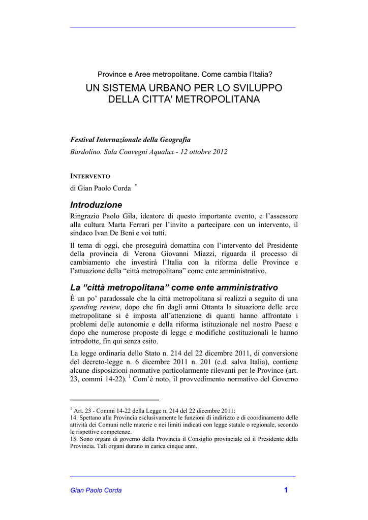 Province e Aree metropolitane. Come cambia l’Italia? UN SISTEMA URBANO PER LO SVILUPPO DELLA CITTA' METROPOLITANA Festival Internazionale della Geografia Bardolino. Sala Convegni Aqualux - 12 ottobre 2012 INTERVENTO di Gian Paolo Corda * Introduzione Ringrazio Paolo Gila, ideatore di questo importante evento, e l’assessore alla cultura Marta Ferrari per l’invito a partecipare con un intervento, il sindaco Ivan De Beni e voi tutti. Il tema di oggi, che proseguirà domattina con l’intervento del Presidente della provincia di Verona Giovanni Miazzi, riguarda il processo di cambiamento che investirà l’Italia con la riforma delle Province e l’attuazione della “città metropolitana” come ente amministrativo. La “città metropolitana” come ente amministrativo È un po’ paradossale che la città metropolitana si realizzi a seguito di una spending review, dopo che fin dagli anni Ottanta la situazione delle aree metropolitane si è imposta all’attenzione di quanti hanno affrontato i problemi delle autonomie e della riforma istituzionale nel nostro Paese e dopo che numerose proposte di legge e modifiche costituzionali le hanno introdotte, fin qui senza esito. La legge ordinaria dello Stato n. 214 del 22 dicembre 2011, di conversione del decreto-legge n. 6 dicembre 2011 n. 201 (c.d. salva Italia), contiene alcune disposizioni normative particolarmente rilevanti per le Province (art. 23, commi 14-22). 1 Com’è noto, il provvedimento normativo del Governo 1 Art. 23 - Commi 14-22 della Legge n. 214 del 22 dicembre 2011: 14. Spettano alla Provincia esclusivamente le funzioni di indirizzo e di coordinamento delle attività dei Comuni nelle materie e nei limiti indicati con legge statale o regionale, secondo le rispettive competenze. 15. Sono organi di governo della Provincia il Consiglio provinciale ed il Presidente della Provincia. Tali organi durano in carica cinque anni. Gian Paolo Corda 1 Monti non ne prevede la soppressione, mantenendone la natura di enti locali territoriali nei quali si articola l'ordinamento repubblicano ai sensi dell'art. 114 della Costituzione. Il decreto, invece, incide sugli organi e sulla loro composizione: sparisce la Giunta provinciale, vengono mantenuti il Presidente della Provincia e il Consiglio, il primo eletto dall'organo assembleare e il secondo composto da non più di dieci componenti, eletti non dal corpo elettorale ma dagli organi elettivi dei comuni ricadenti nel territorio della Provincia. La stretta prevista dalla spending review sulle province prende forma. Il consiglio dei ministri ha definito i criteri per il riordino, che dovrà comunque avvenire con legge dello Stato. Le province dovranno avere almeno 350mila abitanti ed estendersi su una superficie territoriale non inferiore ai 2500 chilometri quadrati. Eserciteranno le competenze in materia ambientale, di trasporto e viabilità (le altre competenze finora esercitate dalle Province vengono invece devolute ai Comuni, come stabilito dal decreto "Salva Italia"). 16. Il Consiglio provinciale è composto da non più di dieci componenti eletti dagli organi elettivi dei Comuni ricadenti nel territorio della Provincia. Le modalità di elezione sono stabilite con legge dello Stato entro il 31 dicembre 2012. 17. Il Presidente della Provincia è eletto dal Consiglio provinciale tra i suoi componenti secondo le modalita' stabilite dalla legge statale di cui al comma 16. 18. Fatte salve le funzioni di cui al comma 14, lo Stato e le Regioni, con propria legge, secondo le rispettive competenze, provvedono a trasferire ai Comuni, entro il 31 dicembre 2012, le funzioni conferite dalla normativa vigente alle Province, salvo che, per assicurarne l'esercizio unitario, le stesse siano acquisite dalle Regioni, sulla base dei principi di sussidiarietà, differenziazione ed adeguatezza. In caso di mancato trasferimento delle funzioni da parte delle Regioni entro il 31 dicembre 2012, si provvede in via sostitutiva, ai sensi dell'articolo 8 della legge 5 giugno 2003, n. 131, con legge dello Stato. 19. Lo Stato e le Regioni, secondo le rispettive competenze, provvedono altresì al trasferimento delle risorse umane, finanziarie e strumentali per l'esercizio delle funzioni trasferite, assicurando nell'ambito delle medesime risorse il necessario supporto di segreteria per l'operativita' degli organi della provincia. 20. Agli organi provinciali che devono essere rinnovati entro il 31 dicembre 2012 si applica, sino al 31 marzo 2013, l'articolo 141 del testo unico delle leggi sull'ordinamento degli enti locali di cui al decreto legislativo 18 agosto 2000, n. 267. Gli organi provinciali che devono essere rinnovati successivamente al 31 dicembre 2012 restano in carica fino alla scadenza naturale. Decorsi i termini di cui al primo e al secondo periodo, si procede all'elezione dei nuovi organi provinciali di cui ai commi 16 e 17. 20-bis. Le Regioni a Statuto speciale adeguano i propri ordinamenti alle disposizioni di cui ai commi da 14 a 20 entro sei mesi dall'entrata in vigore del presente decreto. Le medesime disposizioni non trovano applicazione per le Province Autonome di Trento e di Bolzano. 21. I Comuni possono istituire unioni o organi di raccordo per l'esercizio di specifici compiti o funzioni amministrativi garantendo l'invarianza della spesa. 22. La titolarità di qualsiasi carica, ufficio o organo di natura elettiva di un ente territoriale non previsto dalla Costituzione è a titolo esclusivamente onorifico e non può essere fonte di alcuna forma di remunerazione, indennità o gettone di presenza, con esclusione dei comuni di cui all'articolo 2, comma 186, lettera b), della legge 23 dicembre 2009, n. 191, e successive modificazioni.” Gian Paolo Corda 2 L'esito generale della riorganizzazione delle Province, ha spiegato il ministro della Pubblica amministrazione, Filippo Patroni Griffi «porterà a un numero, con qualche unità di approssimazione, intorno alle 40 Province e a 10 città metropolitane» 2.