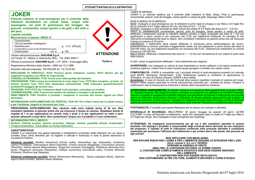 ETICHETTA/FOGLIO ILLUSTRATIVO CAMPI DI IMPIEGO JOKER è un erbicida selettivo per il controllo delle infestanti di Mais, Sorgo, Prati di graminacee (ornamentali, pascoli, prati da foraggio, campi sportivi e campi da golf), Asparago, Melo e Pero. JOKER Erbicida selettivo di post-emergenza per il controllo delle infestanti dicotiledoni nei cereali (mais, sorgo) nelle asparagiaie, nei prati di graminacee (da foraggio, da pascolo, ornamentali, campi sportivi e da golf) e del melo e del pero. Liquido solubile Meccanismo d’azione: HRAC O Composizione: 100 g di prodotto contengono: Dicamba puro g. 21,2 (230 g/l) (corrispondente a g 25,5 di sale dimetilamminico puro) Coformulanti q.b. a g. 100 Titolare dell'autorizzazione: DIACHEM S.p.A. Via Tonale 15 - Albano S. Alessandro (BG) – Tel. 0363 355611 Officina di produzione: DIACHEM S.p.A. - U.P. SIFA - Caravaggio (BG) ATTENZIONE Partita n. Registrazione Ministero della Sanità n. 9954 del 12.2.1999 Quantità netta del preparato: 100-250-500 ml; 1-5-10-20 litri INDICAZIONI DI PERICOLO: H319 Provoca grave irritazione oculare. H412 Nocivo per gli organismi acquatici con effetti di lunga durata. CONSIGLI DI PRUDENZA: P102 Tenere fuori dalla portata dei bambini. PREVENZIONE: P264 Lavare accuratamente le mani dopo l’uso. P270 Non mangiare, né bere, né fumare durante l'uso. P273 Non disperdere nell’ambiente. P280 Indossare guanti/indumenti protettivi/Proteggere gli occhi/il viso. REAZIONE: P337+P313 Se l’irritazione degli occhi persiste, consultare un medico. CONSERVAZIONE: P401 Conservare lontano da alimenti o mangimi e da bevande. SMALTIMENTO: P501 Smaltire il prodotto / recipiente in accordo alle norme vigenti sui rifiuti pericolosi. INFORMAZIONI SUPPLEMENTARI SUI PERICOLI: EUH 401 Per evitare rischi per la salute umana e per l'ambiente, seguire le istruzioni per l'uso. PRESCRIZIONI SUPPLEMENTARI: Non rientrare nelle zone trattate prima di 24 ore. Non immettere bestiame al pascolo prima che sia trascorso il tempo di carenza. Rispettare bande di rispetto di 1 m per applicazioni su cereali, mais e prati, 5 m per applicazioni su melo e pero quando adiacenti a corpi idrici. Non contaminare l’acqua con il prodotto o il suo contenitore. INFORMAZIONI PER IL MEDICO Sintomi: irritante oculare, spasmi muscolari, dispnea, cianosi, possibile atassia, bradicardia. Terapia sintomatica. Consultare un Centro Antiveleni. CARATTERISTICHE JOKER è un diserbante che agisce alterando il metabolismo enzimatico delle infestanti con cui viene a contatto. Esso viene assorbito per via fogliare e radicale e traslocato in tutta la pianta attraverso la circolazione linfatica. Infestanti sensibili: Abutilon theophrasti (Cencio molle), Amaranthus spp. (Amaranto), Centaurea cyanus (Fiordaliso), Chenopodium album (Farinello), Cirsium arvense (Stoppione), Convolvolus arvensis (Vilucchio), Galium aparine (Attaccamano), Polygonum aviculare (Correggila), Phytolacca decandra (Uva turca), Polygonum persicaria (Persicaria), Fallopia convolvolus (Convolvolo nero), Fumaria officinalis (Fumaria), Xanthium spp (Nappola). Infestanti mediamente sensibili: Datura Stramonium (Stramonio), , Sicyos angulatus (Sicio), Solanum nigrum (Erba morella), Stellaria media (Stellaria). DOSI E MODALITÀ DI IMPIEGO MAIS: impiegare in post-emergenza con le infestanti ai primi stadi di sviluppo e con Mais a 3-4 foglie fino ad un massimo di 6-7 foglie (altezza 40 cm), alla dose di 0,8 – 1,2 l/ha. SORGO: impiegare in post-emergenza della coltura allo stadio di 3-4 foglie alla dose di 0,7 - 0,8 l/ha. PRATI DI GRAMINACEE (ornamentali, pascoli, prati da foraggio, campi sportivi e campi da golf): effettuare il trattamento quando le infestanti abbiano almeno 2 foglie sviluppate alla dose di 1 l/ha per applicazioni a pieno campo e con soluzione allo 0,2% per trattamenti localizzati. Si consiglia di non intervenire immediatamente dopo lo sfalcio. Non immettere il bestiame al pascolo prima che sia trascorso il tempo di carenza di 20 giorni. ASPARAGO: il trattamento deve essere effettuato in primavera prima dell'emergenza dei turioni, preferibilmente su terreno sarchiato e leggermente umido, sia con trattamenti a pieno campo alla dose di 200-500 ml/ha, sia con trattamenti localizzati con soluzione allo 0,2%. Utilizzare per trattamenti un volume d’acqua di 100-500 l/ha. MELO-PERO: effettuare il trattamento alla dose di 1 - 1,5 l/ha con l'avvertenza di non colpire le parti verdi della coltura. In tutti i campi di applicazione effettuare 1 solo trattamento per stagione. AVVERTENZE: non impiegare su colture di mais trapiantate su terreni sabbiosi o con basso contenuto di sostanza organica, evitare che la nube irrorante possa giungere a contatto con colture vicine . COMPATIBILITÀ: JOKER è compatibile con i principali erbicidi di post-emergenza presenti sul mercato quali MCPA, Mecoprop, Pendimetalin, 2,4D, Solfoniluree qualora le condizioni di applicazione lo richiedano. In caso di miscele utilizzare JOKER a dosi ridotte. Avvertenza: in caso di miscela con altri formulati deve essere rispettato il periodo di carenza più lungo. Devono inoltre essere osservate le norme precauzionali prescritte per i prodotti più tossici. Qualora si verificassero casi di intossicazione informare il medico della miscelazione compiuta. AVVERTENZE AGRONOMICHE: Il prodotto contiene una sostanza attiva appartenente al gruppo HRAC O - Auxine sintetiche. Allo scopo di evitare o ritardare la comparsa e la diffusione di infestanti resistenti, inserire il prodotto in programmi di diserbo integrato che prevedano la miscela o l’alternanza con prodotti aventi un differente meccanismo d'azione e l’adozione di idonee pratiche agronomiche (ad esempio la rotazione colturale e la falsa semina). Impiegare su infestanti nei primi stadi di sviluppo al fine di eliminare quanto più precocemente possibile la competizione delle malerbe. Favorire la competitività della coltura.” FITOTOSSICITÀ: Il prodotto può essere fitotossico per le colture no