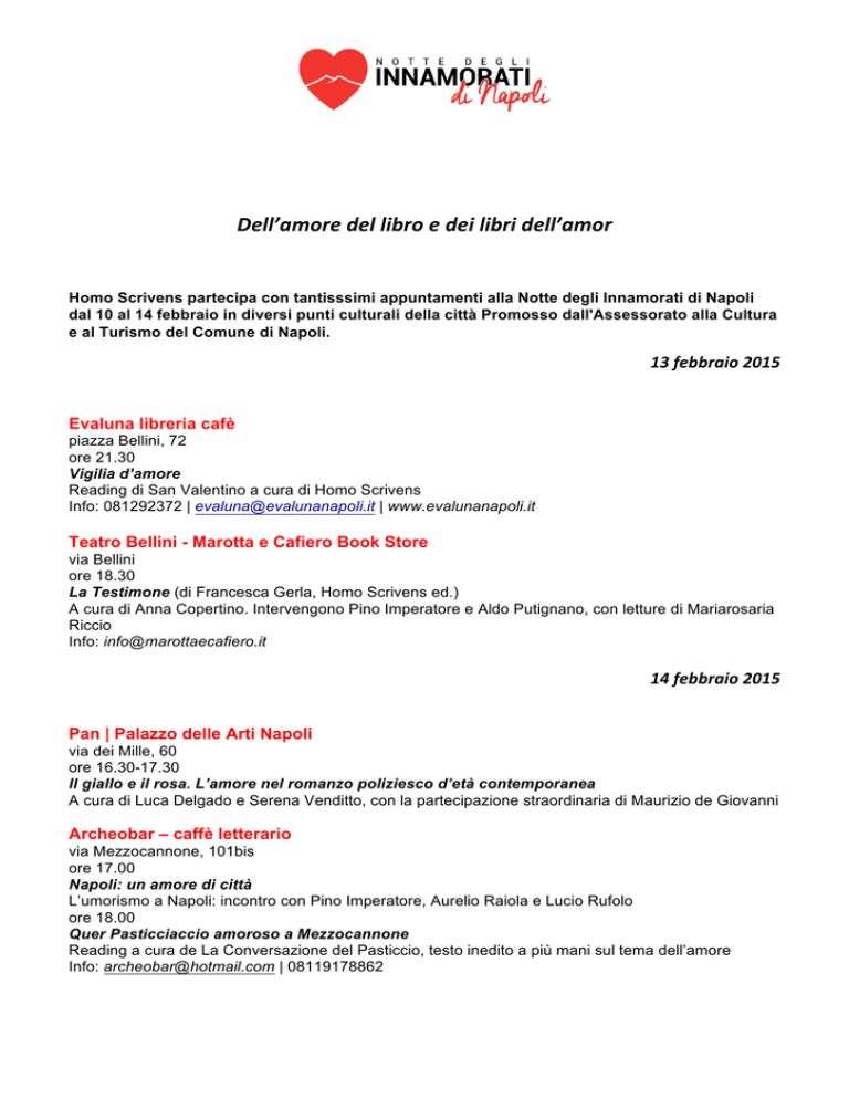 Dell’amore del libro e dei libri dell’amor Homo Scrivens partecipa con tantisssimi appuntamenti alla Notte degli Innamorati di Napoli dal 10 al 14 febbraio in diversi punti culturali della città Promosso dall'Assessorato alla Cultura e al Turismo del Comune di Napoli. 13 febbraio 2015 Evaluna libreria cafè piazza Bellini, 72 ore 21.30 Vigilia d’amore Reading di San Valentino a cura di Homo Scrivens Info: 081292372 | [email protected] | www.evalunanapoli.it Teatro Bellini - Marotta e Cafiero Book Store via Bellini ore 18.30 La Testimone (di Francesca Gerla, Homo Scrivens ed.) A cura di Anna Copertino. Intervengono Pino Imperatore e Aldo Putignano, con letture di Mariarosaria Riccio Info: [email protected] 14 febbraio 2015 Pan | Palazzo delle Arti Napoli via dei Mille, 60 ore 16.30-17.30 Il giallo e il rosa. L’amore nel romanzo poliziesco d’età contemporanea A cura di Luca Delgado e Serena Venditto, con la partecipazione straordinaria di Maurizio de Giovanni Archeobar – caffè letterario via Mezzocannone, 101bis ore 17.00 Napoli: un amore di città L’umorismo a Napoli: incontro con Pino Imperatore, Aurelio Raiola e Lucio Rufolo ore 18.00 Quer Pasticciaccio amoroso a Mezzocannone Reading a cura de La Conversazione del Pasticcio, testo inedito a più mani sul tema dell’amore Info: [email protected] | 08119178862 Biblioteca Annalisa Durante – Teatro Piazza Forcella via Vicaria vecchia ore 17-19 Manuale d’amore A cura di Gianluca Calvino, Gruppo 9, Paquito Catanzaro, Parole Alate, Pietro Damiano, Gabriele Aprea. Dialoghi e disavventure amorose, nanoracconti, speed date letterario, reading e laboratorio di recitazione Info: [email protected] | www.comune.napoli.it Evaluna libreria cafè piazza Bellini, 72 ore 18.30 Dibattito sull’Eros A cura di Francesca Gerla e Michele Serio Info: 081292372 | [email protected] | www.evalunanapoli.it Io ci sto – la libreria di tutti via Cimarosa, 20, Vomero ore 17.00-18.30 Amore e musica Enza Alfano, Annalisa Angelone e Rosaria de Cicco e Patricia Lopez, ci racconteranno, leggeranno, reciteranno il loro amore Info: 0815780421 | [email protected] Libreria Pisanti corso Umberto I, 38/40 ore 18 Musica e poesia Canzoni e poesie a cura di Lino Blandizzi e Giuseppina Dell’Aria. Info: [email protected] Libreria Scarlatti via Alessandro Scarlatti, 36 ore 17-19 Lettere d’amore raccolta di testi epistolari e letture pubbliche A cura di Nicoletta Iacapraro, Mariarosaria Riccio e Letizia Vicidomini Info: 081 19843923 | [email protected] Spazio Guida Editori via Bisignano, 11 ore 18.30 Dell’amore e altri tabù spettacolo a cura di Chiara Tortorelli, con Fabiana Esca, Rita Esposito, Daniele Galdiero Info: 081290768 | [email protected] Teatro Bellini - Marotta e Cafiero Book Store via Bellini ore 12.30-16.00 spazio per gli adulti, con brunch e lettura dei tarocchi di Chiara Tortorelli. Info: [email protected]
