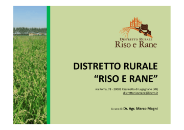 DISTRETTO RURALE “RISO E RANE” via Roma, 78 ‐ 20081 Cassinetta di Lugagnano (MI) [email protected] A cura di: Dr. Agr. Marco Magni Distretto rurale "Riso e rane" Il Distretto rurale "Riso e rane" nasce in un'area ben identificabile del territorio della Provincia di Milano il cui perimetro corre approssimativamente ad ovest lungo il percorso del fiume Ticino, a nord lungo la linea che collega i Comuni di Abbiategrasso e Cusago, ad est segue la tangenziale di Milano e l'Autostrada Milano ‐ Genova, a sud lungo il confine provinciale. I confini del Distretto Rurale "Riso e rane". Il Distretto comprende il territorio di 23 Comuni: Abbiategrasso, Albairate, Assago, Besate, Bubbiano, Buccinasco, Calvignasco, Cassinetta di Lugagnano, Cisliano, Cusago, Gaggiano, Gudo Visconti, Morimondo, Motta Visconti, Noviglio, Ozzero, Robecco sul Naviglio, Rosate, Trezzano sul Naviglio, Vermezzo, Vernate, Zelo Surrigone, Zibido San Giacomo. • Il Distretto si trova all’interno del Parco Lombardo della Valle del Ticino e Parco Agricolo Sud Milano. • La superficie complessiva del Distretto è di 30.513 ha, pari al 19,37% dell'intera Provincia di Milano • Comprende più del 60% delle superfici coltivate a riso della Provincia di Milano (Ente Nazionale Risi, 2009) • Il territorio del Distretto è costituito per l'80% della sua superficie da territorio agricolo Il Distretto rurale "Riso e rane" si colloca in un'area della Provincia di Milano all'interno della quale la coltivazione del riso è strettamente legata al territorio ed assume una importanza economica, storico ‐ culturale, paesaggistica ed ambientale di assoluta rilevanza. Obiettivi prioritari del Distretto rurale ”Riso e rane” Tutela e valorizzazione dell'ambiente in cui operano le aziende Valorizzazione del territorio come propulsore economico Valorizzazione dei principali aspetti del territorio: ambiente, fauna, storia, arte, cultura, gastronomia... Sviluppare l’immagine e la conoscenza del territorio del Distretto rurale “Riso e rane” in funzione della successiva commercializzazione di un prodotto riconoscibile e ad elevata qualità. Le superfici del Distretto: • Superficie complessiva coltivata dalle Aziende del Distretto = circa 4.500 ha Superficie media per Azienda = 72 ha • Superficie complessiva coltivata a riso = circa 3.600 ha Superficie media per Azienda = 57 ha • Produzione di risone stimata superiore alle 25.000 tonnellate La sede e l’ufficio del Consorzio Distretto Rurale “Riso e rane”, sito in una delle ville storiche di Cassinetta di Lugagnano (MI) in via Roma, 78. • L'impatto della coltivazione del riso sull'economia della zona è fondamentale, così come sul paesaggio agrario che contraddistingue il Distretto. • L'area in questione risulta molto omogenea dal punto di vista ambientale e colturale. • Non esisteva, se non attraverso alcune iniziative estemporanee e di breve durata, nessuna forma di collaborazione o struttura organizzativa fra le Aziende agricole esistenti. • Sussiste un atavico individualismo che ha sempre limitato o addirittura interdetto la possibilità di azioni comuni volte al raggiungimento di migliori strategie di mercato relative sia alla fase produttiva che alla fase di commercializzazione del prodotto. Il riconoscimento del Distretto Rurale Riso e Rane: ha permesso di dare credibilità ed ufficialità ad una ipotesi progettuale che pone, forse per la prima volta, le esigenze delle Aziende agricole in primo piano e che basa le proprie progettualità su richieste concrete evidenziate come necessità per il loro sviluppo e per lo sviluppo del territorio in cui sono ubicate. Dall’analisi SWOT elaborata nella relazione tecnica del progetto di accreditamento si è evidenziato che nel Distretto: "La completa assenza di forme di associazionismo e coordinamento produttivo, di nessuna forma di promozione del prodotto, accentuano il potere contrattuale dell'industria e non permettono adattamenti alle mutevoli condizioni dei mercati, soprattutto in relazione all'ingresso di competitori internazionali" In relazione a tali problematiche il Distretto rurale "Riso e rane" potrà, sicuramente, svolgere un ruolo importante, soprattutto in merito alla necessità di coesione fra le Aziende agricole per la definizione ed organizzazione di strategie di azioni comuni nei riguardi dei mercati. Vendita del prodotto Fine ultimo del Distretto rurale "Riso e rane" , è quello di arrivare, attraverso un processo in grado di mantenere ed incentivare le peculiarità del suo territorio alla vendita, di una parte del proprio riso in confezioni identificabili per il nome e per il logo del Distretto. Compito prioritario del Distretto sarà quello di caratterizzare il proprio prodotto al fine di arrivare ad una sua riconoscibilità, strettamente legata ad un territorio circoscritto e facilmente identificabile, ad alta valenza ambientale e culturale. Si prevede di valorizzare, varietà di riso fra le migliori: Carnaroli, Arborio, Roma, Baldo, Volano, S. Andrea, Vialone Nano varietà storiche, legate alle più tradizionali ricette gastronomiche italiane che vedono il riso come protagonista. Varietà la cui purezza ed identità sarà garantita e tracciata dal Distretto rurale "Riso e rane“ tramite il marchio DNA controllato. Partners esterni Il Distretto rurale "Riso e rane" si avvale della collaborazione di Partners esterni alla sua struttura: • Amministrazioni comunali dei 23 comuni facenti parte del distretto • Consorzio Parco Lombardo della Valle del Ticino • Parco Agricolo Sud Milano • Parco Tecnologico Padano • Riseria Cusaro S.r.l. • Riseria Giancarlo Leoni • Studio Agronomico Dr. Agr. Marco Magni • Agrifenino S.a.s. ‐ Lavorazioni agricole per conto terzi • Conca F.lli s.n.c. ‐ Lavorazioni agricole per conto terzi DNA Controllato: Il marchio “DNA Controllato” permette di certificare, mediante l’analisi del DNA, che il riso contenuto nella confezione corrisponde alla 