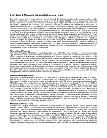 Il territorio di Mirandola dall'antichità a giorni nostri Dopo gli insediamenti etruschi, celtici e romani, attestati dai dati archeologici, dalla toponomastica e dalle tracce superstiti della centuriazione, per parlare di un vero e proprio distretto pubblico autonomo a Mirandola bisogna attendere i secoli XI-XII, quando il territorio figura organizzato attorno alla Corte e alla Pieve di Quarantoli. Possesso dei Canossa, che l'avevano ottenuto in enfiteusi dal Monastero di Nonantola, il territorio in questione nel 1115 fu affidato dalla contessa Matilde al suo vassallo Ugo, figlio di quel Manfredo che viene considerato il capostipite del gruppo parentale detto appunto dei "Figli di Manfredo". I membri di questo ampio consorzio famigliare, distinti nei rami dei Pio, dei Pico, dei Papazzoni, dei Pedoca, dei Padella e dei Del Fante, facevano parte di quella piccola aristocrazia terriera di estrazione longobarda che si era venuta rafforzando attraverso il servizio armato alle potenti casate dell'area padana e poi ai Comuni. I Pico, infatti, prima di fissarsi definitivamente a Mirandola, luogo di massima concentrazione dei loro patrimoni fondiari, cercano fortuna esercitando la carica di Podestà a Reggio e a Modena. Nel 1154 Pico, nipote di Ugo e capostipite dei signori della Mirandola, è podestà a Reggio; nel 1188 suo figlio Manfredino è podestà a Modena. Ancora agli inizi del Trecento, Francesco Pico figura esercitare la carica di podestà a Modena: è anzi in questo modo che egli diventa potente e nel 1311, per i servizi da lui prestati nella guerra contro gli Estensi, l'Imperatore Enrico VII di Lussemburgo gli assegna in feudo le corti di Quarantoli e San Possidonio, escludendone gli altri rami del gruppo consortile. Mirandola nel Trecento Agli inizi del Trecento, Mirandola si presenta già come un castello ben fortificato, da cui il nome che significa appunto "piccola postazione di vedetta". Data la sua posizione al confine tra la corte di Quarantoli e la corte di San Possidonio, diventa ben presto la residenza della famiglia signorile e il capoluogo del territorio. Si dà mano allora a tutta una serie di operazioni tendenti a fornire alla signoria forza, autonomia e prestigio. Nel 1353 Paolo Pico ottiene dal vescovo di Reggio il feudo di San Martino Spino, mentre l'anno successivo Carlo IV di Boemia stacca il territorio dei Pico dalla soggezione a Reggio e lo dichiara immediatamente soggetto all'Impero. Nel 1386 si provvede a raccogliere le consuetudini e le leggi in un corpo unitario (gli Statuti), dando così organicità alla vita istituzionale, sociale ed economica della zona. Sempre nella seconda metà del Trecento sorge Concordia a controllo del confine mantovano e dei mulini natanti costruiti dai Pico sul Secchia. Nello stesso periodo, il giureconsulto carpigiano Ingrano Bratti scrive la cronaca della famiglia, assegnandole antiche quanto fantasiose ascendenze imperiali. Mirandola nel Quattrocento Nel corso del Quattrocento si assiste ad un forte sviluppo urbanistico e monumentale dell'antico borgo. Già verso la fine del Trecento, per interessamento di Costanza Pico, viene eretta la chiesa di San Francesco, in sostituzione di quella piccola di fine Duecento. Nel 1432 si ha la fondazione dell'ospedale di S. Maria Bianca ad opera della Confraternita della Misericordia, detta anche dei Battuti. Fra il 1440 e il 1470 si dà mano al Duomo; nel 1460 viene fondato il monastero di S. Ludovico e nel 1467 i Pico ottengono da papa Paolo II l'istituzione della Collegiata; nel 1468 si inizia la costruzione del Palazzo del Comune. Nel 1485 viene istituito il Desco dei Poveri e nel 1495 il Monte di Pietà. E' questo il momento in cui a Mirandola e dintorni si diffonde il sistema della piantata, si assiste alla diffusione del contratto di soccida e si favorisce l'immigrazione di personale specializzato nell'allevamento, proveniente soprattutto dal bergamasco, al punto tale che da allora gli allevatori-casari verranno chiamati "bergamini". In due settore dell'allevamento si ebbe un notevole incremento: da un lato la produzione di lana di medio e basso costo che si diffuse in numerose piazze dell'Italia settentrionale; dall'altro, la selezione di cavalli di razza ad opera dei Pico e di altre famiglie notabili, che vendevano i singoli capi a prezzi molto alti. Mirandola nel Cinquecento Accanto allo sviluppo economico, urbanistico e monumentale si registra anche l'ascesa politica della famiglia, tant'è che nel 1432 Giovanni Pico ottiene dall'Imperatore Sigismondo di Lussemburgo il titolo di Conte della Concordia. Restavano però notevoli difficoltà per quanto riguardava la successione, nonostante alcuni diplomi imperiali avessero imposto quella per maggiorasco, per cui, fra la fine del Quattrocento e tutta la prima metà del Cinquecento, tra i rami della famiglia si ebbero contrasti e liti. Ciò portò ai due celebri assedi che Mirandola dovette subire, prima nell'inverno 1510 e 1511 da parte delle truppe di papa Giulio II e poi tra il luglio 1551 e il maggio 1552 ad opera delle truppe di Giulio III. In questa fase Mirandola fu prevalentemente alleata della Francia, ciò che accrebbe ulteriormente la sua fama e le sue opportunità commerciali. Gli scontri militari di questo periodo furono anche all'origine della trasformazione dell'antico borgo a pianta quadrangolare nella nuova città fortezza a forma stellare: parallelamente l'antica fortezza dei Pico si andava ingrandendo, trasformandosi in una reggia, dove trovavano sede gli appartamenti del signore, i magazzini, le sale di rappresentanza, le quadrerie, i luoghi di devozione, gli appartamenti dei soldati: tutti all'interno di possenti mura e del grande fossato alimentato dal canale della Smirra, che prendeva l'acqua dal Secchia. Mirandola tra Seicento e Ottocento Nel 1597, ritornata all'obbedienza imperiale, Mirandola riceve il titolo di città e i Pico sono nominati principi della Mirandola e Marchesi della Concordia. Nel 1617 Alessandr