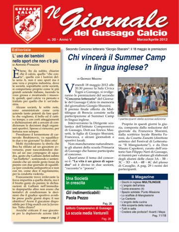 n. 20 • Anno V Secondo Concorso letterario “Giorgio Sbaraini”: il 18 maggio le premiazioni Editoriale L’ uso dei bambini nello sport che non c’è più di Marzo/Aprile 2012 Adriano Franzoni È bene, fin da subito, chiarire che il calcio, quello “che conta”, quello con i lustrini della seria A, non è uno sport ma è una vera e propria industria, dove le società, soprattutto certe società, si comportano proprio come le più grandi aziende italiane, facendo la voce grossa e mostrando i muscoli; quindi, quel calcio va pensato e trattato per quello che è: un’industria. Alcune società, le solite note, sono amministrate come certe aziende tanto potenti da fare quello che vogliono, il bello ed il cattivo tempo, e con certi atteggiamenti e dichiarazioni atti a cercare di condizionare le decisioni degli organismi sportivi. Spesso ci riescono, per fortuna non sempre. Prendiamo il tormentone di carnevale: Ibrahimovic, va squalificato due o tre giornate? Io direi otto! Molti ricorderanno la sberla che Ibra ha rifilato ad un giocatore avversario, pure nascondendosi dietro ad un suo compagno di squadra, gesto che Galliani definì subito “un buffetto”, sostenendo e sentenziando che un simile gesto fosse da punire con due giornate di squalifica (per condotta antisportiva) e non con tre, come dice il regolamento, per la condotta violenta. Francamente trovo irrilevante la forza impartita a quella sberla, ma è il brutto gesto da punire; le dichiarazioni di Galliani nell’immediato dopopartita altro non erano che tentativi di condizionare le decisioni che il giudice sportivo avrebbe preso pochi giorni dopo; il suo obiettivo? Avere il giocatore disponibile per il big-match con la Juventus. Tutto chiaro? Anziché criticare il suo giocatore per la deplorevole azione (delsegue a pag. 2 Chi vincerà il Summer Camp in lingua inglese? V di Giorgio Mazzini enerdì 18 maggio 2012 alle 20.30 presso la Sala Civica Togni a Gussago, si svolgeranno le premiazioni del secondo “Concorso letterario” del Giornale del Gussago Calcio in memoria del giornalista Giorgio Sbaraini. Il premio finale offerto da Multilingue di Brescia consiste nella partecipazione al Summer Camp in lingua inglese. Interverranno la Dirigente scolastica dell’Istituto Comprensivo di Gussago, Dott.ssa Enrica Massetti, la figlia di Giorgio Sbaraini, Francesca, e alcuni giornalisti e sportivi locali. Non mancheranno naturalmente gli alunni della scuola Primaria di Gussago che hanno partecipato al concorso. Quest’anno il tema del concorso è: “La vita è un gioco di squadra” ed è diviso in due sezioni, “racconto”e “poesia”. Gli indimenticabili: Paola Pezzo Proprio in questi giorni la giuria, composta dalla redazione del giornale da Francesca Sbaraini, dalla scrittrice locale Rinetta Faroni, da Cosetta Zanotti (direttore artistico del Festival di Letteratura “Il Mangiastorie”), e da Don Mauro Capoferri, curato dell’oratorio San Filippo Neri di Gussago, si riunirà per valutare gli elaborati degli alunni delle classi 3A - 3B 3C - 3D - 4A - 4B - 4C del plesso di Casaglio. A pag. 29 i nomi dei partecipanti. Il Magazine Una Società in crescita I partecipanti della scorsa edizione Pag. 3 Pag. 26 Istituto Comprensivo di Gussago: La scuola media Venturelli Pag. 28 • Giochi in inglese MULTILINGUE • L’angolo dell’artista • Come eravamo (4) • Spazio solidale: Punto Missione • Lo scaffale di Mangiastorie • Le Cantorie • L’angolo della cucina • Alla scoperta della natura • Tutti in sella • Credere alle profezie? Avanti i Maya Pag. 11/18 Il Giornale del Gussago Calcio L’ uso dei bambini nello sport che non c’è più (segue da pag. 1) 2 SOMMARIO • Editoriale pag. 1 • Chi vincerà il Summer Camp pag. 1 • Una Società in crescita pag. 3 • L’apostrofo pag. 3 • Appuntamenti Gussago Calcio pag. 4 • Gussago Calcio e Cesar Onlus pag. 5 • Scuola Calcio e Pulcini pag. 6 • Esordienti pag. 7 • Speciale Giovanissimi pag. 8 • Allievi pag. 9 • Inserto MAGAZINE pag. 11 • Juniores pag. 19 • Promozione pag. 20 • U.K. news pag. 24 • Io e lo sport - Flavio Emer pag. 21 • Lettere al Direttore pag. 22 • Uno psicologo per amico pag. 23 • Conosciamoli meglio pag. 24 • Gli indimenticabili pag. 26• • Scuola Media Venturelli pag. 28 • I partecipanti al Concorso letterariopag. 29 n. 20 - Anno V - Marzo/Aprile Copia gratuita Direttore responsabile: Adriano Franzoni Coordinamento editoriale e grafica: Giorgio Mazzini Segreteria di Redazione: Pierangela Franzoni Redazione: Corrado Belzani, Gianfranco Spini, Francesco Montini, Pierangelo Rodella Laura Righetti, Hillary Kobia Ngaine Collaborano a questo numero: Gianluca Cominassi, Rinetta Faroni, Cosetta Zanotti, Marco Fredi, Sergio Peli, Adriano Piacentini, Nicola Mazzini, Sergio Valentino,Erwin Bllaca Iscrizione del Tribunale di Brescia n. 49/2008 Chiuso in redazione il 26/03/2012 Stampa: Centro Stampa Eurocolor - Rovato (Bs) sede: A.S.D. GUSSAGO CALCIO Via Bevilacqua, 42/D - 25064 Gussago (BS) Tel-Fax: 0302774642 La sede è aperta a tutti il lunedì dalle ore 20.00 alle 22.00 e-mail: [email protected] www.gussagocalcio.it la quale è plurirecidivo) e di prendere provvedimenti, lo difende, definendo “un buffetto” quel gestaccio, minimizzando il grave fatto: calpestando il buonsenso ed in barba alla decenza, cerca di fare l’interesse della sua azienda. Il proprio interesse innanzitutto; e a scapito di tutto! E chissà quanto piacere proverebbe se i suoi colleghi avversari lo salutassero prendendolo… a buffetti… Per la cronaca, il tentativo di condizionare il giudice sportivo è fallito: Ibra ha scontato tre giornate di squalifica; nell’Italia degli inchini, stavolta…niente inchino! Poco prima del “buffetto” di Ibra, un altro poco edificante esempio: Conte, allenatore della Juventus, che lamentava a gran voce la mancata concessione di un calcio di rigore ben evidente, “dimenticando” che nella partita prec