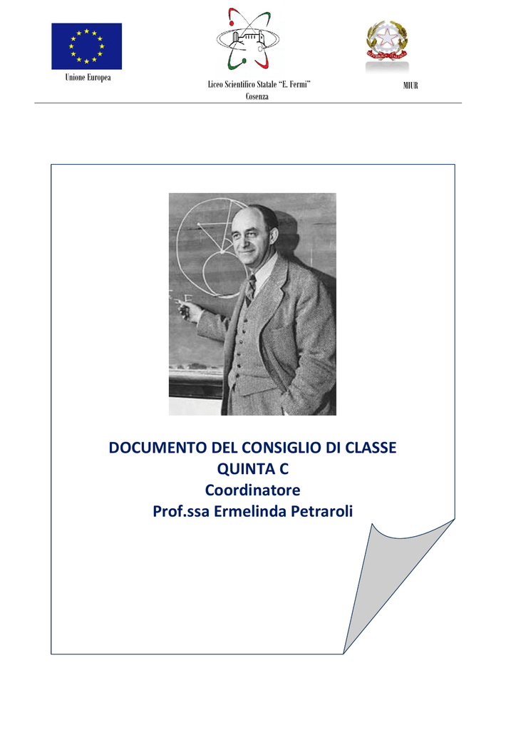 Unione Europea Liceo Scientifico Statale “E. Fermi” Cosenza DOCUMENTO DEL CONSIGLIO DI CLASSE QUINTA C Coordinatore Prof.ssa Ermelinda Petraroli MIUR Indice Presentazione dell’Istituto Profilo di Indirizzo e quadro orarioStoria della classe nel triennio -Elenco alunni Docenti della classe nel corso del triennio Relazione finale del CdC Obiettivi raggiunti ed azione formativa Criteri e strumenti di valutazione Attivita curriculari ed extracurriculari Preparazione alle prove scritte ed al colloquio Allegati Scheda disciplinare di Lingua e Letteratura Italiana Scheda disciplinare di Lingua e Letteratura Latina Scheda disciplinare di Storia Scheda disciplinare di Filosofia Scheda disciplinare di Lingua e Letteratura Inglese Scheda disciplinare di Scienze Naturali Scheda disciplinare di Matematica Scheda disciplinare di Fisica Scheda disciplinare di Disegno e Storia dell’Arte Scheda disciplinare di Scienze Motorie Scheda disciplinare di Religione Griglia valutazione per l’attribuzione del voto di condotta Griglia di Osservazione per la Valutazione delle performances degli studenti Tabella attribuzione credito scolastico Studes Griglia valutazione verifiche orali Griglia di valutazione I prova scritta di Italiano (Tipologia A) Griglia di valutazione I prova scritta di Italiano (Tipologia B ) Griglia di valutazione I prova scritta di Italiano (Tipologia C e D) Griglia di valutazione prova scritta Matematica Griglia di valutazione simulazione II prova scritta (Fisica) Griglia di Valutazione III prova (Tipologia B+C) Griglia di valutazione del Colloquio Prima simulazione III prova Tipologia B+C Seconda simulazione III prova Tipologia B+C Simulazione di Matematica Simulazione di Fisica Composizione del Consiglio di Classe Pag. Pag. Pag. Pag. Pag. Pag. Pag. Pag. Pag. Pag. Pag. Pag. Pag. Pag. Pag. Pag. Pag. Pag. Pag. Pag. Pag. 2 3 4 5 6 8 9 11 12 13 14 16 17 18 20 21 22 24 25 27 28 Pag Pag. Pag. Pag. Pag. Pag. Pag. Pag. Pag. Pag. Pag. Pag. Pag. Pag. Pag. 29 30 31 32 33 34 35 39 43 45 46 52 58 63 71 1 Presentazione dell’Istituto Il Liceo Scientifico “ E. Fermi” è posto in un punto strategico della città di Cosenza, ovvero in pieno centro e a pochi passi dalla piazza delle autolinee, dove tutte le mattine convergono moltissimi giovani provenienti dall’hinterland cosentino. La sua posizione, quindi, lo rende facilmente raggiungibile. Esso offre il suo servizio agli studenti e alle famiglie di un ampio territorio, oltre il Comune e oltre la stessa Provincia di Cosenza. Per utenza è uno dei più grandi di tutta la nostra regione, tanto che un unico edificio non è bastato a contenere tutti gli alunni iscritti che, nell’anno scorso in corso risultano essere 1225 di cui 608 maschi e 617 femmine. Dal 2002 l’edificio di Via Molinella è stato affiancato da quello di via Isnardi, precedentemente sede della Scuola Media “Anile”. È dall’anno scolastico 2010/2011 che il Liceo usufruisce anche di altri locali, ultimamente ristrutturati, presso il palazzo Marraffa posto tra via Molinella e via Isnardi. Il complesso scolastico è completamente cablato con un ponte radio tra i due Istituti principali; c’è 1 laboratorio linguistico multimediale, 2 laboratori di informatica con LIM, 1 laboratorio di fisica, 1 laboratorio di chimica, 2 aule docenti dotate di postazioni multimediali, 1 Aula Magna attrezzata con schermo motorizzato, video proiettore a soffitto, microfoni con mixer e telecamere per sistema di videoconferenza, e una palestra che è stata ristrutturata nel 2008. Gli uffici amministrativi sono diretti dal dott. Fulvio Furgiuele, coadiuvato da 9 assistenti amministrativi. Questa scuola, inoltre, si avvale anche dell’indispensabile contributodi4assistenti tecnici e di 11 collaboratori scolastici. Grazie all’approvazione del progetto Agenda Digitale è stato possibile affiancare alle strutture già esistenti, nuove tecnologie delle ultime generazione; nello specifico circa 40 aule sono state dotate di lavagne interattive multimediali multitouch 77’’ complete di videoproiettori e cattedre docenti con PC integrato. Sono stati creati, dunque, ambienti multifunzionali e versatili attrezzati per la fruizione di qualsivoglia contenuto digitale condivisibile anche attraverso la rete fissa e Wi-Fi disponibile nella scuola. Importante, inoltre, l’uso del registro elettronico con gestione delle assenze e delle giustificazioni per un’efficiente sinergia scuola-famiglia e una maggiore affidabilità e rapidità nelle operazioni ordinarie e in quelle di scrutinio con conseguenti facilitazioni nella creazione delle pagelle elettroniche. 2 Profilo d’indirizzo della classe V C Ore settimanali per anni di corso Discipline del piano di studi 1° 2° 3° 4° 5° Lingua e letteratura italiana 4 4 4 4 4 Lingua e cultura latina 3 3 3 3 3 3 3 3 3 3 3 3 Storia 2 2 2 Filosofia 3 3 3 Lingua e cultura straniera inglese Storia e Geografia Matematica * 5 5 4 4 4 Fisica 2 2 3 3 3 Scienze naturali** 2 2 3 3 3 Disegno e storia dell’arte 2 2 2 2 2 Scienze motorie e sportive 2 2 2 2 2 Religione cattolica o Attività alternativa 1 1 1 1 1 Totale ore 27 27 30 30 30 * con Informatica al primo biennio ** Biologia, Chimica, Scienze della Terra Quest’anno è stato introdotto il Potenziamento Giuridico-Economico esteso alle Classi del Triennio. 3 Storia della classe Anno Scol.ast ico 13/ 14 14/15 15/16 Class e n° Alunni Tot Maschi Femm. 11 8 8 11 12 12 III IV V 22 20 20 Provenienza da Cs fuori Cs 12 12 12 10 8 8 Promo ssi 14 20 // Non promo ssi 1 0 // Trasferiti 1 // // Totale fine anno Con debito Senza Debito 4 4 // 18 16 // Elenco alunni N°. COGNOME 1 ALOE 2 BARBUTO 3 BARTOLOTTA FEDERICA 4 CHILELLI MATTEO 5 DE LUCA GRETA 6 FORTE GIADA 7 GAGLIARDI CHIARA 8 GALLO ANDREA 9 GODINO CHIARA 10 GRECO EVA 11 GUARNIERI ELISABETTA 12 MARTINO LUCIA 13 MAZZA PIETRO 14 MICIELI ALESSANDRO 15 PINGITORE VANESSA 16 SANGIOVANNI MARIO ANDREA 17 SPADAFORA CHRISTIAN 18 SPADAFORA MATTIA 19 SPADAFORA TERESA 20 VENTURA S