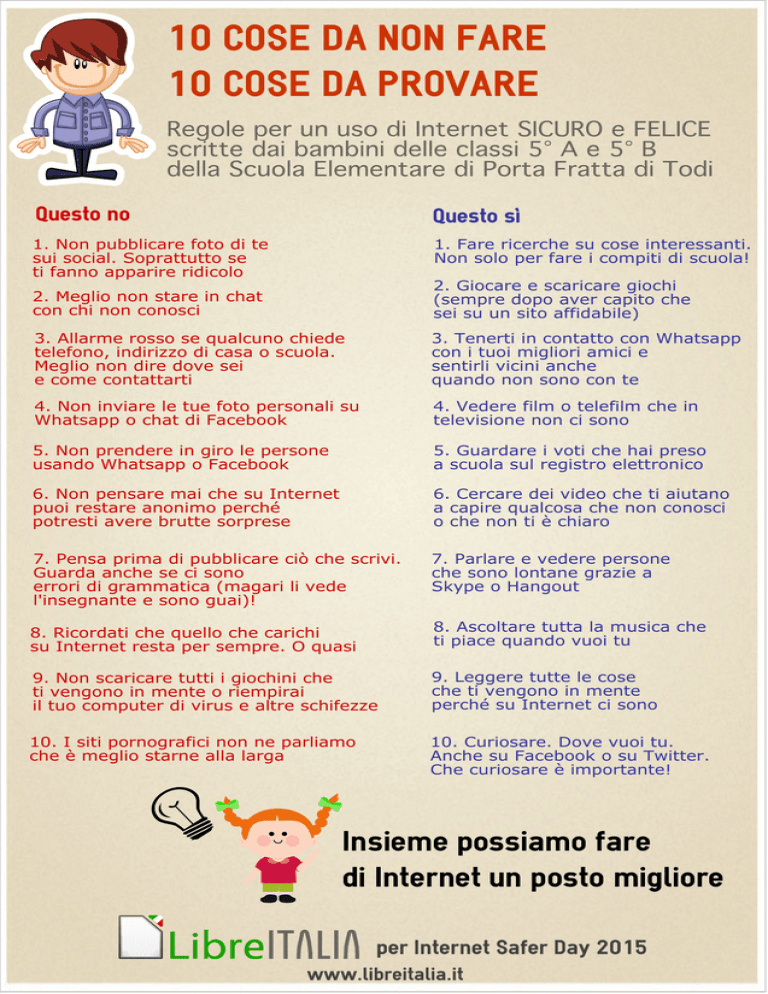 10 COSE DA NON FARE 10 COSE DA PROVARE Questo no Questo sì 1. Non pubblicare foto di te sui social. Soprattutto se ti fanno apparire ridicolo 1. Fare ricerche su cose interessanti. Non solo per fare i compiti di scuola! 2. Meglio non stare in chat con chi non conosci 2. Giocare e scaricare giochi (sempre dopo aver capito che sei su un sito affidabile) 3. Allarme rosso se qualcuno chiede telefono, indirizzo di casa o scuola. Meglio non dire dove sei e come contattarti 3. Tenerti in contatto con Whatsapp con i tuoi migliori amici e sentirli vicini anche quando non sono con te 4. Non inviare le tue foto personali su Whatsapp o chat di Facebook 4. Vedere film o telefilm che in televisione non ci sono 5. Non prendere in giro le persone usando Whatsapp o Facebook 5. Guardare i voti che hai preso a scuola sul registro elettronico 6. Non pensare mai che su Internet puoi restare anonimo perché potresti avere brutte sorprese 6. Cercare dei video che ti aiutano a capire qualcosa che non conosci o che non ti è chiaro 7. Pensa prima di pubblicare ciò che scrivi. Guarda anche se ci sono errori di grammatica (magari li vede l'insegnante e sono guai)! 7. Parlare e vedere persone che sono lontane grazie a Skype o Hangout 8. Ricordati che quello che carichi su Internet resta per sempre. O quasi 8. Ascoltare tutta la musica che ti piace quando vuoi tu 9. Non scaricare tutti i giochini che ti vengono in mente o riempirai il tuo computer di virus e altre schifezze 9. Leggere tutte le cose che ti vengono in mente perché su Internet ci sono 10. I siti pornografici non ne parliamo che è meglio starne alla larga 10. Curiosare. Dove vuoi tu. Anche su Facebook o su Twitter. Che curiosare è importante! Insieme possiamo fare di Internet un posto migliore per Internet Safer Day 2015 www.libreitalia.it