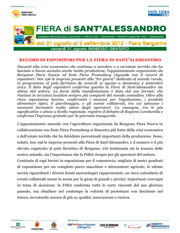 RECORD DI ESPOSITORI PER LA FIERA DI SANT’ALESSANDRO Davanti alla crisi economica che continua a mordere e a un’estate torrida che ha lasciato a bocca asciutta anche molta produzione, l’appuntamento organizzato da Bergamo Fiera Nuova ed Ente Fiera Promoberg risponde con il record di espositori: ben 196 le imprese presenti alla “tre giorni” dedicata al mondo rurale, in programma al polo fieristico da venerdì 31 agosto a domenica 2 settembre 2012. Il dato degli espositori conferma quanto la Fiera di Sant’Alessandro sia attesa dal settore. La forza della manifestazione è data dal suo format, che riunisce in un’unica location sempre più comparti del mondo contadino. Oltre alla ricca esposizione bovina, confermati i successi per l’equitazione, i prodotti alimentari tipici, il giardinaggio, e gli eventi collaterali, tra cui spiccano i momenti formativi molto attesi dagli operatori. La rassegna, tra le più significative e attese a livello regionale, registra il debutto di Regione Lombardia e conferma l’ingresso gratuito per la giornata inaugurale. L’appuntamento annuale con l’agricoltura organizzata da Bergamo Fiera Nuova in collaborazione con Ente Fiera Promoberg si dimostra più forte della crisi economica e dell’estate torrida che ha falcidiato percentuali importanti della produzione. Sono, infatti, ben 196 le imprese presenti alla Fiera di Sant’Alessandro, e il numero è il più elevato registrato al polo fieristico di Bergamo. Ciò testimonia sia la tenacia delle nostre aziende, sia l’importanza che la FdSA ricopre per gli operatori del settore. Centinaia di capi bovini in esposizione per il commercio; migliaia di metri quadrati di esposizione per un completo parco macchine e attrezzature agricole; le ultime novità riguardanti i diversi fronti merceologici rappresentati; un ricco calendario di eventi collaterali messi in scena per la gioia di grandi e piccini; importanti convegni in tema di sicurezza: la FdSA conferma tutte le carte vincenti del suo glorioso passato, ma ribadisce nel contempo la volontà di proiettarsi con decisione nel futuro, investendo ancora di più su qualità, innovazione e ricerca. I PRINCIPALI NUMERI DELLA FdSA2012 196 espositori, 48.300 metri quadrati di superficie, circa 170 cavalli coinvolti in gare ed esibizioni, circa 300 pregiati capi di bestiame per il commercio, 16 regioni rappresentate, 162 espositori lombardi, dei quali 133 della provincia di Bergamo. Le altre regioni con il maggior numero di espositori sono il Veneto e la Puglia (7 cadauna), seguite dal Piemonte (5), e Emilia Romagna (3). I settori merceologici maggiormente rappresentati sono i “Prodotti tipici e agro-alimentari” (65 aziende), e le “Macchine agricole e attrezzature” (55 aziende). Seguono: Equitazione, Zootecnia, Risparmio energetico ed energie rinnovabili. DEBUTTO DI REGIONE LOMBARDIA Tra le novità più significative, il debutto con un proprio spazio di Regione Lombardia. Una presenza voluta dall’assessore regionale all’Agricoltura, Giulio De Capitani, che dopo aver inaugurato e visitato la scorsa edizione della FdSA, ha confermato con i fatti quanto ritenga importante l’evento di Bergamo per tutti gli operatori del settore. ALLA FdSA “OBIETTIVO SICUREZZA”: convegni e area tecnica Oltre alla ricca parte espositiva, la FdSA presenta diverse iniziative in tema di sicurezza nel settore agricolo. Tra gli argomenti affrontati in tal senso, anche quello sui trattori circolanti, per i quali recenti stime ne indicano in circa la metà quelli non a norma. Per fare chiarezza scenderà in campo, in collaborazione con Bergamo Fiera Nuova e Promoberg, un pool formato da Regione Lombardia, Inail, Asl Bergamo, Provincia di Bergamo, Coldiretti Bg, Confagricoltura Bg, Confederazione Italiana Agricoltori Alta Lombardia, Unione Professionisti Agri Garden, e associazione Bergamasca Imprese Agromeccaniche. Prevista per l’intera durata della manifestazione un’esposizione dei macchinari agricoli nei tre diversi stadi: quelli “non a norma”, quelli “messi a norma”, e, infine i “nuovi di fabbrica”, in modo da identificare le varie fasi di sicurezza. Inoltre, incontri di approfondimento con personale qualificato. Gli workshop si svolgeranno nell’area eventi del padiglione B, nei seguenti orari: Venerdì 31 agosto e sabato 1 settembre: ore 11,00 e ore 16,00. Domenica 2 settembre: ore 11. In “linea” con la sicurezza anche il convegno tecnico organizzato da ALV (Associazione Linea Vita - www.lineavita.org) e dalla casa editrice EmmeV. L’appuntamento (sala Caravaggio - Centro Congressi Fiera, ingresso gratuito e libero a tutti), è fissato per il 31 agosto, alle ore 14,30 presso la sala Caravaggio Centro Congressi Fiera, e verterà sui seguenti argomenti: prevenzione contro le cadute dall’alto, formazione nei lavori forestali, normative sull’utilizzo delle piattaforme, sicurezza macchine agricole. TUTELA AMBIENTALE, INNOVAZIONI TECNOLOGICHE E DI SERVIZI. Il grande successo della Fiera di Sant’Alessandro nasce dal suo essere sempre stata al passo con i tempi, non limitandosi a presentare le grandi tradizioni del passato. Negli anni, infatti, oltre alle numerose novità di ogni genere presentate a ogni edizione, alla FdSA sono subentrati sempre con più forza nuovi temi, quali, ad esempio, quelli riguardanti i servizi e la tutela ambientale, le innovazioni tecnologiche, le novità in tema sia dei macchinari, sia dei servizi. Da sottolineare anche il grande spazio dato nelle ultime edizioni all’importante comparto equestre: un’ulteriore opportunità per gli operatori della nostra provincia che detiene il maggior numero di cavalli in Lombardia. La FdSA ospita quest’anno per la prima volta un allevatore di suini, un altro importante segmento del settore che cerca il riscatto. MIGLIOR CARNE BOVINA BERGAMASCA Concorso per la miglior carne bovina di filiera bergamasca (domenica 2 settembre). L’iniziativa sviluppata da Ascom, in collabora