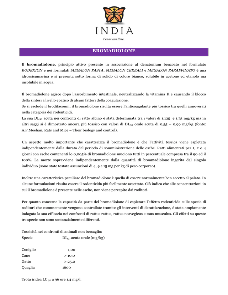 BROMADIOLONE Il bromadiolone, principio attivo presente in associazione al denatonium benzoato nel formulato RODEXION e nei formulati MEGALON PASTA, MEGALON CEREALI e MEGALON PARAFFINATO è una idrossicumarina e si presenta sotto forma di solido di colore bianco, solubile in acetone ed etanolo ma insolubile in acqua. Il bromadiolone agisce dopo l’assorbimento intestinale, neutralizzando la vitamina K e causando il blocco della sintesi a livello epatico di alcuni fattori della coagulazione. Se si esclude il brodifacoum, il bromadiolone risulta essere l’anticoagulante più tossico tra quelli annoverati nella categoria dei rodenticidi. La sua DL50 acuta nei confronti di ratto albino è stata determinata tra i valori di 1,125 e 1,75 mg/kg ma in altri saggi si è dimostrato ancora più tossico con valori di DL 50 orale acuta di 0,55 – 0,99 mg/kg (fonte: A.P.Meehan, Rats and Mice – Their biology and control). Un aspetto molto importante che caratterizza il bromadiolone è che l’attività tossica viene espletata indipendentemente dalla durata del periodo di somministrazione delle esche. Ratti alimentati per 1, 2 o 4 giorni con esche contenenti lo 0,005% di bromadiolone muoiono tutti in percentuale compresa tra il 90 ed il 100%. La morte sopravviene indipendentemente dalla quantità di broamadiolone ingerita dal singolo individuo (sono state testate assunzioni di 4, 9 e 15 mg per kg di peso corporeo). Inoltre una caratteristica peculiare del bromadiolone è quella di essere normalmente ben accetto al palato. In alcune formulazioni risulta essere il rodenticida più facilmente accettato. Ciò indica che alle concentrazioni in cui il bromadiolone è presente nelle esche, non viene percepito dai roditori. Per quanto concerne la capacità da parte del bromadiolone di espletare l’effetto rodenticida sulle specie di roditori che comunemente vengono controllate tramite gli interventi di derattizzazione, è stata ampiamente indagata la sua efficacia nei confronti di rattus rattus, rattus norvegicus e mus musculus. Gli effetti su queste tre specie non sono sostanzialmente differenti. Tossicità nei confronti di animali non bersaglio: Specie Coniglio DL50 acuta orale (mg/kg) 1,00 Cane > 10,0 Gatto > 25,0 Quaglia 1600 Trota iridea LC 50 a 96 ore 1,4 mg/l.