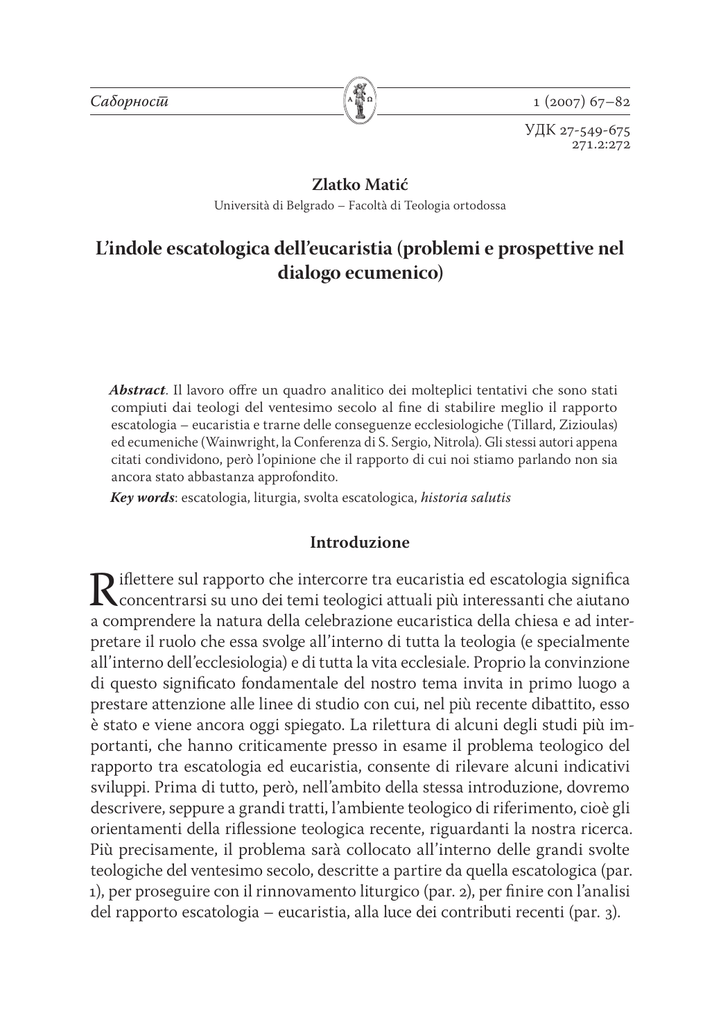Саорнос Α Ω 1 (2007) 67–82 УК 27-549-675 271.2:272 Zlatko Matić Università di Belgrado – Facoltà di Teologia ortodossa L’indole escatologica dell’eucaristia (problemi e prospettive nel dialogo ecumenico) Abstract. Il lavoro offre un quadro analitico dei molteplici tentativi che sono stati compiuti dai teologi del ventesimo secolo al fine di stabilire meglio il rapporto escatologia – eucaristia e trarne delle conseguenze ecclesiologiche (Tillard, Zizioulas) ed ecumeniche (Wainwright, la Conferenza di S. Sergio, Nitrola). Gli stessi autori appena citati condividono, però l’opinione che il rapporto di cui noi stiamo parlando non sia ancora stato abbastanza approfondito. Key words: escatologia, liturgia, svolta escatologica, historia salutis Introduzione R iflettere sul rapporto che intercorre tra eucaristia ed escatologia significa concentrarsi su uno dei temi teologici attuali più interessanti che aiutano a comprendere la natura della celebrazione eucaristica della chiesa e ad interpretare il ruolo che essa svolge all’interno di tutta la teologia (e specialmente all’interno dell’ecclesiologia) e di tutta la vita ecclesiale. Proprio la convinzione di questo significato fondamentale del nostro tema invita in primo luogo a prestare attenzione alle linee di studio con cui, nel più recente dibattito, esso è stato e viene ancora oggi spiegato. La rilettura di alcuni degli studi più importanti, che hanno criticamente presso in esame il problema teologico del rapporto tra escatologia ed eucaristia, consente di rilevare alcuni indicativi sviluppi. Prima di tutto, però, nell’ambito della stessa introduzione, dovremo descrivere, seppure a grandi tratti, l’ambiente teologico di riferimento, cioè gli orientamenti della riflessione teologica recente, riguardanti la nostra ricerca. Più precisamente, il problema sarà collocato all’interno delle grandi svolte teologiche del ventesimo secolo, descritte a partire da quella escatologica (par. 1), per proseguire con il rinnovamento liturgico (par. 2), per finire con l’analisi del rapporto escatologia – eucaristia, alla luce dei contributi recenti (par. 3). 68|L’indole escatologica dell’eucaristia (problemi e prospettive nel dialogo ecumenico)-------------- 1. La riscoperta dell’escatologia nella teologia contemporanea L’escatologia è, senza dubbio, la questione che ha assunto la preminenza nella teologia del ventesimo secolo, diventando così “il segno dei tempi della teologia contemporanea”. Fu soprattutto J. Weiss che iniziò la svolta di 180 gradi. La sua opera La predicazione di Gesù sul Regno di Dio è un punto cruciale della storia della teologia. Scrive un teologo ortodosso: “Non è esagerato affermare che la storia dell’escatologia si divide in due periodi: uno pre-Weiss e uno post-Weiss”. Il punto di partenza di Weiss era la critica della posizione della teologia liberale protestante. Questa si preoccupava di mostrare il regno di Dio come una realtà puramente morale, come il regno invisibile nelle anime umane. Weiss da parte sua affermava invece l’elemento escatologico della predicazione di Gesù, nella quale vedeva la sottolineatura dell’irruzione improvvisa dell’intervento finale di Dio nella storia. I problemi sorti dalla tesi di Weiss furono approfonditi da A. Schweitzer. D’allora in poi la loro tesi fondamentale, vale a dire che l’essenza del Vangelo e del cristianesimo consiste nell’attesa del regno di Dio, cioè nella escatologia, si è istituita in modo definitivo. La svolta escatologica, iniziata da J. Weiss ed A. Schweitzer, ha decisamente e irrevocabilmente segnato la teologia del secolo scorso. Il tema del “logos sulle ultime realtà”, dopo decenni di attenta riflessione biblica, passa dall’appendice dei trattati tradizionali De novissimis a prospettiva di tutta la teologia, diventando il suo autentico centro, il modo di pensare cristiano. Le dogmatiche non possono mai più trattare l’escatologia come uno dei molti temi, come il loro ultimo ed autonomo capitolo, ma come l’anima della teologia, come il suo approccio metodologico. Ecco perché J. H.U. VON BALTHASAR, I novissimi nella teologia contemporanea, Brescia 1967, 31. Il titolo originale Die Predigt Jesu vom Reiche Gottes, Göttingen 1892. La traduzione italiana è pubblicata a Napoli nel 1993. G. ZIZIOULAS, Il mutamento di collocazione della prospettiva escatologica, in CrSt 5 (1984) 119. Con la sua opera Von Reimarus zu Wrede. Eine Geschichte der Leben-Jesu-Forschung, Tübingen 1906. La traduzione italiana: Storia della ricerca sulla vita di Gesù, Brescia 1986. Cf A. NITROLA, L’eucarestia forza dell’unità. La dimensione escatologica dell’eucarestia nel dialogo tra cattolici e protestanti, Casale Monferrato 1992, 44–47. Cf G. MOIOLI, Dal ’De novissimis’ all’escatologia, in ScCatt 101 (1973) 553–576, ripreso in ID., L’escatologico cristiano. Proposta sistematica, Milano 1994, 199–216. “La teologia ha così iniziato a pensare in termini escatologici”. G. ZIZIOULAS, a.c., 121. “La trattazione dell’escatologia del XX secolo fino ad oggi difficilmente può essere meglio caratterizzata dal punto di vista fenomenologico che dai seguenti dati: il Kirchenlexikon di Wetzer e Welte in 12 volumi, nel quarto volume, che vide la luce nel 1866, malgrado ------------------------------------------------------------------------------------------------Zlatko Matić|69 Moltmann poteva scrivere che la svolta “ha avuto un effetto sconvolgente e ha scosso come un terremoto non soltanto le fondamenta della scienza teologica, ma anche quelle della Chiesa, della pietà e della fede”. La riscoperta dell’escatologia operata da Weiss e Schweitzer ebbe molte conseguenze sia per la teologia biblica che per la dogmatica. Si è aperta, infatti, la gran questione del rapporto tra escatologia e storia della salvezza nel Nuovo Testamento10 e insieme la domanda sulla escatologia presente, e q