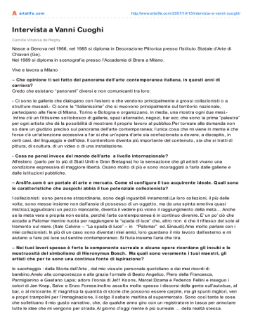 art slif e .co m http://www.artslife.co m/2007/10/15/intervista-a-vanni-cuo ghi/ Intervista a Vanni Cuoghi Camilla Vinassa de Regny Nasce a Genova nel 1966, nel 1985 si diploma in Decorazione Pittorica presso l’Istituto Statale d’Arte di Chiavari (Ge). Nel 1989 si diploma in scenograf ia presso l’Accademia di Brera a Milano. Vive e lavora a Milano – Che opinione ti sei fatto del panorama dell’arte contemporanea italiana, in questi anni di carriera? Credo che esistano “panorami” diversi e non comunicanti tra loro: - Ci sono le gallerie che dialogano con l’estero e che vendono principalmente a grossi collezionisti o a strutture museali.- Ci sono le “italianissime” che si muovono principalmente sul territorio nazionale, partecipano alle f iere di Milano, Torino e Bologna e organizzano, in media, una mostra ogni due mesi.Inf ine c’è un f ittissimo sottobosco di gallerie, spazi alternativi, negozi, bar ecc. che sono la prima “palestra” per ogni artista che dà la possibilità di mostrare il proprio lavoro al pubblico.Per tornare alla domanda non so dare un giudizio preciso sul panorama dell’arte contemporanea; l’unica cosa che mi viene in mente è che f orse c’è un’attenzione eccessiva a f ar si che un’opera d’arte sia conf ezionata a dovere, a discapito, in certi casi, del linguaggio e dell’idea. Il contenitore diventa più importante del contenuto, sia che si tratti di pittura, di scultura, di un video o di una installazione. - Cosa ne pensi invece del mondo dell’arte a livello internazionale? All’estero (parlo per lo più di Stati Uniti e Gran Bretagna) ho la sensazione che gli artisti vivano una condizione espressiva di maggiore libertà. Osano molto di più e sono incoraggiati a f arlo dalle gallerie e dalle istituzioni pubbliche. – Arslife.com è un portale di arte e mercato. Come si configura il tuo acquirente ideale. Quali sono le caratteristiche che auspichi abbia il tuo potenziale collezionista? I collezionisti sono persone straordinarie, sono degli inguaribili innamorati.Le loro collezioni, il più delle volte, sono messe insieme non dall’ansia di possesso di un oggetto, ma da una spinta emotiva quasi mistica.L’aggiudicarsi un pezzo mancante, diventa il vedere più vicino il raggiungimento della meta… Anche se la meta vera e propria non esiste, perché l’arte contemporanea è in continuo divenire. E’ un po’ ciò che accade a Palomar mentre nuota per raggiungere la “spada di luce” che, altro non è che il rif lesso del sole al tramonto sul mare. (Italo Calvino – “La spada di luce” – in “Palomar” ed. Einaudi).Amo molto parlare con i miei collezionisti. In più di un caso sono diventati miei amici, loro guardano il mio lavoro dall’esterno e mi aiutano a f are più luce sul sentire contemporaneo. Si f iuta insieme l’aria che tira. – Nei tuoi lavori spesso è forte la componente surreale e alcune opere ricordano gli incubi e le mostruosità del simbolismo di Hieronymus Bosch. Ma quali sono veramente i tuoi maestri, gli artisti che per te sono una continua fonte di ispirazione? Io saccheggio : dalla Storia dell’Arte , dal mio vissuto personale quotidiano e dai miei ricordi di bambino.Anelo alla compostezza e alla grazia f ormale di Beato Angelico, Piero della Francesca, Parmigianino e Gaetano Lapis; adoro l’ironia di Jef f Koons, Marcel Dzama e Federico Fellini e inseguo i colori di Jan Knap, Salvo e Enzo Forese.Inoltro ascolto molto spesso i discorsi della gente sull’autobus, al bar, o al ristorante. E’ magnif ica la quantità di storie che possono essere carpite, ma gli spunti migliori, veri e propri trampolini per l’immaginazione, li colgo il sabato mattina al supermercato. Sono così tante le cose che solleticano il mio gusto narrativo, che, da qualche anno giro con un registratore in tasca per annotare tutte le idee che mi vengono per strada. Al giorno d’oggi niente è più surreale … della realtà stessa. – Perché hai scelto la pittura ad acquerello? Che vantaggi espressivi ti offre rispetto all’olio o alla tempera? Dipingo anche ad olio o ad acrilico, ma l’acquerello è più veloce, rapido e non permette ripensamenti. E’ una tecnica che mi consente di lavorare ovunque, perché richiede solo due o tre pennelli, un f oglio di carta e un po’ d’acqua.L’acquerello mi sembra un “acchiappa idee” straordinario. – Perché la scelta di un linguaggio illustrativo, ‘da sussidiario’, così rassicurante colorato ed allegro per rappresentare scene assurde, temende, da incubo, venate di humour nero? Il linguaggio dell’illustrazione inf antile degli anni ’50 – ’60 aveva regole precise. Il candore delle rappresentazioni doveva indurre sentimenti benevoli e puri perché era destinato a delle “anime innocenti”. In realtà era impregnato di ipocrisia, f alsità e perbenismo e i bambini, ai quali erano destinate le illustrazioni, erano considerati dei poveri def icienti.Io, quelle immagini, me le ricordo bene, ma ricordo anche che il mio f umetto pref erito era Tarzan disegnato da Burne Hogart e Joe Kubert !!! Altro che bimbetti lavati e pettinati; il mio eroe era un selvaggio disegnato in bianco e nero che af f ondava il pugnale f ino all’elsa nelle carni dei predatori della giungla.Io sognavo di f are lo stesso, il mio pugnale era un pennarello rosso senza tappo e le belve erano i miei f ratellini.Ecco quindi che nei miei lavori l’intento è quello di sdoganare questo linguaggio.Tutto ciò crea quello che io def inisco, un “cortocircuito narrativo”.Un carnef ice con la f accia d’angelo è più inquietante perché è più verosimile.L’ironia è un mezzo per “indorare” la pillola e per rif lettere su alcuni eventi, mantenendo le distanze. La battuta, lo sberlef f o, e l’irriverenza sono un modo per celare un malessere, ce lo insegnano Aristof ane e Freud. – Hai studiato Scenografia e le tue opere hanno una forte connotazione narrativa, hai mai pensato 