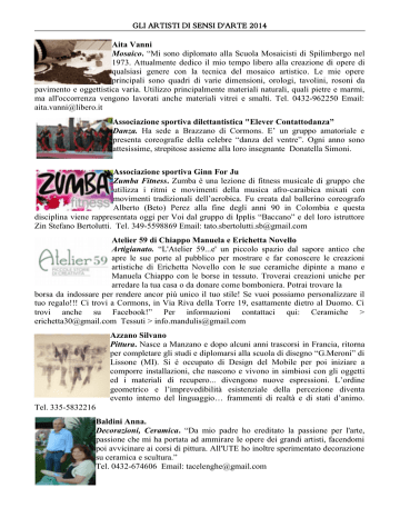 GLI ARTISTI DI SENSI D'ARTE 2014 Aita Vanni Mosaico. “Mi sono diplomato alla Scuola Mosaicisti di Spilimbergo nel 1973. Attualmente dedico il mio tempo libero alla creazione di opere di qualsiasi genere con la tecnica del mosaico artistico. Le mie opere principali sono quadri di varie dimensioni, orologi, tavolini, rosoni da pavimento e oggettistica varia. Utilizzo principalmente materiali naturali, quali pietre e marmi, ma all'occorrenza vengono lavorati anche materiali vitrei e smalti. Tel. 0432-962250 Email: [email protected] Associazione sportiva dilettantistica "Elever Contattodanza” Danza. Ha sede a Brazzano di Cormons. E’ un gruppo amatoriale e presenta coreografie della celebre “danza del ventre”. Ogni anno sono attesissime, strepitose assieme alla loro insegnante Donatella Simoni. Associazione sportiva Ginn For Ju Zumba Fitness. Zumba è una lezione di fitness musicale di gruppo che utilizza i ritmi e movimenti della musica afro-caraibica mixati con movimenti tradizionali dell’aerobica. Fu creata dal ballerino coreografo Alberto (Beto) Perez alla fine degli anni 90 in Colombia e questa disciplina viene rappresentata oggi per Voi dal gruppo di Ipplis “Baccano” e del loro istruttore Zin Stefano Bertolutti. Tel. 349-5598869 Email: [email protected] Atelier 59 di Chiappo Manuela e Erichetta Novello Artigianato. “L'Atelier 59...e' un piccolo spazio dal sapore antico che apre le sue porte al pubblico per mostrare e far conoscere le creazioni artistiche di Erichetta Novello con le sue ceramiche dipinte a mano e Manuela Chiappo con le borse in tessuto. Troverai creazioni uniche per arredare la tua casa o da donare come bomboniera. Potrai trovare la borsa da indossare per rendere ancor più unico il tuo stile! Se vuoi possiamo personalizzare il tuo regalo!!! Ci trovi a Cormons, in Via Riva della Torre 19, esattamente dietro al Duomo. Ci trovi anche su Facebook!” Per informazioni contattaci qui: Ceramiche > [email protected] Tessuti > [email protected] Azzano Silvano Pittura. Nasce a Manzano e dopo alcuni anni trascorsi in Francia, ritorna per completare gli studi e diplomarsi alla scuola di disegno “G.Meroni” di Lissone (MI). Si è occupato di Design del Mobile per poi iniziare a comporre installazioni, che nascono e vivono in simbiosi con gli oggetti ed i materiali di recupero... divengono nuove espressioni. L’ordine geometrico e l’imprevedibilità esistenziale della percezione diventa evento interno del linguaggio… frammenti di realtà e di stati d’animo. Tel. 335-5832216 Baldini Anna. Decorazioni, Ceramica. “Da mio padre ho ereditato la passione per l'arte, passione che mi ha portata ad ammirare le opere dei grandi artisti, facendomi poi avvicinare ai corsi di pittura. All'UTE ho inoltre sperimentato decorazione su ceramica e scultura.” Tel. 0432-674606 Email: [email protected] Barbara & Barbara Bigiotteria. "Un arcobaleno di gioie" crea realizzazioni artigianali di bijoux e non solo, utilizzando perline giapponesi Miyuki, cristalli Swarovski e pietre dure. In particolare, tutte le creazioni fatte con le Miyuki sono rigorosamente cucite una ad una a mano andando a creare un vero e proprio ricamo. Gioielli originali, unici e soprattutto fatti a mano! Tel. 392-5754873 Email: [email protected] Email: [email protected] Beltramini Luciano Ceramica Raku. “Condividere il “RAKU” con amici, emozioni comuni è sempre una gioia che ha radici profonde e spesso toccano delicatamente l’anima con una piuma o un crine di cavallo”. Tel. 0432-670365 Email: [email protected] Bertossi Marina Pittura. “La mia passione da hobbista è il “Terzo fuoco”, arte poco conosciuta in Friuli: si tratta di pittura su porcellana. Questa tecnica, cioè terza cottura (1° biscotto, 2° cristallina 3° decorazione), è la pittura su porcellana sopra cristallina: con colori appositi si esegue la decorazione sull’oggetto, poi il “pezzo” viene cotto a circa 730°-780°, per fissare il colore alla cristallina in modo permanente. Pratico da circa 20 anni ed ho frequentato corsi sperimentando varie tecniche. Attualmente sono docente di “Pittura su porcellana, tecnica terzo fuoco” all’Università delle LiberEtà di Udine.” Tel. 328-6496246 Email: [email protected] – Fb: TerzoFuoco di Marina Bertossi Bolech Isabella e Russo Giovanni Artigianato. “Creiamo oggetti utilizzando il cartonage e il ricamo come ad esempio copertine in stoffa ricamata a mano per quaderni o altri oggetti, pannelli decorati con pannolenci.” Torre d'Isola (PV) Tel. 0382-524919 Cell. 340-7772503 Email: [email protected] // [email protected] Braida Giulio Decorazioni. “Espongo l'arte nella decorazione di interni ed esterni. Mi sono appassionato a quest'arte lavorando, ho iniziato a fare questo lavoro 2 anni fa e da gennaio lavoro in proprio.” Tel. 340-7412982 Email: [email protected] Bulfoni Francesca Artigianato. “Nei miei lavori utilizzo legno o stoffa e fabbrico bambole, animali di legno collane ecc.” Email: [email protected] Calligaris Francesca Uncinetto, cucito. “LANA CREATIVA. Dall'unione di più materiali, tra cui fiori di lana all'uncinetto, bottoni, juta... nascono le nostre creazioni di bijoux e accessori moda.” Email: [email protected] Cantarutti Loretta Decorazioni. Abita a Manzano. La passione è nata tre anni fa dalla Pigotta, la tradizionale bambola di pezza eseguita per una Scuola Materna. Da lì parte il sogno e l’infinita creatività estesa a realizzare animaletti e creazioni con scarti di stoffa di tappezzeria. Tel. 0432-754434 Cantarutti Paolo Lavorazione del legno. Vive a Case di Manzano, ha 54 anni e lavora nel settore del legno. La forma d'arte che propone consiste nella realizzazione di vari oggetti di uso quotidiano (portaoggetti,cornici...) costruiti unicamente in legno di diverse essenze. Si tratta di oggetti lineari, verniciati ad acqua, assemblati artigianalmente. "La Babele del legno" é il titolo di queste creazioni, che nascono dall'inventiva