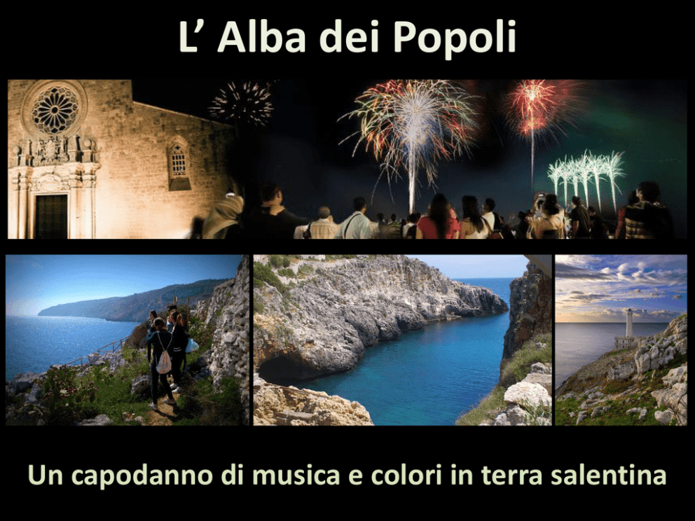 L’ Alba dei Popoli Un capodanno di musica e colori in terra salentina La festa ad Otranto Otranto, luogo simbolo del Mediterraneo e crocevia di culture, celebra il legame della Puglia con la civiltà mediterranea attraverso una rassegna di Arte, Cultura, Musica e Spettacoli. "Alba dei Popoli" è un'iniziativa che prende spunto dalla forza simbolica del sole del nuovo anno che giunge dall'Oriente e che illumina per prima proprio questa frontiera dell'Europa. La manifestazione, sin dalla sua prima edizione nel 1999, ha visto la presenza di numerosi artisti di livello internazionale come Goran Bregovic, Franco Battiato, Edoardo Bennato, Vinicio Capossela, Nicola Piovani, Lou Reed, Pino Daniele, Mario Biondi, Avion Travel, Nina Zilli e gli Stadio. Ogni anno la Città dei Martiri organizza la manifestazione programmando un mese di eventi di vario genere, per ricordare a tutti che la prima luce del nuovo anno giunge in Italia dal Salento, da Otranto. Il Parco Naturale di Porto Selvaggio Nel 2007 la baia di Porto Selvaggio è stata inserita dal Fondo per l'Ambiente Italiano (FAI) nell'elenco dei "100 luoghi da salvare ". Un trekking emozionante nell’oasi più bella del Salento. Un percorso tra bosco e mare punteggiato di grotte e torri di avvistamento. Una visita imperdibile arricchita e resa ancor più bella e interessante dai racconti e le curiosità che la nostra guida locale ci offrirà durante il percorso. Il sentiero delle Cipolliane e il Ciolo Un percorso mozzafiato che si snoda lungo la costa adriatica su una antica barriera corallina oggi emersa. L’escursione ci porterà fino al canalone del Ciolo, una volta utilizzato dai pastori come ricovero per le loro pecore ed oggi meta imperdibile dei turisti che d’estate ne affollano la spettacolare spiaggetta di ciottoli. La Lecce barocca e romana Città d'arte nota come "la Firenze del Sud" o la "Firenze del Barocco". A Lecce i resti archeologici della dominazione romana si mescolano alla ricchezza e all’esuberanza del barocco delle chiese e dei palazzi del centro, costruiti in "pietra leccese", un calcare malleabile e molto adatto alla lavorazione con lo scalpello. Il nostro agriturismo IL MEGALITE www.agriturismoilmegalite.it a pochi km dal centro di Otranto è una struttura moderna in una realtà tradizionale legata ai sapori autentici della cucina locale Come viaggiamo Il viaggio a/r da Roma è lasciato libero ai partecipanti. La soluzione consigliata è il volo Roma Ciampino Brindisi che decolla alle 6.40 del 30 dicembre. Per il rientro è possibile prendere il volo Brindisi Roma Ciampino alle 21.50 del 1 gennaio. All’aeroporto di Brindisi noleggeremo le auto che utilizzeremo per gli spostamenti nel Salento. I mezzi saranno coperti da assicurazione Kasko e i partecipanti che si offriranno di guidarli saranno esentati dalle spese del carburante per tutta la durata del noleggio. Alternative all’aereo Oltre che con la propria auto è possibile raggiungere Brindisi e Lecce anche con il treno da Roma Termini. Il collegamento veloce Frecciargento impiega rispettivamente 5h e 5h20m Per tutti c’è la possibilità di anticipare l’arrivo o posticipare la partenza fermandosi una notte in più (è possibile sia il 29 dicembre che il 1 gennaio) ad un prezzo speciale concordato con l’agriturismo. Chiedere dettagli se interessati. Restrizioni al bagaglio di cabina Per chi viaggiando in aereo avesse bisogno di più bagaglio di quello consentito in cabina (max 10kg) consigliamo di valutare la possibilità di condividere con un amico/a una valigia da stiva in modo da ridurre i costi e il numero totale dei trolley/valigie che verranno caricate in macchina. 30 dicembre Da Brindisi raggiungeremo in macchina il nostro agriturismo. Dopo una breve pausa per lasciare il bagaglio ci sposteremo in auto a Novaglie, dove inizieremo il sentiero delle Cipolliane che si concluderà al Ciolo. Pranzo al sacco. Nel primo pomeriggio visita al Giardino Megalitico di Giurdignano, l’area con più alta concentrazione di dolmen e menhir d’Italia. Cena in agriturismo e serata ad Otranto per il concerto sul lungomare (artista/band da definire). 31 dicembre Dopo la colazione, spostamento in auto a Santa Caterina dove inizia l’escursione al Parco Naturale di Porto Selvaggio. Pranzo al sacco. Nel pomeriggio rientro in agriturismo, cenone di fine anno e successivamente spostamento ad Otranto per una notte di musica e festeggiamenti per l’Alba dei Popoli. 1 gennaio In tarda mattinata breve escursione a Porto Badisco, pranzo in agriturismo e nel pomeriggio spostamento a Lecce per visita guidata della città. Alle 20.00 partenza per Brindisi per riconsegnare le auto a noleggio in aeroporto. Appuntamento: Il 30 mattina a Ciampino al check-in del volo Ryanair o, in alternativa, ore 9:30 presso l’Agriturismo Il Megalite Informazioni importanti: Trekking del 30: (6 km – dislivello complessivo m 250) Trekking del 31: (12 km - dislivello m 50) Durata: c.ca 3h30m Durata: c.ca 5h Difficoltà: E (Escursionistico) Difficoltà: E (Escursionistico) Trekking del 1: (6 km – Urban-Trek a Lecce) Durata: c.ca 4h Difficoltà: T (Turistico) Cosa portare: Abbigliamento: Scarponcini da trekking, felpa, cappellino e guanti in pile, giacchetto impermeabile, effetti personali utili a trascorrere due notti in albergo e due serate all’aperto. Attrezzatura: macchina fotografica. COSTI: La quota complessiva di partecipazione è di € 225 * La quota comprende: Il noleggio delle auto con assicurazione Kasko Due notti nell’agriturismo Il Megalite (sistemazione in camera doppia) con prima colazione La cena del 30 - il cenone del 31 con menù a scelta di carne o di pesce - il pranzo del 1 gennaio Cestino salentino del 31 (pranzo al sacco) Assicurazione di viaggio Guida locale per le escursioni naturalistiche e per l’urban-trek di Lecce La quota non comprende: Tessera annuale FederTrek (€15) Le quote escursione per i tre giorni (€ 24) Tutto quanto non specificato ai punti pre
