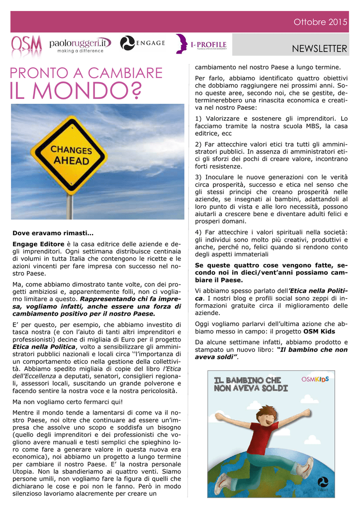 Ottobre 2015 NEWSLETTER PRONTO A CAMBIARE IL MONDO? cambiamento nel nostro Paese a lungo termine. Per farlo, abbiamo identificato quattro obiettivi che dobbiamo raggiungere nei prossimi anni. Sono queste aree, secondo noi, che se gestite, determinerebbero una rinascita economica e creativa nel nostro Paese: 1) Valorizzare e sostenere gli imprenditori. Lo facciamo tramite la nostra scuola MBS, la casa editrice, ecc 2) Far attecchire valori etici tra tutti gli amministratori pubblici. In assenza di amministratori etici gli sforzi dei pochi di creare valore, incontrano forti resistenze. 3) Inoculare le nuove generazioni con le verità circa prosperità, successo e etica nel senso che gli stessi principi che creano prosperità nelle aziende, se insegnati ai bambini, adattandoli al loro punto di vista e alle loro necessità, possono aiutarli a crescere bene e diventare adulti felici e prosperi domani. Dove eravamo rimasti… Engage Editore è la casa editrice delle aziende e degli imprenditori. Ogni settimana distribuisce centinaia di volumi in tutta Italia che contengono le ricette e le azioni vincenti per fare impresa con successo nel nostro Paese. Ma, come abbiamo dimostrato tante volte, con dei progetti ambiziosi e, apparentemente folli, non ci vogliamo limitare a questo. Rappresentando chi fa impresa, vogliamo infatti, anche essere una forza di cambiamento positivo per il nostro Paese. E’ per questo, per esempio, che abbiamo investito di tasca nostra (e con l’aiuto di tanti altri imprenditori e professionisti) decine di migliaia di Euro per il progetto Etica nella Politica, volto a sensibilizzare gli amministratori pubblici nazionali e locali circa ‘'l’importanza di un comportamento etico nella gestione della collettività. Abbiamo spedito migliaia di copie del libro l’Etica dell’Eccellenza a deputati, senatori, consiglieri regionali, assessori locali, suscitando un grande polverone e facendo sentire la nostra voce e la nostra pericolosità. Ma non vogliamo certo fermarci qui! Mentre il mondo tende a lamentarsi di come va il nostro Paese, noi oltre che continuare ad essere un’impresa che assolve uno scopo e soddisfa un bisogno (quello degli imprenditori e dei professionisti che vogliono avere manuali e testi semplici che spieghino loro come fare a generare valore in questa nuova era economica), noi abbiamo un progetto a lungo termine per cambiare il nostro Paese. E’ la nostra personale Utopia. Non la sbandieriamo ai quattro venti. Siamo persone umili, non vogliamo fare la figura di quelli che dichiarano le cose e poi non le fanno. Però in modo silenzioso lavoriamo alacremente per creare un 4) Far attecchire i valori spirituali nella società: gli individui sono molto più creativi, produttivi e anche, perché no, felici quando si rendono conto degli aspetti immateriali Se queste quattro cose vengono fatte, secondo noi in dieci/vent’anni possiamo cambiare il Paese. Vi abbiamo spesso parlato dell’Etica nella Politica. I nostri blog e profili social sono zeppi di informazioni gratuite circa il miglioramento delle aziende. Oggi vogliamo parlarvi dell’ultima azione che abbiamo messo in campo: il progetto OSM Kids Da alcune settimane infatti, abbiamo prodotto e stampato un nuovo libro: “Il bambino che non aveva soldi”. Ottobre 2015 NEWSLETTER La bambina che non andava bene a scuola Questo libricino dedicato ai bambini dai 6 ai 12 anni è il primo di una collana intitolata OSM Kids che la nostra casa editrice Engage ha deciso di creare per insegnare ai più piccoli quei principi basilari che li aiuteranno ad essere adulti di successo domani. La mamma che sbagliava Abbiamo appena cominciato ma già riceviamo un grande riscontro e interesse da parte dei mass media. Molti di noi sono genitori e si sono accorti che alcune tecniche che insegnavamo nelle aziende, se insegnate ai bambini delle scuole elementari e medie, potrebbero aiutarli ad avere un rendimento migliore a scuola ma anche a diventare adulti più felici e di successo. È così che, grazie al contributo di centinaia di proprietari di azienda, di insegnanti e di genitori italiani, è nato il progetto OSM Kids. Vogliamo che ai bambini delle scuole elementari e medie del nostro Paese vengano insegnate in modo molto semplice quelle regole che quando cresceranno li aiuteranno ad avere una vita lavorativa felice e di successo. Concetti quali la motivazione delle persone, il capire cosa si aspetta da te il tuo cliente e dargli anche qualcosa in più rispetto a quello, o il chiarirsi il significato delle parole per comprendere appieno ciò che stai leggendo, sono nozioni fondamentali che permettono a te di essere una persona di successo oggi e potrebbero aiutare un bambino, a diventarlo domani. Cosa faremo con questi libri? Intanto abbiamo iniziato a promuoverli. Anche in vista del Natale, pensiamo che questo libro potrebbe essere un bellissimo regalo da mettere sotto l’albero di tutti i bambini. “Il bambino che non aveva soldi” insegna ai più piccoli attraverso semplici testi e disegni ad OSSERVARE DI COSA HANNO BISOGNO LE PERSONE CHE TI STANNO INTORNO E PRODURLO perché QUESTO E’ L’UNICO MODO PER AVERE SOLDI ( nel senso di successo, di realizzazione professionale e personale): non ci sono scorciatoie e non si deve aspettare che la fortuna arrivi a baciarti per poterti realizzare come individuo. Da qui ai prossimi mesi pubblicheremo altri titoli con cui affronteremo altri temi importanti. I titoli sono: I bulli non mi fanno paura Pensa a come sarebbe bello se tutti i bambini d’Italia lo potessero leggere! Avremmo seminato realmente la possibilità di lasciare un mondo migliore per i nostri figli! E poi, grazie ad Anna Aulico, nostra referente per la Sicilia, abbiamo iniziato a proporlo in alcune scuole elementari e abbiamo chiesto ai bambini di dirci cosa pensano, nel caso del primo libro per esempio, riguardo al denaro: cos’è e a cosa serve. Il riscontro che stiamo avendo da parte loro è un grandiss