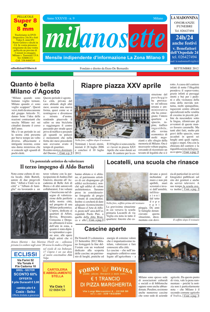 PELLICOLE Super 8 e 8 mm Trasferiamo in DVD Diapositive 24x36 e 6x6 Video 8, mini DV. Nastri Geloso e dischi in Cd. In vostra presenza eseguiamo da una vostra pellicola un provino di 2 minuti in omaggio. Milano v. Taormina 15/A Tel. 026081211 Cell. 338-8484310 Anno XXXVII - n. 9 milanosette Mensile indipendente d’informazione La Zona Milano 9 [email protected] Fondato e diretto da Enzo De Bernardis Quanto è bella Milano d’Agosto “Milano quando sono lontano voglio tornare, Milano quando ci sono voglio scappare”. Questi versi, tratti da una canzone del gruppo Articolo 31, danno bene lʼidea delle reazioni contrastanti che suscita Milano nei sui cittadini durante il corso dellʼanno. Ma cʼè un periodo in cui la nostra città presenta per breve tempo un volto diverso, affascinante e intrigante insieme, come una dama misteriosa che si concede agli sguardi di pochi eletti. Milano Questo periodo è agosto. La città, privata del caos abituale degli altri mesi, assume una nuova forma, quasi come se si restringesse e diventasse a misura dʼuomo, rendendo piacevole il salire su una bicicletta e raggiungere il centro passando per strade quasi prive di traffico e posando gli sguardi su palazzi e monumenti che nella fretta dei mesi precedenti non avevamo avuto il tempo di guardare. Il centro storico, dominato dal Duomo, Cont. a p. 3 Terminati i lavori eterni, iniziati il 28 luglio 2006 e conclusi il 10 luglio 2012. Un potenziale artistico da valorizzare Il terzo impegno di Aldo Bartoli Noto come cultore di storia locale, Aldo Bartoli, autore di due pregevoli libri “Affori e Uniti va in città” e “Album di famiglia” sta lavorando a un terzo volume con la partecipazione di Andrea Del Guercio, docente allʼ Accademia di Belle Arti di Brera e di altri autorevoli collaboratori. I tre volumi sʼinseriscono nel disegno di valorizzazione delle periferie della nostra città, nel progetto di una Milano policentrica. Lʼopera, dedicata ai quartieri di Affori, Bovisa, Bruzzano, Comasina e Dergano affronterà il tema dellʼarte in zona, a quanto è stato dipinto ispirandosi a queste aree, alle opere degli artisti che vi Arturo Martini - San Martino 35x43 cm - collezione privata.Lo scultore negli anni ‘30 aveva lo studio a Dergano nel vicolo di via Imbonati, 17 L’opera è un suo dono al nostro concittadino Aldo Volpe Via Farini 52 Via Tonale 4 P.le Cadorna 10 CARTOLERIA BREIL - SECTOR ECLISSI SCONTO 60% OFFERTA 8 pile Duracell € 3,80 cambio pile € 4 Casio - Seiko Offerta limitata a giacenza E ABBIGLIAMENTO STELLA Via Ciaia 1 02 6684724 hanno abitato o vi abitano, al patrimonio artistico di cui dispongono gli edifici ecclesiastici, nonché agli edifici di valore architettonico. Saranno prese in considerazione fotografie di pregio e ritratti di concittadini. Inoltre si cercherà di dare adeguato riconoscimento al Museo dʼArte di Affori, posto nellʼ area dellʼex ospedale Paolo Pini, a quello della ditta Branca e alle Cont. a pag.3 Il 10 luglio si sono conclusi i lavori in piazza XXV Aprile che sono durati sei anni. Il cantiere per la co- ONORANZE FUNEBRI Tel. 026427494 24h/24 anche festivi v. Benefattori dellʼOspedale 24 tel. 026427494 mail: la [email protected] SETTEMBRE 2012 Riapre piazza XXV aprile Nella foto, soffitto dopo il restauro LA MADONNINA struzione del parcheggio ha provocato unʼodissea umana e amministrativa che ha consegnato lʼintero quartiere a spaccio, rapine, traffico ingestibile, alla rovina economica di molti negozianti e allo sfregio della memoria di Milano. Ora è necessario voltare pagina, cercando di ricostruire un tessuto di legalità che si è rotto. A causa del cantiere infatti di notte lʼillegalità prendeva il sopravvento; grazie infatti ai passaggi stretti e bui per i pedoni e alla vicinanza della zona della movida notturna, molti sputapalline, ragazzoni centro africani specializzati nella vendita di cocaina in piccole palline da nascondere sotto la lingua, rifornivano gli avventori di queste manco fossero caramelle. Ma tanti altri fatti, molto più gravi dello spaccio, sono accaduti in questi sei lunghi anni quali rapine, scippi e stupri. Ora con la chiusura del cantiere e la riqualificazione della piazza si spera Cont. a pag. 2 Locatelli, una scuola che rinasce devano a pezzi inchiodate al muro e non più apribili, muri scrostati e invasi dallʼumidità, infiltrazioni dal tetto d o p o Nella foto, soffitto prima del restauro o g n i La gravissima situazione pioggia. Da anni in cui versava la scuola le famiglie denunprimaria Locatelli di via ciavano questa Veglia era nota in tutto il situazione, docuquartiere: finestre che ca- mentata con dovi- zia di particolari in servizi fotografici pubblicati sul sito dei genitori e anche da servizi televisivi. A suo tempo la scuola aveva inoltre Cont. a pag. 2 Il soffitto dopo il restauro Cascine aperte Da Venerdì 21 a domenica 23 Settembre 2012 Milano festeggerà la fine dellʼestate con un weekend dedicato alla scoperta delle cascine; un patrimonio di luoghi, pratiche ed energie di estremo valore che è importantissimo tutelare, valorizzare e fare conoscere alla città. Le cascine – che nellʼimmaginario collettivo sono legate allʼagricoltura – a Milano sono spesso sede di associazioni culturali e sociali o di biblioteche oppure sono anche abbandonate. Peraltro, resistono anche numerose cascine che sono sede di aziende agricole. Da questo punto di vista, vale la pena rammentare – poiché la notizia non è particolarmente nota – che Milano è il secondo comune agricolo d ʼ I t a l i a , Cont. a pag. 3 milanosette 2 - SETTEMBRE 2012 (segue da pag. 1) Riapre... che vengano effettuati maggiori controlli.Soprattutto il sindaco Giuliano Pisapia ha promesso di attuare un piano che possa restituire ai cittadini la piazza come luogo di gioia con iniziative che permettano anche ai negozianti di tornare a lavorare con serenità. Speriamo che un luogo così caratteristico e storico della città non venga nuovament