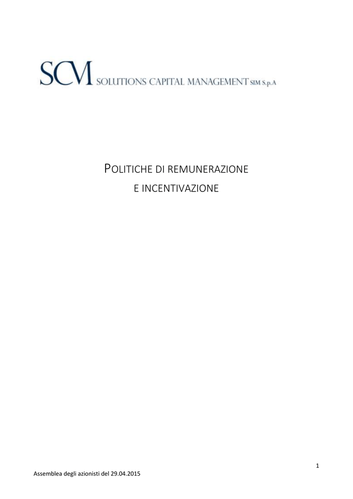 POLITICHE DI REMUNERAZIONE E INCENTIVAZIONE 1 Assemblea degli azionisti del 29.04.2015 Indice 1. Premessa ................................................................................................................................................... 3 2. Definizioni .................................................................................................................................................. 3 3. Normativa di Riferimento .......................................................................................................................... 4 4. Principi generali ......................................................................................................................................... 4 5. Ruoli e Responsabilità nella definizione delle Politiche e delle remunerazioni ........................................ 5 5.1 Assemblea degli azionisti....................................................................................................................... 5 5.2 Consiglio di Amministrazione ................................................................................................................ 5 5.3 Amministratore Delegato ...................................................................................................................... 6 5.4 Funzioni aziendali di controllo ............................................................................................................... 7 6. Struttura del sistema di remunerazione e incentivazione del Personale.................................................. 7 6.1 Consiglio di Amministrazione ................................................................................................................ 7 6.2 Collegio Sindacale .................................................................................................................................. 7 6.3 Dipendenti ............................................................................................................................................. 8 6.4 Responsabili delle funzioni aziendali di controllo ................................................................................. 8 6.5 Responsabile Commerciale ................................................................................................................... 8 6.6 Responsabile Area Investimenti ............................................................................................................ 8 6.7 Promotori Finanziari .............................................................................................................................. 8 7. Politica pensionistica di fine rapporto ....................................................................................................... 9 8. Criteri di determinazione ex ante delle componenti variabili ................................................................... 9 8.1 9. Parametri legati alla componente di incentivazione ............................................................................. 9 Trasmissione dei dati alle Autorità di Vigilanza ....................................................................................... 10 10. Aggiornamento della politica .............................................................................................................. 10 11. Informativa al pubblico........................................................................................................................ 10 2 Assemblea degli azionisti del 29.04.2015 1. Premessa Il presente documento riporta le politiche di remunerazione e incentivazione (nel seguito anche definite “politiche”) che la SIM intende adottare a favore del personale più rilevante, nonché dei componenti del Consiglio di Amministrazione, del Collegio Sindacale e delle funzioni di controllo interno. Le seguenti politiche di remunerazione ed incentivazione predisposte dal Consiglio di Amministrazione, sentito il parere della funzione di conformità e di gestione del rischio, sono sottoposte all’Assemblea degli azionisti e presentano una validità triennale sulla base del mandato di cui è investito il Consiglio di Amministrazione. Le politiche di remunerazione e incentivazione sono predisposte nel rispetto delle norme di legge, di Vigilanza e statutarie nonché del Codice Etico adottato dalla SIM. In aggiunta nel presente documento, al fine di garantirne una migliore comprensione, dove ritenuto opportuno sono riportati i contenuti di determinati articoli statutari ovvero viene fatto rimando agli articoli medesimi. Si precisa che, in riferimento alla classificazione definita nella “Guida per l’attività di vigilanza” in materia di processo di revisione e valutazione prudenziale (SREP) adottata dalla Banca d’Italia con la Circolare n. 269 del 7 maggio 2008, la SIM appartiene alla quarta macro-categoria e, ai sensi dell’art. 14-bis del Regolamento Congiunto, rientra nella categoria degli intermediari “minori”. Le Presenti politiche si applicano a tutto il Personale di SCM. 2. Definizioni “Regolamento Congiunto”: il Regolamento in materia di organizzazione e procedure degli intermediari adottato congiuntamente dalla Banca d’Italia e dalla Consob con Provvedimento del 29 ottobre 2007, e successive modifiche e integrazioni. “Regolamento di Vigilanza Prudenziale”: il Regolamento Banca d’Italia del 24 ottobre 2007 in materia di vigilanza prudenziale per le SIM, e successive modifiche e integrazioni. “Direttiva CRD 3”: la Direttiva 2010/76/UE del 24 novembre 2010 in materia di politiche e prassi di remunerazione e incentivazione. “Direttiva CRD 4”: la Direttiva 2013/36/UE del 26 giugno 2013. “Servizi”: I Servizi di investimento, servizi accessori e/o distribuzione di prodotti assicurativi forniti da SCM alla propria clientela. “Remunerazione”: ogni forma di pagamento o beneficio corrisposto, direttamente o indirettamente, in contanti, strumenti finanziari o beni in natu