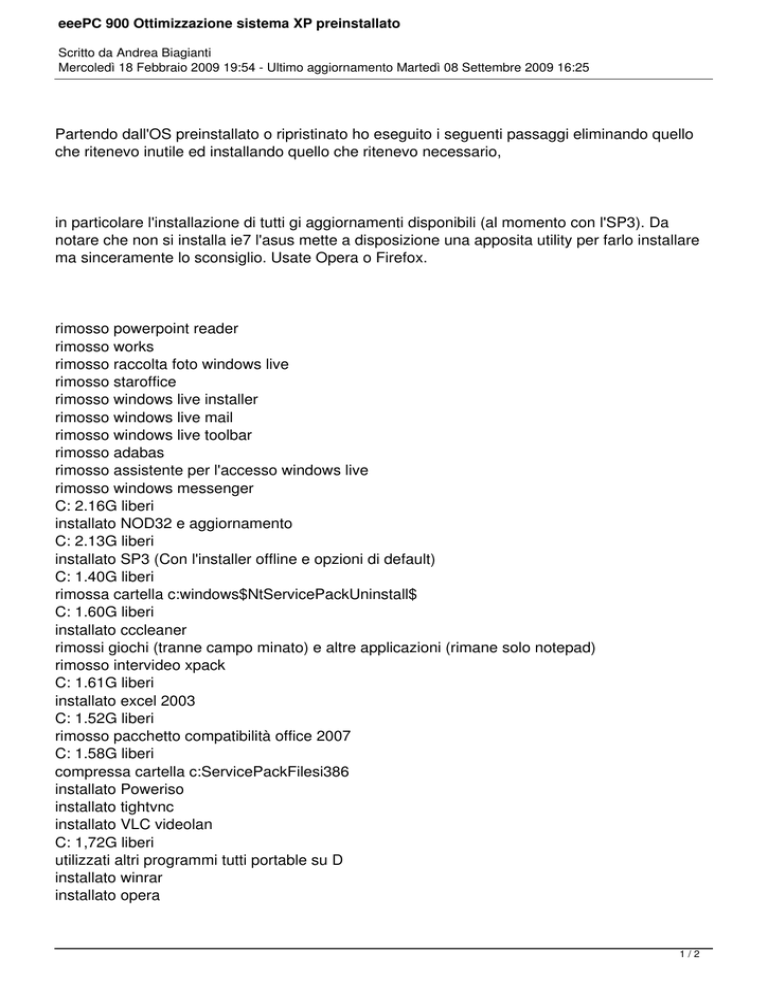 eeePC 900 Ottimizzazione sistema XP preinstallato Scritto da Andrea Biagianti Mercoledì 18 Febbraio 2009 19:54 - Ultimo aggiornamento Martedì 08 Settembre 2009 16:25 Partendo dall'OS preinstallato o ripristinato ho eseguito i seguenti passaggi eliminando quello che ritenevo inutile ed installando quello che ritenevo necessario, in particolare l'installazione di tutti gi aggiornamenti disponibili (al momento con l'SP3). Da notare che non si installa ie7 l'asus mette a disposizione una apposita utility per farlo installare ma sinceramente lo sconsiglio. Usate Opera o Firefox. rimosso powerpoint reader rimosso works rimosso raccolta foto windows live rimosso staroffice rimosso windows live installer rimosso windows live mail rimosso windows live toolbar rimosso adabas rimosso assistente per l'accesso windows live rimosso windows messenger C: 2.16G liberi installato NOD32 e aggiornamento C: 2.13G liberi installato SP3 (Con l'installer offline e opzioni di default) C: 1.40G liberi rimossa cartella c:windows$NtServicePackUninstall$ C: 1.60G liberi installato cccleaner rimossi giochi (tranne campo minato) e altre applicazioni (rimane solo notepad) rimosso intervideo xpack C: 1.61G liberi installato excel 2003 C: 1.52G liberi rimosso pacchetto compatibilità office 2007 C: 1.58G liberi compressa cartella c:ServicePackFilesi386 installato Poweriso installato tightvnc installato VLC videolan C: 1,72G liberi utilizzati altri programmi tutti portable su D installato winrar installato opera 1/2 eeePC 900 Ottimizzazione sistema XP preinstallato Scritto da Andrea Biagianti Mercoledì 18 Febbraio 2009 19:54 - Ultimo aggiornamento Martedì 08 Settembre 2009 16:25 fatti alcuni aggiornamenti cancellata cartella C:WindowsSoftwareDistribution procedura: - apri cmd.exe come amministratore - scrivi "net stop wuauserv" (questo ferma gli aggiornamenti automatici) - cancella la directory "C:WindowsSoftwareDistribution" - avviare Windows Update (questo ricrea la cartella C:WindowsSoftwareDistribution ma molto più piccola)" C: 1.70G liberi 2/2