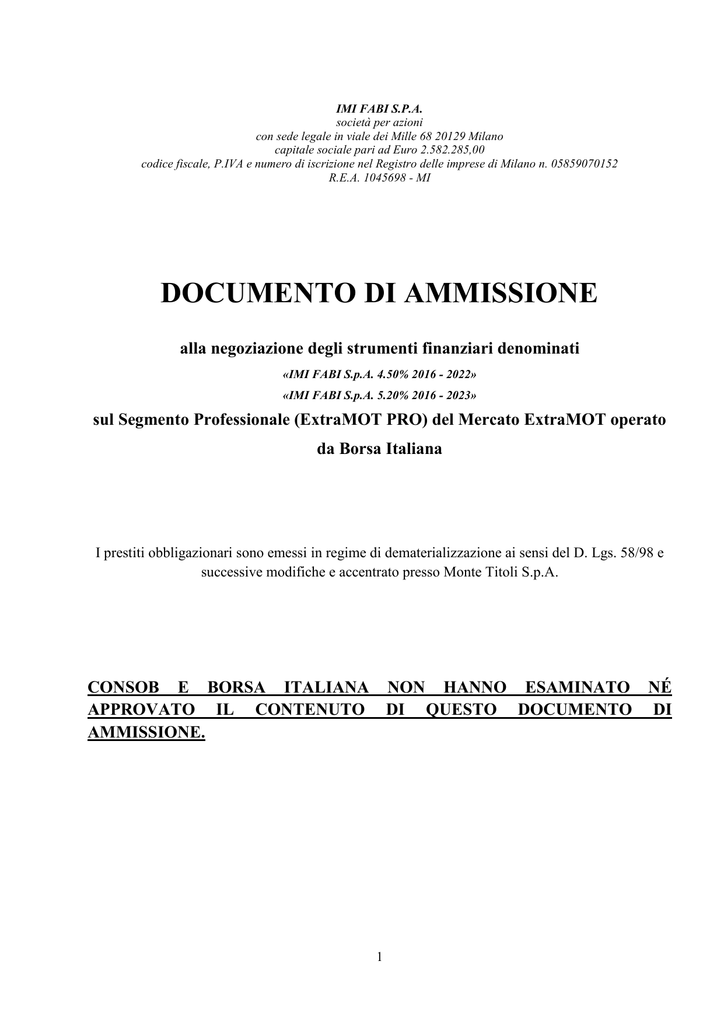 IMI FABI S.P.A. società per azioni con sede legale in viale dei Mille 68 20129 Milano capitale sociale pari ad Euro 2.582.285,00 codice fiscale, P.IVA e numero di iscrizione nel Registro delle imprese di Milano n. 05859070152 R.E.A. 1045698 - MI DOCUMENTO DI AMMISSIONE alla negoziazione degli strumenti finanziari denominati «IMI FABI S.p.A. 4.50% 2016 - 2022» «IMI FABI S.p.A. 5.20% 2016 - 2023» sul Segmento Professionale (ExtraMOT PRO) del Mercato ExtraMOT operato da Borsa Italiana I prestiti obbligazionari sono emessi in regime di dematerializzazione ai sensi del D. Lgs. 58/98 e successive modifiche e accentrato presso Monte Titoli S.p.A. CONSOB E BORSA ITALIANA NON HANNO ESAMINATO NÉ APPROVATO IL CONTENUTO DI QUESTO DOCUMENTO DI AMMISSIONE. 1 INDICE 1. DEFINIZIONI ............................................................................................................................. 3 2. PERSONE RESPONSABILI E CONFLITTI DI INTERESSE.................................................. 4 3. FATTORI DI RISCHIO .............................................................................................................. 5 4. INFORMAZIONI RELATIVE ALL’EMITTENTE ................................................................ 20 5. STRUTTURA ORGANIZZATIVA ......................................................................................... 22 6. PRINCIPALI SOCI................................................................................................................... 23 7. INFORMAZIONI FINANZIARIE RIGUARDANTI LE ATTIVITÀ E LE PASSIVITÀ, LA SITUAZIONE FINANZIARIA E I PROFITTI E LE PERDITE DELL’EMITTENTE .......... 24 8. INFORMAZIONI RELATIVE ALLE OBBLIGAZIONI ........................................................ 25 9. AMMISSIONE ALLA NEGOZIAZIONE E RELATIVE MODALITÀ ................................. 53 10. REGIME FISCALE APPLICABILE ALLE OBBLIGAZIONI ............................................... 54 11. RESTRIZIONI ALLA CIRCOLAZIONE delLE Obbligazioni ............................................... 61 ALLEGATO I - Bilancio dell’Emittente relativo all’esercizio chiuso al 31 dicembre 2012 e relativa certificazione ............................................................................................................................. 62 ALLEGATO II - Bilancio consolidato del Gruppo IMI Fabi relativo all’esercizio chiuso al 31 dicembre 2012 e relativa certificazione …………………………………………………………62 2 1. DEFINIZIONI In aggiunta alle definizioni previste all’interno dei Regolamenti dei Prestiti di cui al successivo paragrafo 8 (Informazioni relative alle Obbligazioni), si riporta di seguito un elenco delle definizioni e dei termini utilizzati all’interno del Documento di Ammissione. Tali definizioni e termini, salvo quanto diversamente specificato nei Regolamenti dei Prestiti, hanno il significato di seguito indicato, essendo inteso che il medesimo significato si intenderà attribuito sia al singolare sia al plurale. “Documento di Ammissione” indica il presente documento di ammissione delle Obbligazioni alla negoziazione sul Segmento Professionale (ExtraMOT PRO) del Mercato ExtraMOT operato da Borsa Italiana. “Contratti di Sottoscrizione” ha il significato di cui al paragrafo 2.3. “Decreto 239” indica il Decreto Legislativo del 1° aprile 1996, n. 239, come successivamente integrato e modificato “Gruppo” indica l’Emittente e le società dalla stessa controllate ai sensi dell’articolo 2359 del Codice Civile *** 3 2. PERSONE RESPONSABILI E CONFLITTI DI INTERESSE 2.1 Responsabili del Documento di Ammissione La responsabilità per i dati e le notizie contenuti nel Documento di Ammissione è assunta da IMI Fabi S.p.A., con sede in viale dei Mille 68 20129 Milano, in qualità di emittente le Obbligazioni. 2.2 Dichiarazione di Responsabilità IMI Fabi S.p.A., in qualità di Emittente, dichiara che, avendo adottato tutta la ragionevole diligenza a tale scopo, le informazioni contenute nel Documento di Ammissione sono, per quanto a propria conoscenza, conformi ai fatti e non presentano omissioni tali da alterarne il senso. 2.3 Sottoscrizione e Conflitto di Interessi Ai sensi dei contratti di sottoscrizione (i “Contratti di Sottoscrizione”), le Obbligazioni saranno sottoscritte dai relativi Sottoscrittori. Non esistono situazioni di conflitto di interesse tra l’Emittente e ciascuno dei Sottoscrittori. *** 4 3. FATTORI DI RISCHIO L’operazione descritta nel Documento di Ammissione presenta gli elementi di rischio tipici di un investimento in titoli obbligazionari. Al fine di effettuare un corretto apprezzamento dell’investimento, gli investitori sono invitati a valutare gli specifici fattori di rischio relativi all’Emittente, alle società del Gruppo, e al settore di attività in cui opera. I fattori di rischio descritti di seguito devono essere letti congiuntamente alle altre informazioni contenute nel Documento di Ammissione, ivi inclusi gli Allegati. 3.1 Fattori di rischio relativi all’Emittente ed al Gruppo 3.1.1 Rischi connessi all’indebitamento BILANCIO INDIVIDUALE L’Emittente reperisce le proprie risorse finanziarie principalmente tramite il tradizionale canale bancario e con strumenti tradizionali quali finanziamenti a medio/lungo termine, mutui, affidamenti bancari a breve termine e linee di credito e dai flussi derivanti dalla gestione operativa d’impresa, nell’ambito dei rapporti commerciali con i soggetti debitori per i servizi resi ed i soggetti creditori per acquisti di beni e servizi. L’Emittente, in base ai dati risultanti dal bilancio approvato per l’esercizio chiuso il 31 dicembre 2015, ha un indebitamento finanziario netto a tale data per Euro 38.591.654, così suddiviso: IMI FABI S.p.A. 31 12 2015 Banca d'Italia 328.409,00 Banca Popolare di Sondrio 4.479.718,00 Creval 5.308.509,00 Intesa san Paolo 1.209.991,00 BP Lodi 1.340.000,00 Ubi 1.718.375,00 Unicredit 2.432.4