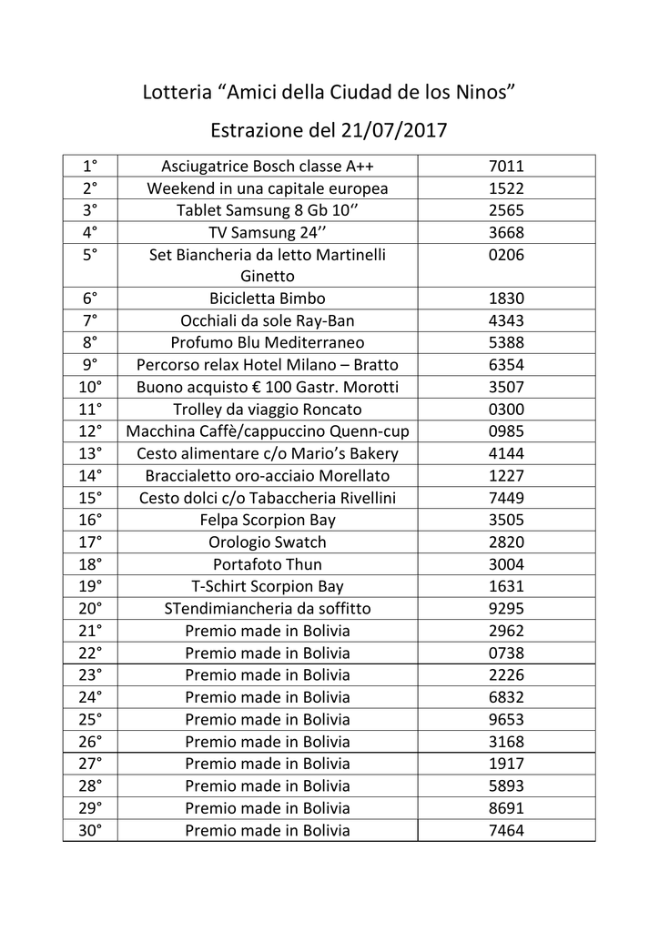 Lotteria “Amici della Ciudad de los Ninos” Estrazione del 21/07/2017 1° 2° 3° 4° 5° 6° 7° 8° 9° 10° 11° 12° 13° 14° 15° 16° 17° 18° 19° 20° 21° 22° 23° 24° 25° 26° 27° 28° 29° 30° Asciugatrice Bosch classe A++ Weekend in una capitale europea Tablet Samsung 8 Gb 10‘’ TV Samsung 24’’ Set Biancheria da letto Martinelli Ginetto Bicicletta Bimbo Occhiali da sole Ray-Ban Profumo Blu Mediterraneo Percorso relax Hotel Milano – Bratto Buono acquisto € 100 Gastr. Morotti Trolley da viaggio Roncato Macchina Caffè/cappuccino Quenn-cup Cesto alimentare c/o Mario’s Bakery Braccialetto oro-acciaio Morellato Cesto dolci c/o Tabaccheria Rivellini Felpa Scorpion Bay Orologio Swatch Portafoto Thun T-Schirt Scorpion Bay STendimiancheria da soffitto Premio made in Bolivia Premio made in Bolivia Premio made in Bolivia Premio made in Bolivia Premio made in Bolivia Premio made in Bolivia Premio made in Bolivia Premio made in Bolivia Premio made in Bolivia Premio made in Bolivia 7011 1522 2565 3668 0206 1830 4343 5388 6354 3507 0300 0985 4144 1227 7449 3505 2820 3004 1631 9295 2962 0738 2226 6832 9653 3168 1917 5893 8691 7464