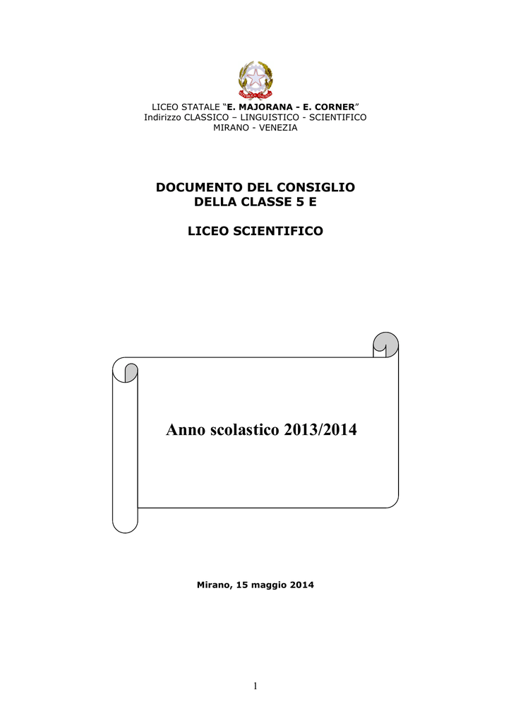 LICEO STATALE “E. MAJORANA - E. CORNER” Indirizzo CLASSICO – LINGUISTICO - SCIENTIFICO MIRANO - VENEZIA DOCUMENTO DEL CONSIGLIO DELLA CLASSE 5 E LICEO SCIENTIFICO Anno scolastico 2013/2014 Mirano, 15 maggio 2014 1 DOCUMENTO DEL CONSIGLIO DELLA CLASSE 5^ E Anno scolastico 2013-2014 1. Presentazione sintetica della classe a. Il Consiglio di Classe b. Elenco dei candidati c. Breve storia del triennio d. Continuità didattica del triennio e. Situazione di partenza della classe nell’anno in corso pag.3 pag.3 pag.4 pag.4 pag.5 2. Finalità e obiettivi trasversali a. Obiettivi trasversali cognitivi b. Obiettivi trasversali comportamentali e relazionali pag.5 pag.5 3. Conoscenze disciplinari e metodologiche a. Conoscenze, competenze e capacità raggiunte nelle varie discipline b. Metodologia didattica pag.6 pag.6 4. Viaggio d’istruzione, visite guidate, iniziative culturali, attività extracurriculari pag.6 5. Criteri di valutazione adottati pag.7 6. Simulazione di terza prova effettuate pag.8 7. Risultati raggiunti pag.9 ALLEGATO A Relazioni finali sulla programmazione relativa alle discipline dell’ultimo anno di corso Religione cattolica Lingua e Lett. Italiana Lingua e Lett. Latina Lingua straniera-Inglese Filosofia Storia Matematica Fisica Geografia generale Disegno e storia dell’arte Educazione fisica pag.10 pag.11 pag.16 pag.20 pag.24 pag.28 pag.32 pag.36 pag.41 pag.43 pag.48 ALLEGATO B Testi di simulazione di terze prove svolte durante l’anno scolastico pag.51 ALLEGATO C Griglia di valutazione della simulazione di terza prova pag.52 2 1. PRESENTAZIONE DELLA CLASSE 5 E a. Il Consiglio di Classe DOCENTE DISCIPLINA Prof.ssa Maddalena Minto Prof.ssa Giuliana Tasso Prof.ssa Giuliana Tasso Prof.ssa Maria Grazia Novello Prof. Antioco Cesare Crobeddu Prof. Antioco Cesare Crobeddu Prof. Silvio Garbin Prof. Silvio Garbin Prof. Tommaso Dalla Valle Prof.ssa Lucia Pietriboni Prof.ssa Donatella Donati Religione cattolica Lingua e letteratura italiana Lingua e letteratura latina Lingua e letteratura inglese Filosofia Storia Matematica Fisica Geografia generale Disegno e storia dell’Arte Educazione fisica Coordinatrice di Classe: Prof.ssa Giuliana Tasso b. Elenco dei Candidati 1. Barbato Valentina 2. Barbiero Francesco 3. Bragato Marco 4. Bujor Cosmin Ciprian 5. Callegari Mattia 6. De Lorenzi Giulia 7. Deppieri Alessandro 8. Frison Davide 9. Gaiani Damiano 10. Luise Alessandro 11. Mantovani Eleonora 12. Mariano Marco 13. Masato Jacopo 14. Moino Veronica 15. Pavanello Simone 16. Peretto Laura 17. Piccolo Sofia 18. Rutigliano Christian 19. Salandin Chiara 20. Salvalaio Edoardo 21. Simionato Marta 22. Tasca Ilaria 23. Vecchiato Nicolò 3 c. Breve storia del Triennio La classe, formata da 9 femmine e 14 maschi, ha avuto nel corso del triennio le seguenti configurazioni: Classe Terza Quarta Quinta Iscritti dalla Stessa classe 26 22 22 Iscritti da un’altra classe/istituto 0 2 1 Totale iscritti 26 24 23 Promossi 22 22 Non promossi 3 2 Ritirati 1 0 Come si evince dalla tabella, il numero complessivo degli studenti è diminuito di tre unità. Ci sono stati negli anni tre inserimenti di alunni provenienti da altra scuola e da altra classe, con un recupero perciò rispetto ai numeri di partenza delle classi. Le relazioni all’interno del gruppo sono rimaste caratterizzate talvolta da un clima disturbato e non sempre collaborativo, come pure il rapporto con i docenti. I genitori e i loro rappresentanti tuttavia hanno seguito con interesse e partecipazione il percorso di studi dei propri figli. Alcuni studenti hanno preso parte alle attività di approfondimento extracurricolari offerte dai diversi settori disciplinari, scegliendo quelle che sentivano più confacenti alle proprie attitudini. Da un punto di vista prettamente scolastico la classe non è mai stata omogenea: è presente un gruppo con buone capacità, motivato, mentre un altro ha evidenziato un metodo di lavoro discontinuo o poco proficuo. Un altro gruppo ha maturato nel corso degli anni interesse e consapevolezza rispetto al dialogo educativo, migliorando in generale il profitto, pur con il persistere di qualche fragilità. d. Continuità didattica nel triennio L’avvicendamento dei docenti nel corso del triennio è descritto dalla seguente tabella DISCIPLINA Religione cattolica Lingua e Lett. italiana Lingua e Lett.latina Inglese Filosofia Storia Matematica Fisica Geografia generale scienze Disegno e storia dell’Arte Educazione fisica Classe terza Maddalena Minto Giuliana Tasso Classe Quarta Maddalena Minto Giuliana Tasso Classe Quinta Maddalena Minto Giuliana Tasso Giuliana Tasso Maria Grazia Novello Antioco Cesare Crobeddu Antioco Cesare Crobeddu Loretta Reato Loretta Reato Tommaso Dalla Valle Dora Trapani Giuliana Tasso Maria Grazia Novello Antioco Cesare Crobeddu Antioco Cesare Crobeddu Silvio Garbin Silvio Garbin Tommaso Dalla Valle Concetta Bongiovanni Donatella Donati Giuliana Tasso Maria Grazia Novello Antioco Cesare Crobeddu Antioco Cesare Crobeddu Silvio Garbin SilvioGarbin Tommaso Dalla Valle Lucia Pietriboni Giorgio Citton 4 Donatella Donati e. Situazione di partenza della classe nell’anno in corso All’inizio dell’anno scolastico la classe appariva suddivisa in tre gruppi: il meno consistente numericamente, formato da alunni motivati, impegnati ed autonomi nello studio, con una preparazione buona o ottima in tutte le discipline; un secondo gruppo, caratterizzato da alunni sostanzialmente impegnati e partecipi, ma con qualche difficoltà di applicazione o rendimento in alcune discipline; un terzo gruppo costituito da studenti con un livello di conoscenze e competenze non sempre adeguato agli obiettivi didattici, a causa di lacune pregresse, mai completamente colmate o di un metodo di lavoro poco efficace. 2. FINALITA’ ED OBIETTIVI TRASVERSALI a. Obiettivi trasversali cognitivi • Conoscere i contenuti fondamentali delle singole discipline • Potenziare il metodo di studio: raggiungere una migliore capacità di