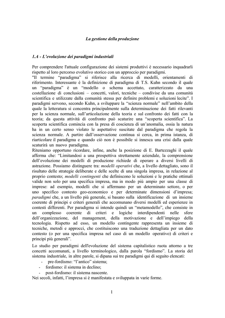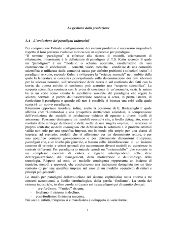 La gestione della produzione 1.A - L’evoluzione dei paradigmi industriali Per comprendere l'attuale configurazione dei sistemi produttivi è necessario inquadrarli rispetto al loro percorso evolutivo storico con un approccio per paradigmi. "Il termine “paradigma” si riferisce alla ricerca di modelli, orientamenti di riferimento. Interessante è la definizione di paradigma di T.S. Kuhn secondo il quale un “paradigma” è un “modello o schema accettato, caratterizzato da una costellazione di conclusioni – concetti, valori, tecniche – condivise da una comunità scientifica e utilizzate dalla comunità stessa per definire problemi e soluzioni lecite”. I paradigmi servono, secondo Kuhn, a sviluppare la “scienza normale” nell’ambito della quale la letteratura si concentra principalmente sulla determinazione dei fatti rilevanti per la scienza normale, sull’articolazione della teoria e sul confronto dei fatti con la teoria; da questa attività di confronto può scaturire una “scoperta scientifica”. La scoperta scientifica comincia con la presa di coscienza di un’anomalia, ossia la natura ha in un certo senso violato le aspettative suscitate dal paradigma che regola la scienza normale. A partire dall’osservazione continua si cerca, in prima istanza, di riarticolare il paradigma e quando ciò non è possibile si innesca una crisi dalla quale scaturirà un nuovo paradigma. Riteniamo opportuno ricordare, infine, anche la posizione di E. Bartezzaghi il quale afferma che: “Limitandosi a una prospettiva strettamente aziendale, la comprensione dell’evoluzione dei modelli di produzione richiede di operare a diversi livelli di astrazione. Possiamo distinguere tra: modelli operativi che, a livello dettagliato, sono il risultato delle strategie deliberate e delle scelte di una singola impresa, in relazione al proprio contesto; modelli contingenti che definiscono le soluzioni e le pratiche ottimali valide non solo per una specifica impresa, ma in modo più ampio per una classe di imprese: ad esempio, modelli che si affermano per un determinato settore, o per uno specifico contesto geo-economico e per determinate dimensioni d’impresa; paradigmi che, a un livello più generale, si basano sulla identificazione di un insieme coerente di principi e criteri generali che accomunano diversi modelli ed esperienze in contesti differenti. Per paradigma si intende quindi un “metamodello”, che consiste in un complesso coerente di criteri e logiche interdipendenti nelle sfere dell’organizzazione, del management, della motivazione e dell’impiego della tecnologia. Rispetto ad esso, un modello contingente rappresenta un insieme di tecniche, metodi e approcci, che costituiscono una traduzione dettagliata per un dato contesto (o per una specifica impresa nel caso di un modello operativo) di criteri e principi più generali”. Lo studio per paradigmi dell'evoluzione del sistema capitalistico ruota attorno a tre concetti accomunati, a livello terminologico, dalla parola “fordismo”. La storia del sistema industriale, in altre parole, si dipana sui tre paradigmi qui di seguito elencati: - pre-fordismo: “l’antico” sistema; - fordismo: il sistema in declino; - post-fordismo: il sistema nascente. Nei secoli, infatti, l’impresa si è manifestata e sviluppata in varie forme. 1 Il periodo pre-fordista: l’impresa manifatturiera Il paradigma pre-fordista equivale alla prima e più semplice forma di organizzazione della produzione, vale a dire al modello dell’impresa artigiana. Volendo collocare tale fenomeno in un orizzonte temporale, possiamo affermare che ci troviamo nel periodo del primo capitalismo, normalmente definito mercantile, situato tra il declino del sistema feudale e l’avvento della prima rivoluzione industriale. Dapprima è il mercante-capitalista a fornire all’artigiano le materie prime e a commissionargli, dietro pagamento, la trasformazione di queste in prodotti finiti. In una fase successiva, invece, il mercante-capitalista acquista anche la proprietà degli strumenti e spesso della bottega e assume lavoranti in proprio. Il lavoratore non vende più un prodotto finito al mercante, bensì la sua capacità lavorativa. L'industria tessile è una delle prime incarnazioni del nuovo modo di produrre. Alcuni situano l’inizio del paradigma in questione proprio in questa fase storica, ossia nel momento della nascita del cosiddetto “modello inglese”, inteso come il modello di impresa e di capitalismo industriale che si afferma con la rivoluzione industriale in Gran Bretagna. In questo momento storico l’industrializzazione riguarda esclusivamente questo Paese e la tecnologia è abbastanza semplice da essere incorporata in una macchina, il cui valore è abbastanza contenuto da poter essere finanziato da singoli imprenditori. Il modello d’impresa tipico di questa prima fase dello sviluppo industriale è caratterizzato da un’elevata semplicità. La struttura organizzativa è ridotta ai minimi termini ed è praticamente impossibile parlare di funzioni aziendali giacché è lo stesso imprenditore ad avere il controllo di tutta, o quasi, l’impresa (al più si serve di pochi collaboratori). Da un punto di vista tecnologico, l'elemento dominante è l’incorporazione della tecnologia moderna in macchine “isolate”, ossia disgiunte fisicamente e spazialmente tra loro, tali da poter essere considerate unità separate di capitale. Si tratta, come si vede, di un modello elementare di impresa, centrata sulla connessione macchina-imprenditore- mercato. Il periodo fordista: la produzione di massa Le condizioni osservabili durante il periodo pre-fordista cessano di esistere dal momento in cui si affermano le tecniche di produzione ispirate da Taylor e Ford, ossia dal momento in cui viene in essere l’impresa moderna. Motore principale ed elemento cardine del nuovo paradigma può a tutti gli effetti essere considerato il progresso tecnico. Grazie all’uso di una 