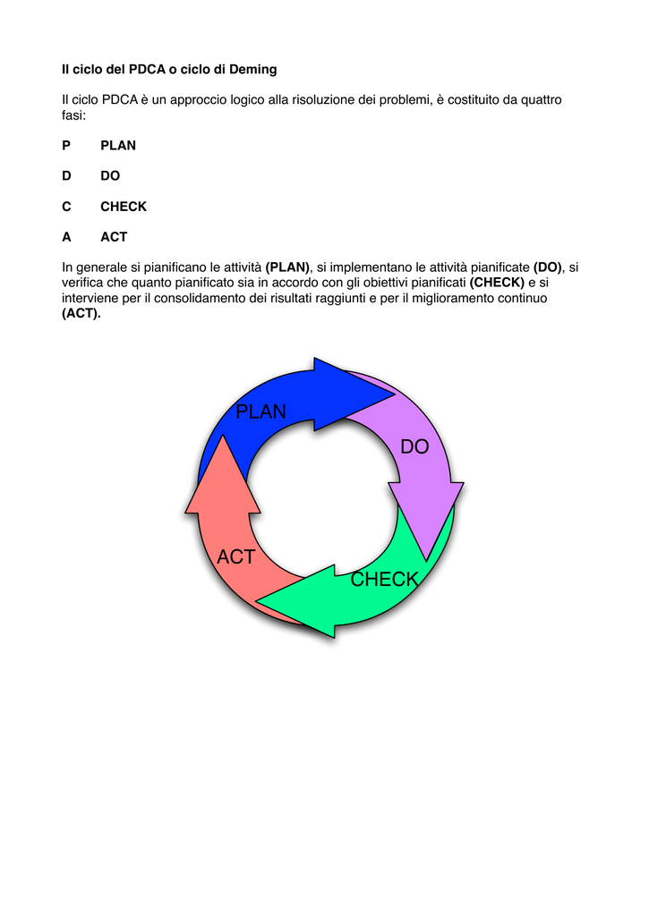 Il ciclo del PDCA o ciclo di Deming Il ciclo PDCA è un approccio logico alla risoluzione dei problemi, è costituito da quattro fasi: P! PLAN D! DO C! CHECK A! ACT In generale si pianificano le attività (PLAN), si implementano le attività pianificate (DO), si verifica che quanto pianificato sia in accordo con gli obiettivi pianificati (CHECK) e si interviene per il consolidamento dei risultati raggiunti e per il miglioramento continuo (ACT). PLAN DO ACT CHECK