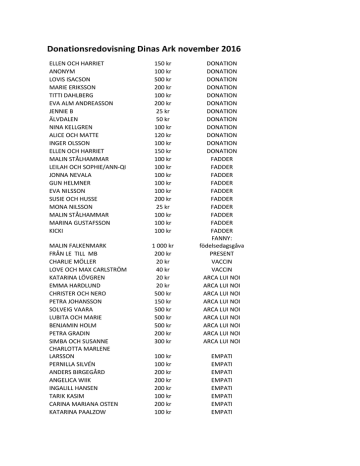 Donationsredovisning Dinas Ark november 2016 ELLEN OCH HARRIET ANONYM LOVIS ISACSON MARIE ERIKSSON TITTI DAHLBERG EVA ALM ANDREASSON JENNIE B ÄLVDALEN NINA KELLGREN ALICE OCH MATTE INGER OLSSON ELLEN OCH HARRIET MALIN STÅLHAMMAR LEILAH OCH SOPHIE/ANN-QI JONNA NEVALA GUN HELMNER EVA NILSSON SUSIE OCH HUSSE MONA NILSSON MALIN STÅLHAMMAR MARINA GUSTAFSSON KICKI 150 kr 100 kr 500 kr 200 kr 100 kr 200 kr 25 kr 50 kr 100 kr 120 kr 100 kr 150 kr 100 kr 100 kr 100 kr 100 kr 100 kr 200 kr 25 kr 100 kr 100 kr 100 kr MALIN FALKENMARK FRÅN LE TILL MB CHARLIE MÖLLER LOVE OCH MAX CARLSTRÖM KATARINA LÖVGREN EMMA HARDLUND CHRISTER OCH NERO PETRA JOHANSSON SOLVEIG VAARA LUBITA OCH MARIE BENJAMIN HOLM PETRA GRADIN SIMBA OCH SUSANNE CHARLOTTA MARLENE LARSSON PERNILLA SILVÉN ANDERS BIRGEGÅRD ANGELICA WIIK INGALILL HANSEN TARIK KASIM CARINA MARIANA OSTEN KATARINA PAALZOW 1 000 kr 200 kr 20 kr 40 kr 20 kr 20 kr 500 kr 150 kr 500 kr 500 kr 500 kr 200 kr 300 kr DONATION DONATION DONATION DONATION DONATION DONATION DONATION DONATION DONATION DONATION DONATION DONATION FADDER FADDER FADDER FADDER FADDER FADDER FADDER FADDER FADDER FADDER FANNY: födelsedagsgåva PRESENT VACCIN VACCIN ARCA LUI NOI ARCA LUI NOI ARCA LUI NOI ARCA LUI NOI ARCA LUI NOI ARCA LUI NOI ARCA LUI NOI ARCA LUI NOI ARCA LUI NOI 100 kr 100 kr 200 kr 200 kr 200 kr 100 kr 200 kr 100 kr EMPATI EMPATI EMPATI EMPATI EMPATI EMPATI EMPATI EMPATI CARINA CEDERHOLM FANNY FALKENMARK ELSA BRATTLUND MARIELLE JENSEN SUSANNE SKÖLD CAMILLA PAKKA ÅSA STARK ULRIKA ANDERSSON NICOLE PERNKLINT KIA OLOFSON GERARD MUL BIRGITTA STENBERG ANNA-LENA OSKARSSON MADELENE EZEYZA-ALVEAR ÅSA VELANDER LOTTA ÖSTLUND KATARINA WILLERS CHRISTER LIND MARTINA GNEWSKI ANN-QI NORD THOMPSON MATILDA BJÖRKEFALL MARIA WITTFELDT SUSANNA WAJNER GUSTAF ÖSTBERG DANIELLA JANSBY LISA MARTINSSON AMANDA WELLER PAMELA JEROCHIN CARINA BRANDT MALIN SÖDERSTRÖM IRENA OREL ANETTE HAGSTRÖM MICHAELA GUSTAVSSON EVA BERGIUS JENNY GUSTAFSSON PAYPAL KAROLINA SVENSSON MARIA TELL ANN-CHARLOTTE ERIKSSON BARBRO MOHLNE NILSSON PIA ÖHLIN INGEGERD ERIKSSON TOTALSUMMA 100 kr 150 kr 500 kr 200 kr 200 kr 100 kr 100 kr 200 kr 100 kr 100 kr 200 kr 50 kr 200 kr 100 kr 30 kr 200 kr 50 kr 200 kr 150 kr 100 kr 50 kr 100 kr 50 kr 100 kr 50 kr 50 kr 300 kr 100 kr 150 kr 200 kr 100 kr 100 kr 100 kr 250 kr 100 kr 102 kr 100 kr 100 kr 100 kr 200 kr 100 kr 13 502 kr EMPATI RILEY RILEY RILEY RILEY RILEY RILEY RILEY RILEY RILEY RILEY RILEY RILEY RILEY RILEY RILEY RILEY RILEY RILEY RILEY RILEY RILEY RILEY RILEY RILEY RILEY RILEY RILEY RILEY RILEY RILEY RILEY RILEY RILEY RILEY RILEY RILEY RILEY RILEY RILEY RILEY