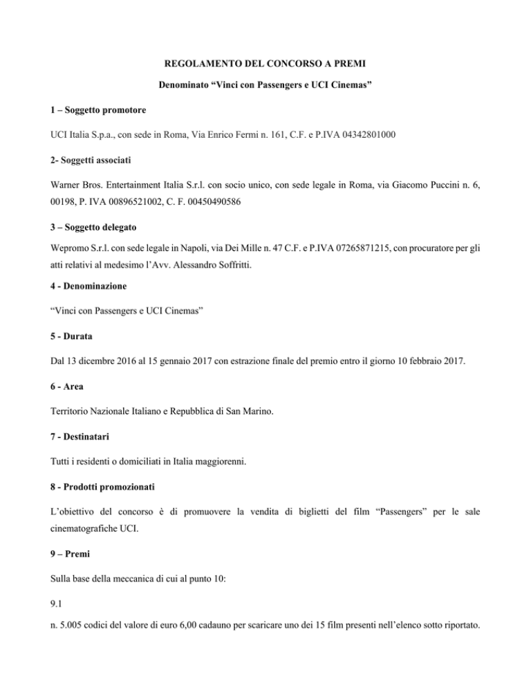 REGOLAMENTO DEL CONCORSO A PREMI Denominato “Vinci con Passengers e UCI Cinemas” 1 – Soggetto promotore UCI Italia S.p.a., con sede in Roma, Via Enrico Fermi n. 161, C.F. e P.IVA 04342801000 2- Soggetti associati Warner Bros. Entertainment Italia S.r.l. con socio unico, con sede legale in Roma, via Giacomo Puccini n. 6, 00198, P. IVA 00896521002, C. F. 00450490586 3 – Soggetto delegato Wepromo S.r.l. con sede legale in Napoli, via Dei Mille n. 47 C.F. e P.IVA 07265871215, con procuratore per gli atti relativi al medesimo l’Avv. Alessandro Soffritti. 4 - Denominazione “Vinci con Passengers e UCI Cinemas” 5 - Durata Dal 13 dicembre 2016 al 15 gennaio 2017 con estrazione finale del premio entro il giorno 10 febbraio 2017. 6 - Area Territorio Nazionale Italiano e Repubblica di San Marino. 7 - Destinatari Tutti i residenti o domiciliati in Italia maggiorenni. 8 - Prodotti promozionati L’obiettivo del concorso è di promuovere la vendita di biglietti del film “Passengers” per le sale cinematografiche UCI. 9 – Premi Sulla base della meccanica di cui al punto 10: 9.1 n. 5.005 codici del valore di euro 6,00 cadauno per scaricare uno dei 15 film presenti nell’elenco sotto riportato. Per poter scaricare uno dei film in elenco i vincitori dovranno andare sulla landing page dedicata raggiungibile dal sito https://it.chili.tv/ , registrarsi e inserire il codice ricevuto e scegliere il film da scaricare obbligatoriamente entro il termine ultimo del 31 marzo 2017. È scaricabile solo uno di questi film: 1. 2. 3. 4. 5. 6. 7. 8. 9. 10. 11. 12. 13. After Earth Elysium Gattaca District Nine 2012 Men in Black Men in Black 3 Battle: Los Angeles Hancock Terminator Salvation Total Recall Air Chappie 9.2 n. 10 Coppie Survival Kit Cover Store dal valore di euro 100,00 cadauna; 9.3 n. 1 viaggio per due persone maggiorenni di 7 giorni / 6 notti a Kranjska Gora in Slovenia del valore indicativo di euro 1.666,00 comprendente: 1. Pernottamento in camera doppia in albergo di categoria 4 stelle 2. Volo a/r da Roma o Milano a Klagenfurt 3. Trasferimenti dall’aeroporto all’albergo e viceversa 4. Trattamento di pensione completa 5. Nuoto nelle piscine con acqua del ghiacciaio e nuotata notturna inclusa (solo nel fine settimana) 6. 1 ingresso giornaliero a persona alla sauna e uso del bagno glaciale, Massaggio di 30 minuti con pietre glaciali con relax dopo il massaggio con tè 7. Utilizzo accessori (accappatoio e ciabattine) 8. Programma di animazione in montagna: nordic walking, ciclismo, meditazione 9. Ingresso al Casino Larix e Casinò Korona 10. Il viaggio sarà fruibile entro il 30 novembre 2017 ad esclusione di ponti festività e del mese di agosto 9.4 I vincitori non possono contestare il premio assegnato, né richiedere il valore corrispondente in denaro o il cambio/sostituzione per nessun motivo. Tuttavia, nel caso in cui il Promotore non sia in grado di consegnare il premio vinto, si riserva il diritto di sostituire il premio annunciato con premio di valore uguale o superiore (circ. 28/3/2002 punto 9.6) I vincitori non possono richiedere alcuna indennità in seguito a danni conseguenti dall’accettazione e/o dall’uso del premio. . 10 – Modalità di partecipazione 10.1 Per prendere parte all’assegnazione dei premi di cui al punto 9.1, il partecipante dovrà acquistare un biglietto, per la visione del film “Passengers” esclusivamente attraverso i canali di vendita online di UCI CINEMAS o tramite la apposita applicazione UCI CINEMAS ITALIA per dispositivi mobili dalle 00.00 del 13 dicembre 2016 alle 23.59 del 15 gennaio 2017. Il partecipante riceverà un codice univoco denominato codice promo SF all’indirizzo email indicato in fase di registrazione; dovrà quindi collegarsi al sito www.passengers.ucicinemas.it, fornire i dati personali richiesti e registrare il codice del biglietto acquistato, entro il termine perentorio delle ore 23.59 del 20 gennaio 2017. 10.2 Per prendere parte all’assegnazione dei premi di cui al punto 9.2, il partecipante dovrà semplicemente registrarsi sull’apposito form al sito www.passengers.ucicinemas.it, e fornire i dati personali richiesti. 10.3 Per prendere parte all’assegnazione del premio di cui al punto 9.3, il partecipante dovrà acquistare un biglietto, per la visione del film “Passengers” tramite i canali di vendita di UCI CINEMAS dalle 00.00 del 13 dicembre 2016 alle 23.59 del 15 gennaio 2017. Con il codice SF che si troverà sul biglietto acquistato presso le casse di un cinema UCI CINEMAS, ovvero che verrà inviato tramite e-mail di conferma a tutti coloro che compreranno un biglietto del film “Passengers” mediante canali telematici (sito internet e applicazioni per smartphone), il partecipante potrà completare la registrazione sull’apposito form della manifestazione a premi raggiungibile attraverso il sito www.passengers.ucicinemas.it, inserendo il codice stesso nonché tutti i dati personali richiesti, entro il termine perentorio delle ore 23.59 del 20 gennaio 2017. 10.4 La Società Promotrice si riserva il diritto di escludere dalla partecipazione coloro che, a proprio insindacabile giudizio, abbiano violato le disposizioni del presente regolamento; 11- Modalità di assegnazione dei premi 11.1 Modalità rush & win I primi 5.000 partecipanti che completeranno tutte le operazioni di cui al punto 9, riceveranno un codice per scaricare uno dei film di cui al premio 9.1 11.2 Estrazione a recupero In forma casuale ed elettronica verranno inoltre sorteggiati 5 partecipanti fra quelli che avranno correttamente compiuto tutte le operazioni di cui al punto 10, e che non saranno risultati vincitori di un premio ai sensi dell’art. 11.1, che saranno i vincitori dei rimanenti 5 premi di cui al punto 9.1; verranno anche estratti 3 vincitori di riserva. I vincitori verranno avvisati mediante indirizzo di posta elettronica registrato al momento della registrazione. I vincitori dovranno trasmettere la loro accettazione entro e non ol