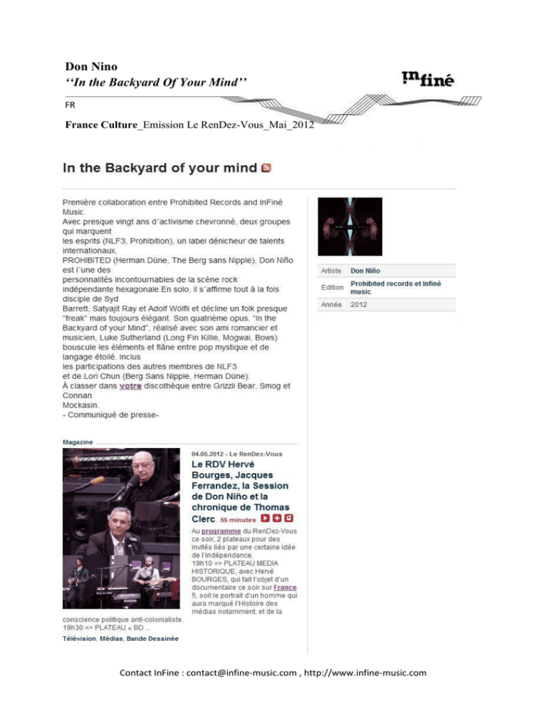 Don Nino ‘‘In the Backyard Of Your Mind’’ FR France Culture_Emission Le RenDez-Vous_Mai_2012 Contact InFine : [email protected] , http://www.infine-music.com http://www.franceculture.fr/emission-le-rendez-vous-le-rdv-herve-bourges-jacques-ferrandez-lasession-de-don-nino-et-la-chroniqu Contact InFine : [email protected] , http://www.infine-music.com