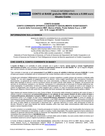 FOGLIO INFORMATIVO CONTO di BASE gratuito ISEE inferiore a 8.000 euro Giusto Conto CONTO DI BASE CONTO CORRENTE OFFERTO A SOGGETTI SOCIALMENTE SVANTAGGIATI ai sensi della Convenzione MEF, Banca d’Italia, Poste Italiane S.p.a. e AIIP (art. 12 D. Legge 201/2011) INFORMAZIONI SULLA BANCA BANCA DI CREDITO COOPERATIVO DI LOCOROTONDO Cassa Rurale ed Artigiana - Società Cooperativa Piazza Marconi, 28 - 70010 Locorotondo (BA) Tel.: 0804351311 - Fax: 0804316601 E-mail: [email protected] - Sito internet: www.bcclocorotondo.it Registro delle Imprese della CCIAA di Bari n. 00369440722 Iscritta all’Albo della Banca d’Italia n. 4494 - cod. ABI 08607 Iscritta all’Albo delle società cooperative n. A169020 Aderente al Fondo Nazionale di Garanzia, al Fondo di Garanzia dei Depositanti del Credito Cooperativo e al Fondo di Garanzia dei Portatori di Titoli Obbligazionari emessi da Banche appartenenti al Credito Cooperativo CHE COS'È IL CONTO CORRENTE DI BASE? Il Conto di Base è un contratto di conto corrente con il quale il cliente, senza spese e senza l’applicazione dell’imposta di bollo, può compiere il numero di operazioni annue di cui alla tabella “A” qui di seguito allegata, per i servizi indicati e le relative eventuali scritturazioni contabili. Tale contratto è riservato ai soli consumatori il cui ISEE in corso di validità è inferiore ad euro 8.000,00. Il conto di base può essere cointestato solo ai componenti del nucleo familiare sulla cui base è stato calcolato l’ISEE. Il cliente può richiedere l’effettuazione di operazioni in numero superiore a quelle incluse nel canone e indicate nella Tabella “A”, ma sarà soggetto al pagamento di costi ulteriori, come meglio specificato nelle successive Condizioni Economiche. Le giacenze sul Conto di Base non sono remunerate. La Banca non fornisce al titolare del Conto di Base altre tipologie di servizi o servizi accessori diversi da quelli indicati nella tabella “A” allegata, ad eccezione del servizio di conversione valutaria e, se ritenuto, l’emissione o il collocamento di strumenti di moneta elettronica (es. carta prepagata). In particolare, la banca si astiene dall’autorizzare alcun tipo di scoperto di conto e non esegue un ordine di pagamento che comporti un saldo negativo per il cliente. In caso di eventuali situazioni di incapienza, la Banca può disporre il blocco del conto fino al ripristino dei fondi necessari alla regolarizzazione di partite a debito. Ogni cliente può essere titolare di un solo Conto di Base. Al momento della richiesta di apertura del conto di base, il cliente è tenuto a presentare un’autocertificazione in cui attesta di non essere titolare di altro conto di base e l’autocertificazione attestante il proprio ISEE in corso di validità. Il titolare del conto di base è tenuto inoltre a presentare entro il 31 maggio di ogni anno l’autocertificazione attestante il proprio ISEE in corso di validità. In mancanza di tale attestazione entro il predetto termine, o se l’ISEE attestato è pari o superiore all’importo di 8.000,00 euro, il cliente perde l’esenzione dalle spese e dall’imposta di bollo e la banca addebiterà il canone omnicomprensivo del conto di base offerto ai consumatori a decorrere dal 1° gennaio dell’anno in corso, oltre all’imposta di bollo se dovuta. Rimane in ogni caso facoltà del cliente recedere entro due mesi dalla comunicazione della banca senza spese e senza imposta di bollo. Il conto corrente è un prodotto sicuro. Il rischio principale è il rischio di controparte, cioè l’eventualità che la banca non sia in grado di rimborsare al correntista, in tutto o in parte, il saldo disponibile. Per questa ragione la banca aderisce al sistema di garanzia denominato Fondo di Garanzia dei Depositanti del Credito Cooperativo, che assicura a ciascun correntista una copertura fino a 100.000,00 euro. Altri rischi possono essere legati allo smarrimento o al furto della carta di debito, ma sono anche ridotti al minimo se il correntista osserva le comuni regole di prudenza e attenzione. Il Conto di Base è stipulato ai sensi della Convenzione, sottoscritta il 28 marzo 2012 tra MEF, Banca d’Italia, ABI, Poste Italiane S.p.A. e Associazione Italiana Istituti di pagamento e di moneta elettronica (AIIP), come successivamente modificata, disponibile sul sito www.dt.tesoro.it. FOGLIO INFORMATIVO - Aggiornato al: 01/10/2016 (ZF/000003453) Pagina 1 di 9 Per saperne di più: La Guida pratica al conto corrente, che orienta nella scelta del conto, è disponibile sul sito www.bancaditalia.it, presso tutte le filiali della banca e sul sito della banca www.bcclocorotondo.it. TABELLA “A” Tipologie di servizi inclusi nel canone gratuito del "Conto di base" Elenco movimenti Prelievo contante allo sportello Prelievo tramite ATM del prestatore di servizi di pagamento o del suo Gruppo, sul territorio nazionale Prelievo tramite ATM di altro prestatore di servizi di pagamento sul territorio nazionale Operazioni di addebito diretto nazionale o addebito diretto Sepa Pagamenti ricevuti tramite bonifico nazionale o Sepa (incluso accredito stipendio o pensione) Pagamenti ricorrenti tramite bonifico nazionale o Sepa effettuati con addebito in conto Pagamenti effettuati tramite bonifico nazionale o SEPA con addebito in conto Versamenti contanti e versamenti assegni Comunicazioni da trasparenza (incluso spese postali) Invio informativa periodica (estratti conto e documento di sintesi) (incluso spese postali) Operazioni di pagamento attraverso carta di debito Emissione, rinnovo e sostituzione carta di debito N.ro operazioni 6 6 Illimitate 12 Illimitate 36 12 6 12 1 4 Illimitate 1 CONDIZIONI ECONOMICHE QUANTO PUÒ COSTARE IL CONTO CORRENTE Indicatore Sintetico di Costo (ISC) PROFILO SPORTELLO ONLINE Conto di Base gratuito per soggetti con ISEE inferiore a 8.000 euro € € 0,00 0,00 QUANTO PUÒ COSTARE IL FIDO Servizio non previsto. Le condizioni riportate nel presente foglio informativo inclu