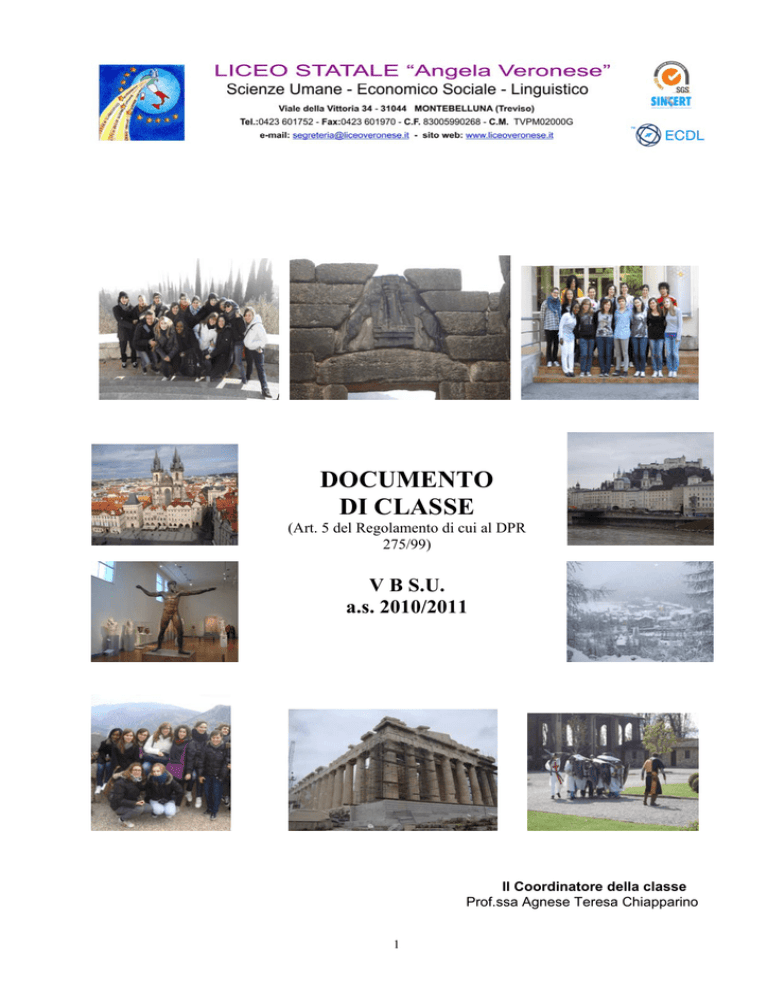 DOCUMENTO DI CLASSE (Art. 5 del Regolamento di cui al DPR 275/99) V B S.U. a.s. 2010/2011 Il Coordinatore della classe Prof.ssa Agnese Teresa Chiapparino 1 INDICE Elenco docenti Elenco studenti 3 4 PARTE PRIMA • Introduzione • Contesto socio-economico • Bacino di utenza • Attività culturali integrative 5 5 6 6 PARTE SECONDA • Finalità e obiettivi generali • Capacità e competenze 7 7 PARTE TERZA • Criteri e strumenti di valutazione • Criteri di valutazione del colloquio 9 11 PARTE QUARTA • Storia e profilo della classe • Attività integrative para ed extrascolastiche • Lo stage • Programmazione del Consiglio di Classe • Approfondimenti personali • Attività preparatoria alle prove d’esame • Programmi svolti Appendici 12 13 14 15 16 17 18 51 2 ELENCO DOCENTI DELLA CLASSE V B LICEO DELLE SCIENZE UMANE COGNOME NOME MATERIA D’INSEGNAMENTO SABBADIN SILVANO Religione CHIAPPARINO AGNESE TERESA Italiano – Latino – Storia SPADONI CINZIA Lingua straniera inglese MATTIOLI DARIO Filosofia FEDELE FLAMINIA Psicologia DAL PIO SONIA Matematica ZANNONI MAURA Scienze sperimentali PARONETTO MARTA Storia dell’Arte VENICA EMANUELA Educazione fisica 3 FIRMA ELENCO STUDENTI CLASSE V B LICEO DELLE SCIENZE UMANE COGNOME NOME FIRMA 1 ABABIO PRISCILLA MENSAH 2 BASEI STEFANO 3 BIANCHINI MARGHERITA 4 BORDIN LINDA 5 CALZAMATTA ANNALISA 6 COVOLAN ANDREA 7 DARSIE’ GIULIA 8 DARSIE’ LAURA 9 DURANTE GIULIA 10 FLORA ILARIA 11 MORO GIULIA 12 POZZOBON VALENTINA 13 PROSDOCIMI TANIA 14 SANTOLIN LAURA 15 VALENTE GIANMARCO 16 ZANIOL VERONICA 4 DOCUMENTO DEL CONSIGLIO DI CLASSE Anno Scolastico 2010/2011 PARTE PRIMA Descrizione della scuola e del contesto ambientale (territorio e sue caratteristiche) Introduzione L'Istituto ha cominciato ad operare a Montebelluna nell'anno scolastico 1966/67 come sezione staccata dell'Istituto magistrale "Duca degli Abruzzi" di Treviso. Nell'anno scolastico successivo (1967/68) ha ottenuto l'autonomia da Treviso; gli organi collegiali hanno quindi scelto la denominazione "Angela Veronese" in omaggio ad una poetessa locale del XVIII secolo. L’Istituto vanta una lunga storia di innovazione e sperimentazione didattica. Dopo aver avviato il nuovo corso quinquennale del Liceo Pedagogico-sociale in sostituzione delle vecchie magistrali, ha iniziato la sperimentazione del nuovo Indirizzo Linguistico Brocca. Con l’introduzione della legge sull’Autonomia delle Istituzioni scolastiche (1999) l’Istituto ha avviato tre nuovi indirizzi, i cui programmi sono stati progettati dagli insegnanti stessi, tenendo conto delle esperienze di sperimentazione: il Liceo Linguistico Autonomo, il Liceo delle Scienze Sociali e il Liceo delle Scienze Umane. I tre indirizzi sono ormai tutti a regime. L’Istituto ha sempre investito per offrire agli studenti attrezzature tecnologiche aggiornate, e il corpo insegnante si contraddistingue per il notevole livello di conoscenza e uso delle nuove tecnologie. Contesto socio economico La scuola si colloca in un territorio particolarmente ricco sotto il profilo artigianale e industriale, che però vive in questo momento tutte le difficoltà e le contraddizioni in cui si dibatte l’intero Paese. Settori industriali (tessile, calzature, eccetera) che per anni hanno conosciuto una crescita continua e apparentemente senza limiti sono ora messi in crisi dal fenomeno della delocalizzazione e dalla concorrenza internazionale, basata su bassi costi del lavoro. Questo momento di passaggio rappresenta una sfida importante per il sistema dell’istruzione superiore. La riconversione produttiva del nostro territorio e dell’intero Paese non potrà prescindere, infatti, da consistenti investimenti privati e pubblici in ricerca e sviluppo e da un generale innalzamento dei livelli culturali dei giovani che si immettono sul mercato del lavoro. Da questo punto di vista, la scelta delle famiglie di investire su una scolarità di alto livello, aperta a tutte le facoltà universitarie, non appare frutto di una moda passeggera: un alto livello di istruzione, infatti, garantisce la necessaria flessibilità per inserirsi in un mercato del lavoro in veloce cambiamento, i cui bisogni, negli 8-10 anni che trascorrono tra l’iscrizione di uno studente al primo anno di corso e l’inserimento effettivo al termine degli studi universitari o postdiploma, sono difficili da prevedere. L’Istituto Veronese ha dunque saputo “intercettare” negli ultimi anni una domanda presente nel territorio di una scuola di tipo liceale, in grado di fornire la preparazione di base necessaria all’accesso universitario. A questo proposito, sulla base degli ultimi dati emersi dall’indagine Pisa (Programme for International Student Assessment) relativi all’anno 2003, il basso livello di competenze raggiunto dagli studenti italiani nei confronti internazionali risulta in realtà da una media tra tutti i tipi di scuola. Se si analizzano separatamente i dati relativi ai Licei, specie del Nord Est, si scopre che gli studenti italiani conseguono obiettivi che non hanno nulla da invidiare a quelli degli studenti finlandesi o coreani, che risultano essere i più brillanti. Naturalmente la scuola deve impegnarsi a corrispondere alle aspettative di alti livelli di 5 preparazione e di qualità della formazione impartita insiti nella propria qualificazione liceale. Coerentemente con questa visione, l’Istituto si sta impegnando anche nel campo della formazione post-diploma, ed ha già organizzato due corsi IFTS (Formazione Tecnico Professionale Superiore Integrata), uno per la preparazione della figura professionale di Webmaster (2002) e uno per la preparazione della figura professionale di Officer for Immigration (2003-2004). Bacino di utenza Il bacino di utenza è molto vasto (con un raggio di circa 40 km), e interessa studenti provenienti da 4 province (Treviso, Belluno, Padova, Vicenza). Nella sua organizzazione e negli orari la scuola deve ovviamente tenere conto di questa cir