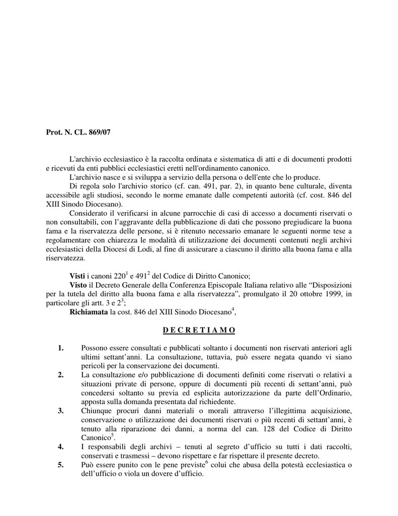 Prot. N. CL. 869/07 L'archivio ecclesiastico è la raccolta ordinata e sistematica di atti e di documenti prodotti e ricevuti da enti pubblici ecclesiastici eretti nell'ordinamento canonico. L'archivio nasce e si sviluppa a servizio della persona o dell'ente che lo produce. Di regola solo l'archivio storico (cf. can. 491, par. 2), in quanto bene culturale, diventa accessibile agli studiosi, secondo le norme emanate dalle competenti autorità (cf. cost. 846 del XIII Sinodo Diocesano). Considerato il verificarsi in alcune parrocchie di casi di accesso a documenti riservati o non consultabili, con l’aggravante della pubblicazione di dati che possono pregiudicare la buona fama e la riservatezza delle persone, si è ritenuto necessario emanare le seguenti norme tese a regolamentare con chiarezza le modalità di utilizzazione dei documenti contenuti negli archivi ecclesiastici della Diocesi di Lodi, al fine di assicurare a ciascuno il diritto alla buona fama e alla riservatezza. Visti i canoni 2201 e 4912 del Codice di Diritto Canonico; Visto il Decreto Generale della Conferenza Episcopale Italiana relativo alle “Disposizioni per la tutela del diritto alla buona fama e alla riservatezza”, promulgato il 20 ottobre 1999, in particolare gli artt. 3 e 23; Richiamata la cost. 846 del XIII Sinodo Diocesano4, DECRETIAMO 1. 2. 3. 4. 5. Possono essere consultati e pubblicati soltanto i documenti non riservati anteriori agli ultimi settant’anni. La consultazione, tuttavia, può essere negata quando vi siano pericoli per la conservazione dei documenti. La consultazione e/o pubblicazione di documenti definiti come riservati o relativi a situazioni private di persone, oppure di documenti più recenti di settant’anni, può concedersi soltanto su previa ed esplicita autorizzazione da parte dell’Ordinario, apposta sulla domanda presentata dal richiedente. Chiunque procuri danni materiali o morali attraverso l’illegittima acquisizione, conservazione o utilizzazione dei documenti riservati o più recenti di settant’anni, è tenuto alla riparazione dei danni, a norma del can. 128 del Codice di Diritto Canonico5. I responsabili degli archivi – tenuti al segreto d’ufficio su tutti i dati raccolti, conservati e trasmessi – devono rispettare e far rispettare il presente decreto. Può essere punito con le pene previste6 colui che abusa della potestà ecclesiastica o dell’ufficio o viola un dovere d’ufficio. Il presente decreto, promulgato in data odierna, entrerà in vigore il 19 gennaio 2008, solennità di San Bassiano vescovo, patrono principale della città e diocesi di Lodi. Servatis de cetero iure servandis Dato a Lodi, dalla Curia Diocesana, il 22 dicembre 2007 + Giuseppe Merisi vescovo Mons. Gabriele Bernardelli cancelliere vescovile 1 Can. 220 - Non è lecito ad alcuno ledere illegittimamente la buona fama di cui uno gode, o violare il diritto di ogni persona a difendere la propria intimità. 2 Can. 491 §1- Il Vescovo diocesano abbia cura che anche gli atti e i documenti degli archivi delle chiese cattedrali, collegiate, parrocchiali e delle altre chiese che sono presenti nel suo territorio vengano diligentemente conservati e che si compilino inventari o cataloghi in due esemplari, di cui uno sia conservato nell'archivio della rispettiva chiesa e l'altro nell'archivio diocesano. §2. Il Vescovo diocesano abbia anche cura che nella diocesi vi sia un archivio storico e che i documenti che hanno valore storico vi si custodiscano diligentemente e siano ordinati sistematicamente. §3. Per consultare o asportare gli atti e i documenti di cui ai §§1 e 2, si osservino le norme stabilite dal Vescovo diocesano. 3 Art. 3 Archivi § 1. Per gli atti e i documenti di qualunque provenienza custoditi negli archivi degli enti ecclesiastici e contenenti dati personali si applicano, in quanto compatibili, le disposizioni contenute nell’articolo precedente (cfr. articoli relativi ai “Registri” sotto riprodotti, ndr). § 2. Fatta salva la normativa canonica riguardante i registri, i dati contenuti in archivi informatici devono essere gestiti con programmi che consentano la loro immediata e agevole riproduzione in video e a stampa. Il responsabile dei registri deve garantire la sicurezza dei dati attraverso registrazione e trasferimento dei medesimi effettuati periodicamente su supporti diversi, in ogni caso inaccessibili agli estranei. L’accesso ai dati informatici deve essere tutelato, oltre che dalla sicurezza del luogo, da una chiave informatica di accesso conservata dal responsabile e periodicamente mutata; tale chiave di accesso deve essere custodita, in busta sigillata, nell’archivio del soggetto proprietario dell’archivio informatico. Art.2 Registri § 1. con il termine “registro” si intende il volume nel quale sono annotati, in successione cronologica e con indici, l’avvenuta celebrazione dei sacramenti o altri fatti concernenti l’appartenenza o la partecipazione ecclesiale. I dati contenuti nei registri possono essere raccolti anche in un archivio magnetico, comunque non sostitutivo dei medesimi registri, con l’osservanza delle disposizioni di cui all’art. 3, § 2, del presente decreto. § 2. La redazione, gestione e custodia dei registri prescritti dal diritto universale e particolare, nonché l’utilizzazione dei dati in essi contenuti, sono disciplinate, oltre che dalle vigenti disposizioni canoniche generali, dal regolamento approvato dal Consiglio Episcopale Permanente entro un anno dalla promulgazione del presente decreto. § 3. La responsabilità della tenuta dei registri spetta di norma al soggetto cui è conferito il governo dell’ente al quale i medesimi appartengono (di seguito denominato “responsabile dei registri”), salvo quanto disposto dal codice di diritto canonico o dagli statuti; allo stesso soggetto spetta vigilare sulla corretta osservanza delle disposizioni canoniche in materia e coordinare l’attività degli eventuali collaboratori. § 4. L