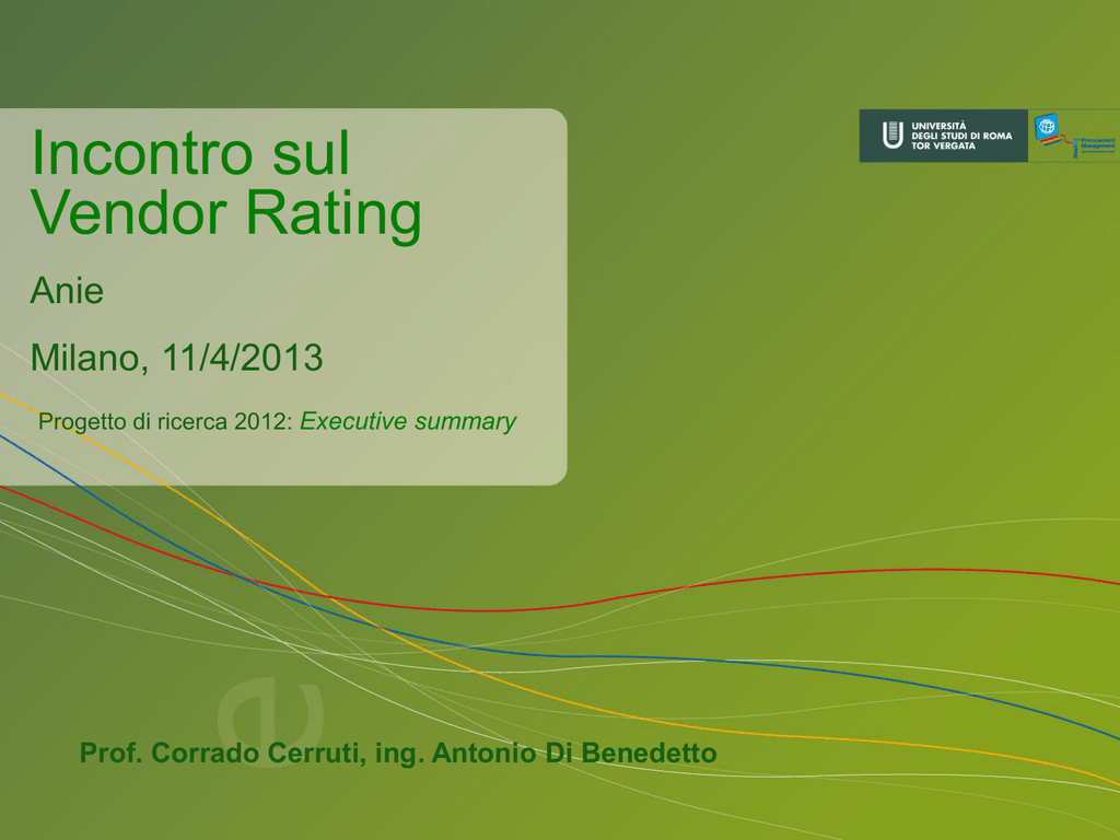 Incontro sul Vendor Rating Anie Milano, 11/4/2013 Progetto di ricerca 2012: Executive summary Prof. Corrado Cerruti, ing. Antonio Di Benedetto Indice 1. Premessa 2. Stato dell’arte sull’utilizzo del Vendor Rating 3. Modello base di V.R. operante a livello di categoria merceologica 4. Modello di V.R. globale 1. Premessa Il progetto di ricerca sul Vendor Rating prende spunto da un workshop, tenutosi presso Tor Vergata nell’ottobre 2011, finalizzato ad analizzare gli esiti di un sondaggio effettuato sul tema del Vendor Rating presso varie aziende nazionali Da tale sondaggio è emerso in sintesi che: •le logiche di Vendor Rating adottate nelle aziende nazionali manifatturiere e di servizio sono molto eterogenee, sia a livello di modelli di riferimento che soprattutto di logiche di utilizzo dei risultati •l’adozione di logiche di valutazione comuni potrebbe essere vantaggiosa sia lato committenza che lato fornitori, specie se adottate lungo l’intera supply chain, inclusi cioè gli eventuali subfornitori e subappaltatori (che risultano spesso comuni alle varie committenze). Il progetto di ricerca, svoltosi nel 2012, è stato finanziato da ANIE, ENEL, ENI, KPMG, PROCOUT, REPLY e TERNA e si è posto tre obiettivi: •Produzione di un documento di inventario dello stato dell’arte delle applicazioni di Vendor Rating •Definizione di un modello di riferimento per il Vendor Rating operante a livello di singola categoria merceologica •Definizione di un modello di riferimento di Vendor Rating operante a livello globale Al GDL di progetto hanno partecipato anche rappresentanti dell’Autorità di Vigilanza per i Contratti pubblici (AVCP). Gruppo di lavoro del progetto Team Tor Vergata Prof. Corrado Cerruti Ing. Antonio Di Benedetto Dott. Adriano Di Domenicantonio Dott.ssa Elena Innocenzi Rappresentanti delle aziende/enti partecipanti al progetto: ANIE (prof. Airaghi, dr. Gaiotti) AVCP (dr. Romano, dr.sse Alparone, Riacà) ENEL (ingg. Ucciero, Quatrana, Santarelli) ENI (ingg. Di Bello, Ferri, Zaffaroni) KPMG (dott.ri Boccia, La Gioia, Stella) PROCOUT (dott.ri La Nave, Giordano, Mazzoni) REPLY (dott.ri Savino, Sartorelli, Mezzullo) TERNA (dr.ssa Casanova) 2. Stato dell’arte sull’utilizzo del Vendor Rating Ad oltre 150 aziende, rappresentative del mondo sia della committenza che della fornitura su vari comparti merceologici e fasce di fatturato, è stato inviato un questionario articolato sui diversi aspetti progettuali e gestionali. Nella lettera di accompagnamento al questionario ci si è impegnati al vincolo della riservatezza e ad “un debriefing dei principali risultati ottenuti”. I risultati ottenuti, riportati in sintesi di seguito, vengono pertanto presentati senza associarli alle identità delle singole società. Le risposte sono pervenute da 53 aziende: committente fornitore Totale altissima alta media bassa Totale 23 30 53 26 15 10 2 53 energetico telecomunicazioni Trasporti + automotive 14 13 9 Vari (bancario/assicurativo, consulenza, farmaceutico, IT, pubblica amministrazione) 17 Totale 53 Principali risultati del sondaggio Le applicazioni di Vendor Rating sono in gran parte di recente introduzione (delle 38 aziende che lo utilizzano, il 44% posteriori al 2007), 9 aziende hanno dichiarato di non possedere un sistema di Vendor Rating e 6 aziende sono nella fase di pianificazione dello stesso . Le metodologie di V.R. vengono definite prevalentemente in ambito Direzione Acquisti, che opera come owner del processo per la maggior parte dei casi (66%), spesso in sinergia con altre funzioni aziendali (Direzione Tecnica, Qualità, Sicurezza, etc.). Le aree di valutazione più ricorrenti (90%) sono riconducibili alla Qualità tecnica (intesa come comprensiva delle valutazioni in fase di consegna e di vita utile della fornitura) e commerciale (relativa alle fasi di gestione del contratto di fornitura da parte della Direzione Acquisti). La frequenza dei monitoraggi di V.R. più ricorrente (39%) è quella semestrale. Le metodologie di V.R. vengono rese note ai fornitori in fase contrattuale in una discreta percentuale (48%), spingendosi anche al dettaglio di formule, metriche e pesi (35%). Le valutazioni elementari vengono condivise o eventualmente controfirmate dai fornitori solo in una modesta percentuale (24%) mentre i risultati finali di V.R. vengono comunicati con regolarità ai fornitori nella maggioranza dei casi (76%), prevalentemente in termini di risultati assoluti (57%) e più raramente in termini di posizionamento competitivo (11%). Gli impatti più ricorrenti dei monitoraggi di V.R. riguardano azioni di miglioramento o correttive (38%), interventi sull’Albo (22%) e introduzione nei contratti di logiche di bonus/malus legate ai risultati di V.R. (22%). Le principali difficoltà riscontrate nei monitoraggi di V.R. sono quelle legate alla tempestiva e sistematica raccolta delle valutazioni da parte dei clienti interni (43%), alle quali si pone rimedio prevalentemente agendo su sistemi informativi e semplificando i questionari di valutazione. Considerando i tre tipi di segmentazione adottati (ruolo prevalente di committente/fornitore, comparto merceologico, fascia di fatturato) non si sono riscontrate differenze significative nelle risposte ai quesiti, a meno delle seguenti: •Presenza di Vendor Rating: il Vendor Rating viene utilizzato principalmente nelle aziende con fatturato di fascia alta o altissima (79%) e il comparto delle telecomunicazioni risulta quello che utilizza maggiormente tale strumento. •Owner del processo: le metodologie di Vendor Rating sono definite prevalentemente nell’ambito acquisti sia per i committenti che per i fornitori. •Parametri elementari soggettivi/oggettivi:. i parametri elementari di valutazione vengono ritenuti prevalentemente oggettivi e misurabili tra i fornitori (43% contro il 33% dei committenti). 3. Modello di riferimento per V.R. a livello di categoria Sono stati anzitutto identificati 4 principi di base: 1. Corretta sc