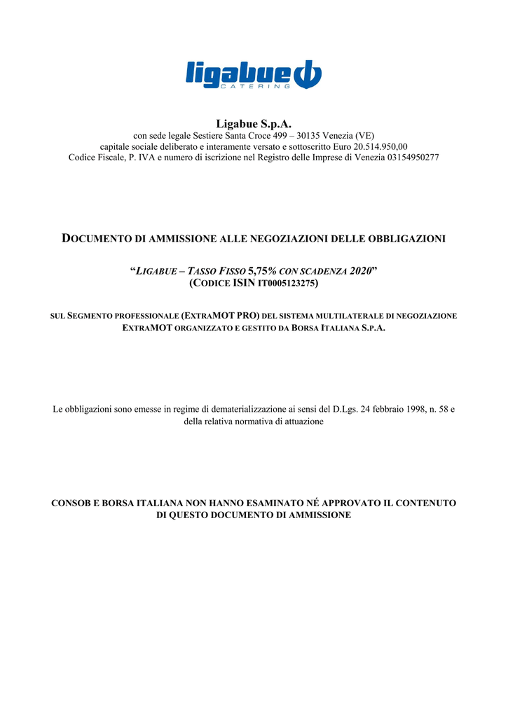 Ligabue S.p.A. con sede legale Sestiere Santa Croce 499 – 30135 Venezia (VE) capitale sociale deliberato e interamente versato e sottoscritto Euro 20.514.950,00 Codice Fiscale, P. IVA e numero di iscrizione nel Registro delle Imprese di Venezia 03154950277 DOCUMENTO DI AMMISSIONE ALLE NEGOZIAZIONI DELLE OBBLIGAZIONI “LIGABUE – TASSO FISSO 5,75% CON SCADENZA 2020” (CODICE ISIN IT0005123275) SUL SEGMENTO PROFESSIONALE (EXTRAMOT PRO) DEL SISTEMA MULTILATERALE DI NEGOZIAZIONE EXTRAMOT ORGANIZZATO E GESTITO DA BORSA ITALIANA S.P.A. Le obbligazioni sono emesse in regime di dematerializzazione ai sensi del D.Lgs. 24 febbraio 1998, n. 58 e della relativa normativa di attuazione CONSOB E BORSA ITALIANA NON HANNO ESAMINATO NÉ APPROVATO IL CONTENUTO DI QUESTO DOCUMENTO DI AMMISSIONE Documento di Ammissione – Ligabue S.p.A. INFORMAZIONI IMPORTANTI Il presente documento di ammissione (il “Documento di Ammissione”) contiene informazioni importanti e deve essere letto con particolare attenzione nella sua interezza, unitamente ai documenti allegati. Il presente Documento di Ammissione è messo a disposizione presso la sede legale della società emittente Ligabue S.p.A. (di seguito, l’“Emittente” o “Ligabue”), Sestiere Santa Croce 499, 30135 – Venezia (VE) e sul sito internet dell’Emittente all’indirizzo ftp://mail.ligabue.it. Il presente Documento di Ammissione si riferisce ed è stato predisposto esclusivamente in relazione all’ammissione alle negoziazioni delle obbligazioni “Ligabue – Tasso Fisso 5,75% con scadenza 2020” (Codice ISIN IT0005123275) (di seguito, le “Obbligazioni”) sul segmento professionale del sistema multilaterale di negoziazione ExtraMOT (di seguito “ExtraMOT PRO”), organizzato e gestito da Borsa Italiana S.p.A. (di seguito, “Borsa Italiana”). Il presente documento è stato pertanto redatto in conformità al regolamento del mercato ExtraMOT (di seguito, il “Regolamento ExtraMOT”) e non costituisce un prospetto ai sensi del D.Lgs. 24 febbraio 1998, n. 58, e del Regolamento Consob 14 maggio 1999, n. 11971, entrambi come successivamente modificati e integrati (di seguito, rispettivamente, il “TUF” e il “Regolamento 11971”). Le Obbligazioni non sono negoziate in alcun mercato regolamentato o non regolamentato italiano o estero e la Società non ha presentato domanda di ammissione alle negoziazioni delle Obbligazioni in altri mercati italiani o esteri (fatta eccezione per il segmento professionale (ExtraMOT PRO) del sistema multilaterale di negoziazione ExtraMOT organizzato e gestito da Borsa Italiana). Né il presente Documento di Ammissione, né l’operazione ivi descritta costituisce, o può essere intesa come, un’offerta al pubblico di strumenti finanziari né un’ammissione alle negoziazioni di strumenti finanziari in un mercato regolamentato così come definiti nel TUF e nel Regolamento 11971. Non si rende pertanto necessaria la redazione di un prospetto secondo gli schemi previsti dal Regolamento 809/2004/CE della Commissione del 29 aprile 2004 recante modalità di esecuzione della Direttiva Prospetti (come di seguito definita), come successivamente modificato e integrato (il “Regolamento 809”). La pubblicazione del presente documento non deve essere, e non è stata, autorizzata dalla Commissione Nazionale per le Società e la Borsa (di seguito, “Consob”) ai sensi della Direttiva 2003/71/CE del Parlamento europeo e del Consiglio relativa al prospetto da pubblicare per l’offerta o l’ammissione alla negoziazione di strumenti finanziari, come successivamente modificata e integrata (di seguito, la “Direttiva Prospetti”) o di qualsiasi altra norma o regolamento in materia (ivi inclusi gli articoli 94 e ss. e 113 e ss. del TUF). Consob e Borsa Italiana non hanno esaminato né approvato il contenuto di questo Documento di Ammissione. La lingua italiana è la lingua utilizzata dall’Emittente ai fini del presente Documento di Ammissione, nonché la lingua che sarà da questi utilizzata per tutti i documenti e informazioni messi e/o da mettere a disposizione degli investitori e per qualsiasi altro documento e informazione previsti dalla normativa, anche secondaria, applicabile e dal regolamento del prestito obbligazionario rappresentato dalle Obbligazioni (il “Prestito Obbligazionario”). Le Obbligazioni non sono state, né saranno registrate ai sensi dello United States Securities Act del 1993, come modificato ed integrato, né ai sensi delle corrispondenti o analoghe normative in vigore in qualsiasi altro paese nel quale la vendita, il trasferimento o comunque la consegna delle Obbligazioni, direttamente o 2 Documento di Ammissione – Ligabue S.p.A. indirettamente, non siano consentiti in assenza di specifiche esenzioni o autorizzazioni da parte delle competenti autorità (di seguito, collettivamente, gli “Altri Paesi”) e non potranno conseguentemente essere offerte, vendute o comunque consegnate, direttamente o indirettamente, negli Stati Uniti d'America, negli Altri Paesi o a soggetti che siano o agiscano per conto o a beneficio di United States Persons o a cui non possano essere vendute, trasferite o consegnate ai sensi della normativa applicabile. La pubblicazione e la distribuzione del presente documento in altre giurisdizioni e la vendita, il trasferimento o comunque la consegna delle Obbligazioni (diretta e/o indiretta), potrebbero essere soggette a restrizioni di legge o regolamentari e pertanto gli investitori sono tenuti ad informarsi sulla normativa applicabile in materia nei rispettivi paesi di residenza e ad osservare tali restrizioni. La violazione di tali restrizioni potrebbe costituire una violazione della normativa applicabile in materia di strumenti finanziari nella giurisdizione di competenza. 3 Documento di Ammissione – Ligabue S.p.A. INDICE PERSONE RESPONSABILI ....................................................................................................................