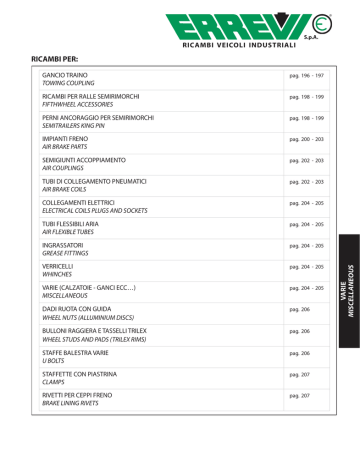 GANCIO TRAINO TOWING COUPLING pag. 196 - 197 RICAMBI PER RALLE SEMIRIMORCHI FIFTHWHEEL ACCESSORIES pag. 198 - 199 PERNI ANCORAGGIO PER SEMIRIMORCHI SEMITRAILERS KING PIN pag. 198 - 199 IMPIANTI FRENO AIR BRAKE PARTS pag. 200 - 203 SEMIGIUNTI ACCOPPIAMENTO AIR COUPLINGS pag. 202 - 203 TUBI DI COLLEGAMENTO PNEUMATICI AIR BRAKE COILS pag. 202 - 203 COLLEGAMENTI ELETTRICI ELECTRICAL COILS PLUGS AND SOCKETS pag. 204 - 205 TUBI FLESSIBILI ARIA AIR FLEXIBLE TUBES pag. 204 - 205 INGRASSATORI GREASE FITTINGS pag. 204 - 205 VERRICELLI WHINCHES pag. 204 - 205 VARIE (CALZATOIE - GANCI ECC…) MISCELLANEOUS pag. 204 - 205 DADI RUOTA CON GUIDA WHEEL NUTS (ALLUMINIUM DISCS) pag. 206 BULLONI RAGGIERA E TASSELLI TRILEX WHEEL STUDS AND PADS (TRILEX RIMS) pag. 206 STAFFE BALESTRA VARIE U BOLTS pag. 206 STAFFETTE CON PIASTRINA CLAMPS pag. 207 RIVETTI PER CEPPI FRENO BRAKE LINING RIVETS pag. 207 VARIE RICAMBI PER: ASSALI-SOSPENSIONI AXLE-SUSPENSION PARTS RICAMBI VEICOLI INDUSTRIALI RIMORCHI E SEMIRIMORCHI TRAILERS AND SEMITRAILERS S.p.A. VARIE MISCELLANEOUS ® 196 RIF. ERREVI DESCRIZIONE PARTICOLARI TIPO RIF. ORIG. ERREVI REF. DESCRIPTION VEHICLE MODEL ORIG. REF. Gancio di traino ERREVI tipo 733101 per Autoveicoli pesanti 26tJV - CAT. V (Tab. CUNA-NC 138-55) D.G.M. 48494 idoneo per rimorchi di massa complessiva fino a 26 t Approvato dal Ministero dei Trasporti M.C.T.C. ERREVI Towing coupling 733101 type for Heavy-Duty Vehicles suitable for trailers up to 26 Tons (Approved by the Board of Transport) 1 2 3 4 733101 727701 725630 740047 Gancio traino completo / Towing coupling assy Albero del gancio / Shaft Boccola per perno trasversale in lega xantal / Bush Copiglia per dado albero / Cotter pin 5 6 7 8 9 730504 729661 729240 727706 727707 Cuffia parapolvere per dado / Dustcover boot Dado per albero del gancio / Shaft nut Dado per perno trasversale / Pin nut Flangia anteriore / Flange, front Flangia intermedia / Flange, intermediate 10 11 12 13 14 15 16 727708 721001 721002 721004 721005 721006 720870 Flangia posteriore / Flange, rear Perno a manetta normale / Tow-hook pintle STD Perno a manetta magg. / Tow-hook pintle O/S Perno a manetta magg. / Tow-hook pintle O/S Perno a manetta magg. / Tow-hook pintle O/S Perno a manetta magg. / Tow-hook pintle O/S Perno trasversale per testa c/dado / Trasversal pin 17 18 19 726532 726531 726530 Rondella spessore per perno trasversale / Trasversal pin washer Rondella spessore per perno trasversale / Trasversal pin washer Rondella p/dado perno trasversale / Retaining washer ø 42x68x0.6 ø 42x68x1 ø 31x58x2 20 21 732063 730072 Spilla di sicurezza / Safety pin Tampone elastico in gomma / Rubber pad 168x115x57 ø 50x285 ø 42x46x90 M45x3 H=55 M30x2 H=21 ø 44.3 ø 44.5 ø 45 ø 45.5 ø 46 ø 42x166 8518952 8518958 8519209 10797701 (ex 30000828) 8519240 8518957 8518983 8518955 4618267 (ex 8518956) 8519203 8518954 8525377 (ex 8518959) 7984319 (ex 8525378) 8518960 7984332 (ex 8786473) PARTICOLARI VARIANTI PER TIPO AUTOMATICO / MISCELLANEOUS PARTS FOR AUTOMATHIC TYPE ONLY 22 23 24 25 26 27 726028 726029 727096 727097 711647 730073 Boccola in acciaio inferiore per perno / Steel bush, bottom Boccola in acciaio superiore per perno / Steel bush, top Chiavistello per sganciamento perno / Latch pin Leva di sicurezza per chiavistello / Latch lever Maniglia sganciamento perno / Handle Tassello in gomma appoggio campana / Rubber pad ø 48x57x30 ø 49x57x25 ø 140x108x34 1420/17210/1 1421/17210/2 1541/16504/B 1542/16506/C 1554/17298 18585/C VEICOLI PESANTI STRANIERI / OTHER EUROPEAN HEAVY-DUTY VEHICLES 28 29 733105 727709 2 30 726094 3 31 32 727704 725820 33 34 35 730074 730075 730076 Gancio traino completo / Towing coupling assy Flangia intermedia / Intermediate flange I rimanenti particolari sono intercambiabili con i tipi nazionali. All other parts are interchangeable with Italian models. 8198725 GANCIO TRAINO AUTOMATICO tipo RINGFEDER / AUTOMATIC TOWING COUPLING RINGFEDER TYPE Boccola per occhione gancio automatico Tow-eye bush automatic towing coupling ø 50x60,3x44 10998298 GANCIO TRAINO / TOWING COUPLING - EUROTECH - EUROSTAR - EUROTRAKKER Albero del gancio completo di boccola senza dado / Shaft c/w bush, without nut Boccola per perno trasversale con RAGNATURA Grooved bush Tampone el. in gomma - Flangia post. / Rubber pad - Rear flange Tampone el. in gomma - Flangia ant. / Rubber pad - Front flange Tampone elastico in gomma appoggio campana / Rubber pad ø 50x260 ø 42x46x90 ø 168x115x36 ø 168x115x55 ø 140x110x26 I marchi e i nominativi dei costruttori come pure i riferimenti originali sono esposti a solo titolo indicativo in quanto i nostri particolari non sono originali. Manufacturers’ names and part numbers in this catalogue are used for cross reference purposes only and do not imply anything about the origin or manufacturer of product. 42535190 42533762 (ex 42533729) 93190910 93190909 42532593 197 VARIE 1 ASSALI-SOSPENSIONI AXLE-SUSPENSION PARTS FIG. ITEM RIMORCHI E SEMIRIMORCHI TRAILERS AND SEMITRAILERS VARIE / MISCELLANEOUS VARIE MISCELLANEOUS ® new 198 VARIE / MISCELLANEOUS FIG. RIF. ERREVI DESCRIZIONE PARTICOLARI TIPO RIF. ORIG. ITEM ERREVI REF. DESCRIPTION VEHICLE MODEL ORIG. REF. RICAMBI PER RALLE SEMIRIMORCHI FIFTHWHEEL ACCESSORIES INTERCAMBIABILE CON TIPO JOST JSK 37 INTERCHANGEABLE WITH JOST JSK 37 TYPE 1 727994 Anello di usura / Wear ring 2 729434 Bullone fiss. anello di usura / Wear ring bolt 3 727992 Catenella con gancio / Hook and chain 4 727991 Chiavistello di bloccaggio / Latch SK 3205-06 5 732191 Molla doppia di ritorno / Return spring SK 3105-20 6 732190 Molla per ganascia / Jaw spring 7 727993 Perno per ganascia / Pivot pin 8 727995 Kit ingrassatore / Grease fitting kit SK 3108-02 9 711944 Kit tamponi sostegno composto da: / Rubber pad kit complete with: SK 2121-69 10 730310 (2) Tampone in gomma sup. / Rubber pad, top 11 730311 (2) Tampone in gomma inf. / Rubber pad, bottom 12 729435 (8) Bullone testa svasata / Countersunk bolt 2 SK 2105-19 M14x2 L=24 SK 