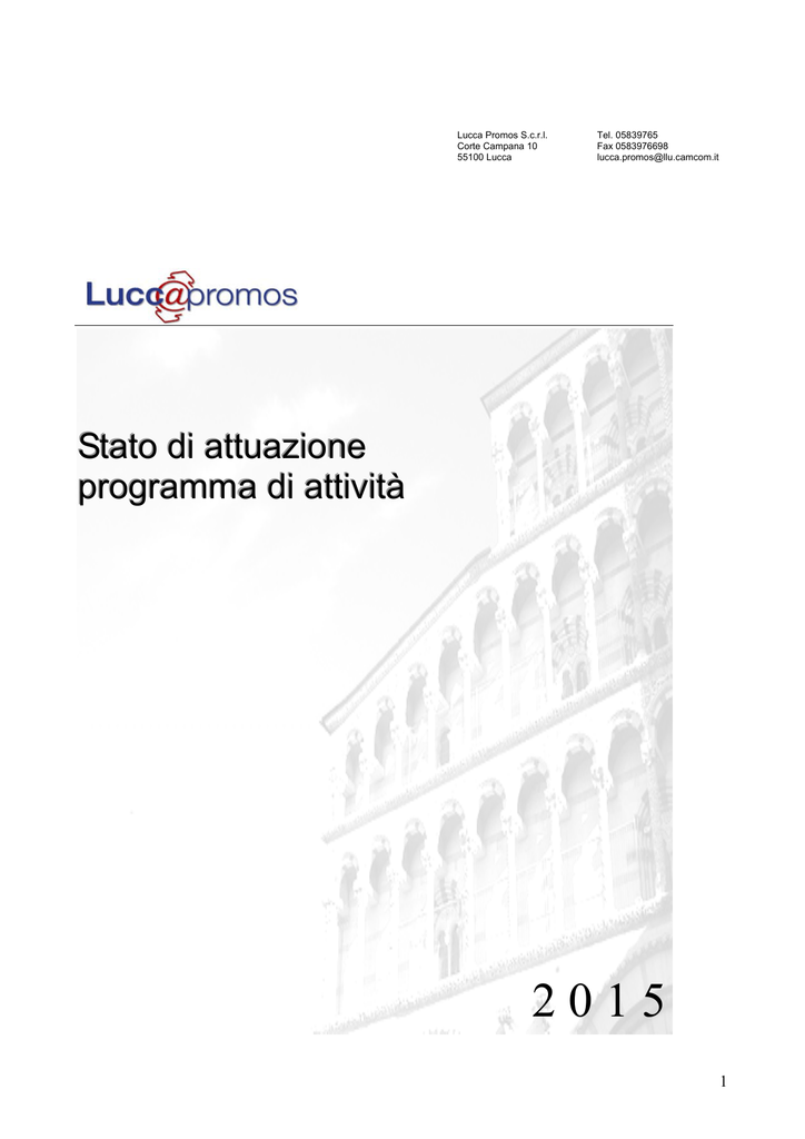 Lucca Promos S.c.r.l. Corte Campana 10 55100 Lucca Tel. 05839765 Fax 0583976698 [email protected] Stato di attuazione programma di attività 2015 1 LUCCA PROMOS – ATTIVITA’ 2015 Interventi per l’Internazionalizzazione INIZIATIVE 2015 LAPIDEO- ARTIGIANATO ARTISTICO 1 INCOMING IN OCCASIONE DI MARMOTEC -GIUGNO NAUTICA 2 YARE - INCOMING COMANDANTI E YACHT MANAGER - VIAREGGIO E MARINA DI CARRARA FEBBRAIO CARTARIO - IMBALLAGGI 3 EVENTO IT’S TISSUE - GIUGNO 4 INCOMING OPERATORI IN OCCASIONE DEL MIAC - LUCCA - OTTOBRE TURISMO 5 MISSIONE –EVENTO PROMOZIONALE PER IL MERCATO FRANCESE - PARIGI - MAGGIO 6 INCOMING TOUR OPERATORS – EDUCATIONAL TOUR “SULLE NOTE DI PUCCINI” DA U.S.A. - LUGLIO 7 MISSIONE – EVENTO PROMOZIONALE A LONDRA IN OCCASIONE DI FIERA WTM - NOVEMBRE EVENTI PER TERZI 8 CONVEGNO ASCENS PER IMT – MARZO 9 CONVEGNO EUROMECH PER IMT – MARZO/APRILE 2 PROGRAMMA DI ATTIVITA’ 2015 Stato d’attuazione Internazionalizzazione Settore Nautica e subfornitura 1. Incoming Comandanti YARE & ITALIAN SUPERYACHT FORUM 2015 – 2/6 Febbraio Location: Versilia e Marina di Carrara Organizzazione ed intervento finanziario: Consorzio Navigo e Toscana Promozione con ns sostegno organizzativo e finanziario Numero aziende italiane: 100 aziende italiane Numero aziende estere: 100 comandanti Svolgimento dell’iniziativa: sono stati invitati per l’occasione più di 100 comandanti di yacht tra i 25 e i 90 metri a cui è stato proposto un soggiorno ricco di occasioni di incontro e scambio con le imprese del settore nautico, l’eccellenza del comparto industriale della regione. Gli ospiti hanno avuto modo altresì di conoscere le bellezze paesaggistiche, culturali e naturali del nostro territorio. Tra i vari momenti di networking e confronto: il forum, gli incontri business, gli eventi social e i tour nei distretti nautici. Settore Cartario / Imballaggi 2. Evento promozionale rete It’s Tissue - 21 al 28 giugno Location: Lucca Compartecipazione organizzativa/finanziaria: Toscana Promozione Svolgimento dell’iniziativa: E’ stato realizzato un’ evento di promozione territoriale totalmente organizzato dalla Rete IT’s TISSUE 3. Incoming operatori esteri in occasione del Miac –12-14 ottobre ANNULLATO Location: Lucca Compartecipazione organizzativa/finanziaria: Toscana Promozione Numero aziende toscane: 20 stimate Numero aziende estere: 10 Svolgimento dell’iniziativa: E’ previsto l’invito di una delegazione di operatori del settore cartario provenienti da Russia, Brasile e Nord Europa. Saranno organizzati incontri B2B, visite aziendali e visita alla fiera Miac 2015. Settore Lapideo e Artigianato Artistico 3 4. Incoming operatori esteri del settore marmo ed artigianato artistico durante la fiera Marmotec– 18-21 giugno ANNULLATO Location: Pietrasanta e Marina di Carrara Compartecipazione organizzativa/finanziaria: Toscana Promozione e CCIAA MS Numero aziende estere: 20 Incoming di operatori del settore per incontri b2b e visite aziendali durante la fiera Marmotec di Carrara. L’evento è realizzato in collaborazione con la Camera di Commercio di Massa Carrara. All’interno del progetto sarà dedicato una giornata di b2b sul nostro territorio nella sede del “ MUSA “di Pietrasanta. Settore Turismo 5. Evento promozionale in Francia – Parigi – maggio ANNULLATO Location: Parigi Compartecipazione organizzativa/finanziaria: Toscana Promozione Numero aziende estere: 70 Svolgimento dell’iniziativa: Verrà realizzato, anche su espressa indicazione di Toscana Promozione, un ‘evento di promozione regionale con una conferenza di presentazione dell’offerta turistica dove Luccapromos illustrerà secondo il suo format ormai collaudato nel mondo, l’offerta turistica lucchese e le eccellenze del territorio. L’intenzione è quella di realizzare a seguire un piccolo l’evento musicale e un cocktail degustazione dei nostri prodotti tipici, vino e olio. 6. Incoming Tour Operator e giornalisti dagli Stati Uniti -luglio ANNULLATO Location: Lucca e provincia Compartecipazione organizzativa/finanziaria: Toscana Promozione Numero aziende estere:10 Si prevede di organizzare un Educational Tour di follow-up a Lucca e Provincia anche in seguito ai contatti presi in occasione dell’ evento a New York lo scorso dicembre. Quest’iniziativa ci permetterà di consolidare i rapporti presi e di far conoscere agli operatori statunitensi le bellezze del nostro territorio attraverso le visite e i contatti diretti con le aziende sul territorio, 7. Evento promozionale in occasione della fiera WTM presso l’Ambasciata d’Italia a Londra – 3 novembre Location: Londra Compartecipazione organizzativa/finanziaria: Associazione Lucchesi nel Mondo Numero operatori esteri: 70 L’evento sarà incentrato sulla presentazione della nuova campagna di promozione “The Lands of Giacomo Puccini” dove Luccapromos illustrerà secondo il suo format ormai collaudato nel mondo, l’offerta turistica lucchese e le eccellenze del territorio. L’intenzione è quella di realizzare a seguire l’interludio musicale e un cocktail degustazione dei nostri prodotti tipici, vino e olio. Settore EVENTI PER TERZI 8. Organizzazione del Convegno ASCEN commissionato da IMT –23-27marzo 4 9. Organizzazione del Convegno EUROMECH commissionato da IMT-30 marzo-2 aprile Progetti Comunitari Nel corso dell’anno 2015 sono state realizzate una serie di attività riconducibili al progetto EXTRA EXPO, di cui Lucca Promos è capofila, alla proposta “Networks of Regions” e al progetto "PTL Ampliamento del centro di competenze Ecolab" Le attività sono così riassumibili: PROGETTO EXTRA-EXPO a) amministrativo/gestionale: coordinamento partner, organizzazione e partecipazione al midterm meeting a Toledo, rendicontazione intermedia, finanziaria e tecnica, alla Commissione Europea. Prima rendicontazione inviata a marzo; seconda rendicontazione inviata a fine settembre. b) alimentazione sito web di progetto www.marbleroutes.eu (elabor