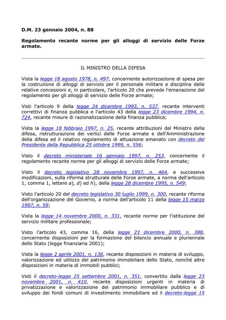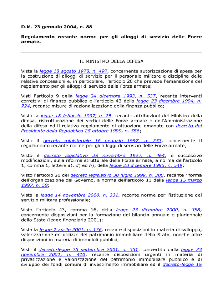 D.M. 23 gennaio 2004, n. 88 Regolamento recante norme per gli alloggi di servizio delle Forze armate. IL MINISTRO DELLA DIFESA Vista la legge 18 agosto 1978, n. 497, concernente autorizzazione di spesa per la costruzione di alloggi di servizio per il personale militare e disciplina delle relative concessioni e, in particolare, l'articolo 20 che prevede l'emanazione del regolamento per gli alloggi di servizio delle Forze armate; Visti l'articolo 9 della legge 24 dicembre 1993, n. 537, recante interventi correttivi di finanza pubblica e l'articolo 43 della legge 23 dicembre 1994, n. 724, recante misure di razionalizzazione della finanza pubblica; Vista la legge 18 febbraio 1997, n. 25, recante attribuzioni del Ministro della difesa, ristrutturazione dei vertici delle Forze armate e dell'Amministrazione della difesa ed il relativo regolamento di attuazione emanato con decreto del Presidente della Repubblica 25 ottobre 1999, n. 556; Visto il decreto ministeriale 16 gennaio 1997, n. 253, concernente il regolamento recante norme per gli alloggi di servizio delle Forze armate; Visto il decreto legislativo 28 novembre 1997, n. 464, e successive modificazioni, sulla riforma strutturale delle Forze armate, a norma dell'articolo 1, comma 1, lettere a), d) ed h), della legge 28 dicembre 1995, n. 549; Visto l'articolo 20 del decreto legislativo 30 luglio 1999, n. 300, recante riforma dell'organizzazione del Governo, a norma dell'articolo 11 della legge 15 marzo 1997, n. 59; Vista la legge 14 novembre 2000, n. 331, recante norme per l'istituzione del servizio militare professionale; Visto l'articolo 43, comma 16, della legge 23 dicembre 2000, n. 388, concernente disposizioni per la formazione del bilancio annuale e pluriennale dello Stato (legge finanziaria 2001); Vista la legge 2 aprile 2001, n. 136, recante disposizioni in materia di sviluppo, valorizzazione ed utilizzo del patrimonio immobiliare dello Stato, nonché altre disposizioni in materia di immobili pubblici; Visti il decreto-legge 25 settembre 2001, n. 351, convertito dalla legge novembre 2001, n. 410, recante disposizioni urgenti in materia privatizzazione e valorizzazione del patrimonio immobiliare pubblico e sviluppo dei fondi comuni di investimento immobiliare ed il decreto-legge 23 di di 15 aprile 2002, n. 63, convertito dalla legge 15 giugno 2002, n. 112, concernente, tra l'altro, disposizioni in materia di cartolarizzazioni, valorizzazione del patrimonio e finanziamento delle infrastrutture; Visto l'articolo 33 della legge 16 gennaio 2003, n. 3, recante disposizioni ordinamentali in materia di pubblica amministrazione; Visto l'articolo 17, comma 3, della legge 23 agosto 1988, n. 400, recante disciplina dell'attività di Governo e ordinamento della Presidenza del Consiglio dei Ministri; Considerato che l'organo nazionale della rappresentanza militare ha espresso il richiesto parere nei termini previsti dall'articolo 38 del regolamento di attuazione della rappresentanza militare, approvato con decreto del Presidente della Repubblica 4 novembre 1979, n. 691, e successive modificazioni; Udito il parere del Consiglio di Stato espresso dalla Sezione consultiva per gli atti normativi nell'adunanza del 23 giugno 2003; Vista la comunicazione al Presidente del Consiglio dei Ministri a norma dell'articolo 17, comma 3, della legge 23 agosto 1988, n. 400, (nota 31 ottobre 2003, n. 8/53954/D.VIII.5); Adotta il seguente regolamento: ------------------------ Capo I - Costituzione, classificazione e destinazione degli alloggi di servizio 1. Àmbito di applicazione. 1. Il regolamento disciplina la concessione di alloggi di servizio al personale dell'Esercito, della Marina militare e dell'Aeronautica militare ed al personale civile del Ministero della difesa. 2. Per la concessione degli alloggi di servizio al personale dell'Arma dei carabinieri è fatta salva la speciale disciplina prevista dal decreto interministeriale giugno 1989 dei Ministri della difesa e dell'interno, attuativo dell'articolo 9, comma 2, del decreto-legge 21 settembre 1987, n. 387, convertito in legge, con modificazioni, dalla legge 20 novembre 1987, n. 472. 3. Per sopperire a temporanee esigenze organizzative dei comandi internazionali operanti in territorio nazionale, l'Amministrazione della difesa può assegnare, per la durata dell'esigenza e fatte salve le prioritarie necessità delle Forze armate italiane, alloggi di servizio al personale appartenente a Forze armate estere impiegato presso i predetti comandi. Le assegnazioni sono effettuate, ai sensi dell'articolo 33 della legge 16 gennaio 2003, n. 3, in armonia con le disposizioni della legge 18 agosto 1978, n. 497 e del presente regolamento. ------------------------ 2. Princìpi generali. 1. In applicazione della legge 18 febbraio 1997, n. 25, e del relativo regolamento emanato con decreto del Presidente della Repubblica 25 ottobre 1999, n. 556, nonché dell'articolo 20 del decreto legislativo 30 luglio 1999, n. 300, lo Stato Maggiore della difesa definisce i criteri generali per la determinazione degli incarichi che consentono l'assegnazione degli alloggi di servizio. Gli Stati Maggiori di Forza armata ed il Segretario generale della difesa determinano gli elenchi degli incarichi concernenti i destinatari degli alloggi di servizio, con le modalità di cui all'articolo 31. 2. I comandi militari, ovvero gli organismi designati dagli Stati Maggiori di singola Forza armata, competenti per il censimento e per la gestione degli alloggi di servizio, disciplinati dalla legge 18 agosto 1978, n. 497, comunicano la costituzione, ovvero la variazione degli alloggi alla Direzione generale dei lavori e del demanio, che provvede a formalizzare l'atto di costituzione. 3. La comunicazione, di cui al comma 2, specifica per ogni immobile la classifica, il codice, la località, l'indirizzo, la superficie abitabile e convenzionale, la categoria catastale, l'anno di costruzione. La comunicazione è corredata dalla certificazione dell'avvenuto a