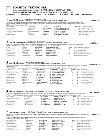 SOCIETA’ TRENNO SRL Programma Ufficiale 8a giornata - DOMENICA 31 GENNAIO 2016 INIZIO RIUNIONE ORE 13:50 – CHIUSURA PISTA ORE 13:10 Proprieta Allenatore Guida N. Cavallo R F Recl 1 ore 13:50 ROSA - PREMIO STANGARO - Euro 7040.00 - Metri 1650 Mt. SME Genealogia <<TRIO>> (2.720,00-1.196,80-652,80-326,40 e 1.280,00) agli allenatori (320,00-140,80-76,80-38,40)ai guidatori (160,00-70,40-38,40-19,20) (GENTLEMEN - COND) Coppa offerta dalla Societa' Trenno Srl al GD del cavallo del vincitore. Indigeni di 4 anni non vincitori di Euro 20.000,00 nella carriera. Metri 1650 Az.agr.Santa Rosa S.Ciraso 1 TWIN AS 1650 mb 4 S J's Photo e Navarra As C.Cangelosi Sig.Vessichelli Gaetano mb 4 Ganymede e Biscuit Rivarco G. JrVessichelli 2 THUNDER RIVARCO " P.Gubellini Sc.Wave Srl G.Lami 3 TALBOT DI AZZURRA " mb 4 Conway Hall e Iride King E.Bondo Sc.Soc. All. D'alessandro Raffaele Srl fb 4 Nad Al Sheba e Fashion Pride L. JrFarina 4 TIFFANY PRIDE " V. JrD'alessandro Sc.Valle Falconera Sas A.Nunziata 5 TILDE SPRITZ " fb 4 Algiers Hall e Esterina Rivarco A.Sarzetto Sig.Bosia Giovanni cb 4 Lester e Librata D.Bosia 6 TEOREMA DI MIRA " L.Pasolini 2 ore 14:20 MARRONE - PREMIO FREDDY - Euro 6.050,00 - Metri 1650 <<TRIO>> (2.337,50-1.028,50-561,00-280,50 e 1.100,00) agli allenatori (275,00-121,00-66,00-33,00)ai guidatori (137,50-60,50-33,00-16,50) (PROF - COND) Indigeni di 3 anni non vincitori di Euro 5.000,00 nella carriera. Metri 1650 Sc.Niss mb 3 Broad Bahn e Classic Toy R.Vecchione 1 UHAVEADREAM 1650 H.Ehlert Sig.raAliprandi Ilaria F.Di Rienzo 2 URSULA DEL RONCO " fb 3 Zola Boko e Debra Del Ronco F.Di Rienzo Sc.Gt Srl fb 3 Civil Action e Gast A.Guzzinati 3 UGOLINAST " G.Targhetta Sc.Valle Falconera Sas A.Farolfi 4 URLO SPRITZ " mb 3 Pine Chip e My Fair Dl A.Sarzetto Sig.raGalanti Sonia fb 3 L'as De Boussieres e Giant Flora L.Baldi 5 UNICA GSO " Lor.Baldi Sc.Lainate Nord Snc F.Martinelli 6 UVALYN PRAV " fbo 3 Cantab Hall e Ginny Grif C.Belladonna 3 ore 14:55 GRIGIO - PREMIO DOSSON - Euro 7.700,00 - Metri 1650 (2.737,00-1.309,00-714,00-357,00-238,00 e 1.400,00) agli allenatori (322,00-154,00-84,00-42,00-28,00)ai guidatori (161,00-77,00-42,00- <<<<TRIS>> 21,00-14,00) (PROF - COND - corsa ippica nazionale - ) Indigeni di 5 anni non vincitori di Euro 45.000,00 nella carriera. Metri 1650 Sc.Wave Srl E 1650 mbo 5 Pine Chip e Iffi Fed.Esposito 1 SANSONE LASER E.Bondo Sig.Stancari Roberto E" cb 5 From Above e Dalianera Spin G. JrLombardo 2 SCACCOMATTO SPIN E.Ossani Sig.Giuliano Giuseppe '70 R.D'alessandro 3 SOGNO DI VENERE " fb 5 Cantab Hall e Vyingforthecrown V. JrD'alessandro Sc.Valle Falconera Sas fb 5 S J's Photo e Florican Nord Fro A.Farolfi 4 SASSY NORD FRO " A.Sarzetto Az.agr.Purlari Srl M. JrMinopoli 5 SHELLEY BREED " fb 5 Conway Hall e Freccia D'asolo M. JrMinopoli Sig.raBertini Erika mb 5 Classic Photo e Ermitage Or R.Vecchione 6 SPRITZ HOLZ " H.Ehlert Sig.Zucchetti Luccio T.Di Lorenzo 7 SOLCIO ZL " cb 5 Oiseau De Feux e Bebe' Dei Pas M.Baroncini Sig.Guida Edoardo fb 5 Varenne e Ilias Ors E.Bellei 8 STAR GRIF ITALIA " G.Carini Sig.raBalzano Stefania V. JrD'alessandro 9 SONIA JET " fb 5 Igor Font e Coca Black Jet V. JrD'alessandro Sc.Gnafa' Srl fb 5 Varenne e Saga Sund Cl.Baldi 10 SEASIDE DANY " C.Rizzo 4 ore 15:25 ROSSO - PREMIO GENDARME - Euro 12.100,00 - Metri 1650 <<TRIO>> (4.675,00-2.057,00-1.122,00-561,00 e 2.200,00) agli allenatori (550,00-242,00-132,00-66,00)ai guidatori (275,00-121,00-66,00-33,00) (PROF - INVITO) Coppa offerta dalla Societa' Trenno Srl al proprietario del cavallo del vincitore. Indigeni di 3 anni. Metri 1650 Az.agr.Santa Rosa C.Cangelosi 1 UN GRANDE IDO 1650 mb 3 Cc's Chuckie T e Florian King C.Cangelosi Az.agr.Biasuzzi Srl Soc.unip. R.Vecchione 2 UBIMAJOR BI " mb 3 Toss Out e Fidji Bi H.Ehlert Sc.Bellosguardo mb 3 Daguet Rapide e Ledy Caf G. JrLombardo 3 UNO DE MAYO " TeamLombardo Srl Sig.Cecchi Leonardo E.Bellei 4 UNIQUE DU KRAS P" fbo 3 Varenne e Oljka Du Kras A.Gocciadoro Sig.raMoretti Laura mb 3 Barani Lb e Gasoline E.Bacalini 5 UTOR PV " M.Bacalini Sc.Sa. Fra Fas Srl M. JrMinopoli 6 UNBEATEN GRIF " mb 3 Varenne e Ibice Grif M. JrMinopoli 5 ore 16:00 AZZURRO - PREMIO DANZICA - Euro 10.450,00 - Metri 1650 (3.714,50-1.776,50-969,00-484,50-323,00 e 1.900,00) agli allenatori (437,00-209,00-114,00-57,00-38,00)ai guidatori (218,50-104,50-57,00- <<TRIO>> 28,50-19,00) (PROF - COND) Coppa offerta dalla Societa' Trenno Srl al proprietario del cavallo del vincitore. Indigeni di 4 anni non vincitori di Euro 30.000,00 nella carriera. Metri 1650 Sig.Campanelli Urbano T.Di Lorenzo 1 TRONDA WISE 1650 fb 4 Daguet Rapide e Gironda As M.Baroncini Sc.Valle Falconera Sas fb 4 Naglo e My Fair Dl A.Farolfi 2 TOSETTA SPRITZ " A.Sarzetto Sig.raMoretti Laura E.Bacalini 3 TANTALO PV " mb 4 Barani Lb e Arabesca M.Bacalini Sig.raFabbri Loretta mb 4 Ganymede e Dallas Blues M. JrMinopoli 4 TICKET TO RIDE " M. JrMinopoli Sc.Nuova Giannotti Sas E.Bellei 5 TALITA'S CAGE A " fbo 4 Credit Winner e Lindia H.Ehlert All.Toniatti Sas fb 4 Pine Chip e First Lady Jet Lor.Baldi 6 TAMIA JET " E.Bondo Sc.Aldo E Carlo Borsani Snc ms 4 Love You e Nuance Grif M.Guzzinati 7 TIZIANO " M.Regge 6 ore 16:40 GIALLO - PREMIO GRAN PREMIO ETTORE E MARIO BARBETTA - Euro 45.100,00 - Metri 2700 <<TRIO>> (16.031,00-7.667,00-4.182,00-2.091,00-1.394,00 e 8.200,00) agli allenatori (1.886,00-902,00-492,00-246,00-164,00)ai guidatori (943,00451,00-246,00-123,00-82,00) (PROF – GRAN PREMIO – PARTENZA NASTRI) Coppa offerta dalla Societa' Trenno Srl al proprietario, allenatore e guidatore del cavallo vincitore. Esteri di 4 anni ed oltre Indigeni di 5 anni ed oltre. Metri 2700-2720. (corsa internazionale). Sc.Nuova Mirabello Sas Di Bosia V. & Co. A 2700 mb 5 S J's Photo e Lucemar A.Guzzinati 1 SHOWMAR A.Bitteleri Sig.Santaniello Vincenzo " mb 6 From Above e Around The World Soc.all.D'alessandro Raffaele Srl V. JrD'alessandro 2 RIBELLE OP Sc.Sa. Fra Fas Srl mb 6 Ganymede e Alias Di Jesolo M. JrMinopoli 3 RANYMEDE FAS " M. JrMinopoli Sig.Pellegrino 
