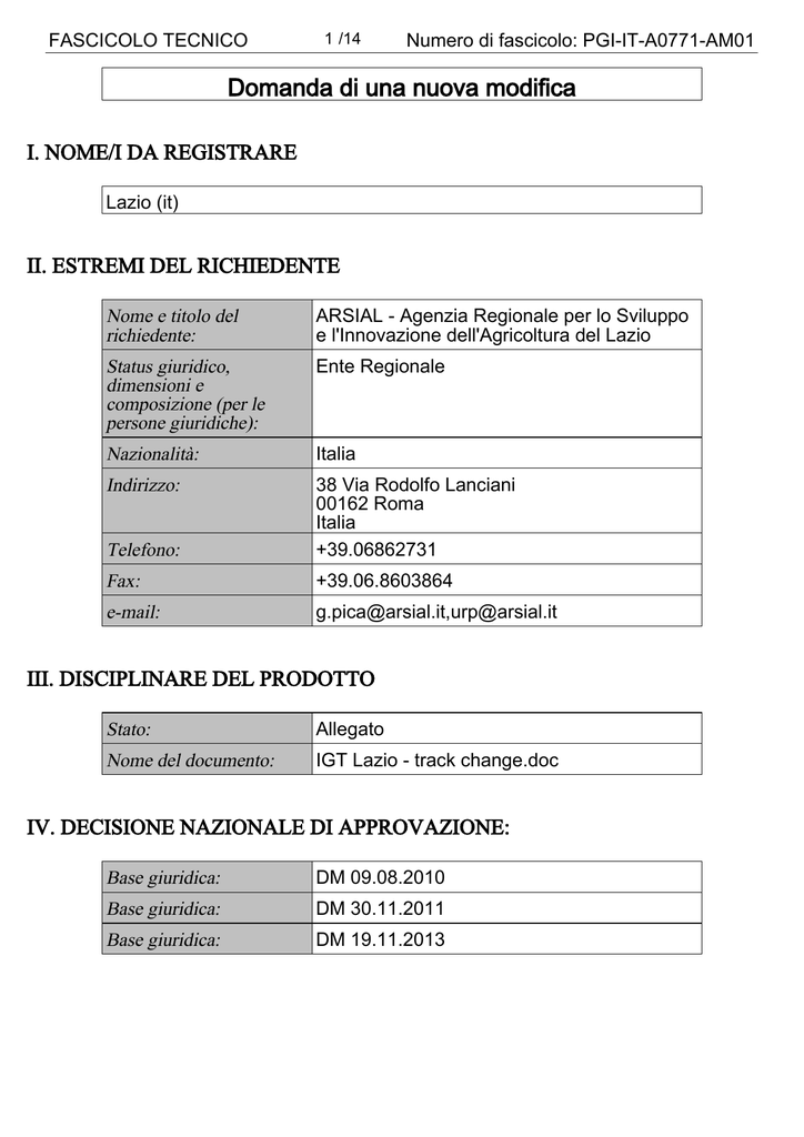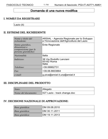 FASCICOLO TECNICO 1 /14 Numero di fascicolo: PGI-IT-A0771-AM01 Domanda di una nuova modifica I. NOME/I DA REGISTRARE Lazio (it) II. ESTREMI DEL RICHIEDENTE Nome e titolo del richiedente: ARSIAL - Agenzia Regionale per lo Sviluppo e l'Innovazione dell'Agricoltura del Lazio Status giuridico, dimensioni e composizione (per le persone giuridiche): Ente Regionale Nazionalità: Italia Indirizzo: Telefono: 38 Via Rodolfo Lanciani 00162 Roma Italia +39.06862731 Fax: +39.06.8603864 e-mail: [email protected],[email protected] III. DISCIPLINARE DEL PRODOTTO Stato: Allegato Nome del documento: IGT Lazio - track change.doc IV. DECISIONE NAZIONALE DI APPROVAZIONE: Base giuridica: DM 09.08.2010 Base giuridica: DM 30.11.2011 Base giuridica: DM 19.11.2013 FASCICOLO TECNICO 2 /14 Numero di fascicolo: PGI-IT-A0771-AM01 V. DOCUMENTO UNICO Nome/i da registrare Lazio (it) Termine/i equivalente/i: Denominazione tradizionalmente usata: No Tipo di modifica: Bring into compliance with EU rules (Article 73(2) of R.(EC) No 607/2009) La presente scheda tecnica include modifiche adottate in conformità a: Tipo di indicazione geografica: IGP - Indicazione geografica protetta 1. CATEGORIE DI PRODOTTI VITICOLI 1. Vino 4. Vino spumante 8. Vino frizzante 2. DESCRIZIONE DEI VINI: «Lazio» bianco Caratteristiche analitiche: titolo alcolometrico volumico totale minimo: 10,50% vol.; acidità totale minima: 4,50 g/l; estratto non riduttore minimo: 14,00 g/l; Caratteristiche organolettiche: colore: giallo, a volte tendente al dorato o al verdognolo; odore: intenso, fruttato; sapore: tipico, secco, sapido. E’ prevista la tipologia frizzante. «Lazio» bianco passito Caratteristiche analitiche: titolo alcolometrico volumico totale minimo: 16,00% vol e con un titolo alcolometrico volumico effettivo non inferiore a 9,00%; FASCICOLO TECNICO 3 /14 Numero di fascicolo: PGI-IT-A0771-AM01 acidità totale minima: 4,00 g/l; estratto non riduttore minimo: 24,00 g/l; Caratteristiche organolettiche: colore: giallo tendente all’ambra a seconda dell’invecchiamento; odore: intenso, fruttato; sapore: dolce, caratteristico, sapido. «Lazio» bianco vendemmia tardiva Caratteristiche analitiche: titolo alcolometrico volumico totale minimo: 15,00% vol e con un titolo alcolometrico volumico effettivo non inferiore a 12,00%; acidità totale minima: 4,50 g/l; estratto non riduttore minimo: 20,00 g/l; Caratteristiche organolettiche: colore: giallo dorato; odore: intenso,caratteristico sapore: vellutato, gradevole. «Lazio» bianco spumante Caratteristiche analitiche: titolo alcolometrico volumico totale minimo: 10,00% vol; acidità totale minima: 5,00 g/l; estratto non riduttore minimo: 15,00 g/l; Caratteristiche organolettiche: spuma: fine e persistente; colore: paglierino chiaro, limpido; odore: fine, caratteristico; sapore: armonico. «Lazio» rosso Caratteristiche analitiche: titolo alcolometrico volumico totale minimo: 11,00% vol; acidità totale minima: 4,50 g/l; estratto non riduttore minimo: 18,00 g/l; Caratteristiche organolettiche: FASCICOLO TECNICO 4 /14 Numero di fascicolo: PGI-IT-A0771-AM01 colore: rosso rubino più o meno carico tendente al granato con l'invecchiamento; odore: complesso, fruttato; sapore: armonico, tipico. E’ prevista la tipologia novello e frizzante. «Lazio» rosso passito Caratteristiche analitiche: titolo alcolometrico volumico totale minimo: 16,00% vol e con un titolo alcolometrico volumico effettivo non inferiore a 9,00% vol; acidità totale minima: 4,00 g/l; estratto non riduttore minimo: 24,00 g/l; Caratteristiche organolettiche: colore: rosso più o meno carico tendente al granato con l'invecchiamento; odore: caratteristico ed intenso; sapore: dolce, armonico e vellutato. «Lazio» rosso vendemmia tardiva Caratteristiche analitiche: titolo alcolometrico volumico totale minimo: 15,00% vol e con un titolo alcolometrico volumico effettivo non inferiore a 12,00%; acidità totale minima: 4,50 g/l; estratto non riduttore minimo: 20,00 g/l; Caratteristiche organolettiche: colore: rosso più o meno intenso tendente al granato; odore: caratteristico ed intenso; sapore: armonico e vellutato. «Lazio» rosso spumante Caratteristiche analitiche: titolo alcolometrico volumico totale minimo: 10,00% vol; acidità totale minima: 5,00 g/l; estratto non riduttore minimo: 17,00 g/l; Caratteristiche organolettiche: spuma: fine e persistente; colore: rosso rubino carico; FASCICOLO TECNICO 5 /14 Numero di fascicolo: PGI-IT-A0771-AM01 odore: persistente, caratteristico; sapore: armonico ed equilibrato. «Lazio» rosato Caratteristiche analitiche: titolo alcolometrico volumico totale minimo: 10,50% vol; acidità totale minima: 4,50 g/l; estratto non riduttore minimo: 15,00 g/l; Caratteristiche organolettiche: colore: rosato cerasuolo più o meno intenso; odore: fine, gradevole; sapore: armonico, delicato, vellutato. E’ prevista la tipologia frizzante. «Lazio» rosato spumante Caratteristiche analitiche: titolo alcolometrico volumico totale minimo: 10,00% vol; acidità totale minima: 5,00 g/l; estratto non riduttore minimo: 15,00 g/l; Caratteristiche organolettiche: spuma: fine e persistente; colore: rosato più o meno intenso con riflessi violacei; odore: fine, gradevole; sapore: armonico. «Lazio» con la specificazione del/i nome/i del/i vitigno/i Caratteristiche analitiche: Limiti stabiliti dalla normativa vigente. Caratteristiche organolettiche: Oltre alle caratteristiche sopra specificate per i vini del corrispondente colore, devono presentare le caratteristiche organolettiche proprie del vitigno. 3. MENZIONI TRADIZIONALI FASCICOLO TECNICO 6 /14 a. Punto a) Indicazione geografica tipica (IGT) b. Punto b) Passito Vivace Novello Vendemmia Tardiva 4. PRATICHE DI VINIFICAZIONE a. Pratiche enologiche Tipo di pratica enologica: Descrizione della pratica: b. Rese massime: «Lazio» bianco Resa massima: resa uva: 21 t/ha resa vino: 157 hl/ha «Lazio» rosso Resa massima: resa uva: 20 t/ha resa vino: 150 hl/ha «Lazio» rosato Re