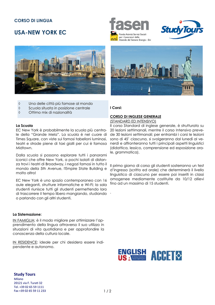 CORSO DI LINGUA USA-NEW YORK EC ◊ ◊ ◊ Una delle città più famose al mondo Scuola situata in posizione centrale Ottimo mix di nazionalità I Corsi: La Scuola EC New York è probabilmente la scuola più centrale della “Grande Mela”. La scuola è nel cuore di Times Square, con viste sui famosi tabelloni luminosi, teatri e strade piene di taxi gialli per cui è famosa Midtown. CORSO DI INGLESE GENERALE (STANDARD ED INTENSIVO) Il corso Standard di inglese generale, è strutturato su 20 lezioni settimanali, mentre il corso Intensivo prevede 30 lezioni settimanali; per entrambi i corsi le lezioni sono di 45’ ciascuna, si svolgeranno dal lunedì al venerdì e affronteranno tutti i principali aspetti linguistici (didattica, lessico, comprensione ed esposizione orale, grammatica). Dalla scuola si possono esplorare tutti i panorami iconici che offre New York, a pochi isolati di distanza trovi i teatri di Broadway, i negozi famosi in tutto il Il primo giorno di corso gli studenti sosterranno un test mondo della 5th Avenue, l'Empire State Building e d’ingresso (scritto ed orale) che determinerà il livello molto altro! linguistico di ciascuno per essere poi inseriti in classi EC New York è uno spazio contemporaneo con 16 omogenee mediamente costituite da 10/12 allievi aule eleganti, strutture informatiche e Wi-Fi; la sala fino ad un massimo di 15 studenti. studenti riunisce tutti gli studenti permettendo loro di trascorrere il tempo libero mangiando, studiando . o parlando con gli altri studenti. La Sistemazione: IN FAMIGLIA: è il modo migliore per ottimizzare l’apprendimento della lingua attraverso il suo utilizzo in situazioni di vita quotidiana e per approfondire la conoscenza della cultura locale. IN RESIDENCE: ideale per chi desidera essere indipendente e autonomo. Study Tours Milano 20121 via F. Tura 32 Tel. +39 02 65 59 1111 Fax +39 02 65 59 11 233 1/2 NEW YORK - EC QUOTE BASE DI PARTECIPAZIONE 2016* Valide dal 1°gennaio al 31 dicembre 2016 Pacchetto in famiglia con corso Standard 2 settimane: Pacchetto in famiglia con corso Intensivo 2 settimane: € 1.655,00 € 1.825,00 NB Per il corso intensivo è necessario il visto di studio F1 Soggiorni da sabato a sabato * le quote sono al lordo del contributo Fasen Settimana supplementare: Con corso standard: Con corso intensivo: € 690,00 € 770,00 Supplementi settimanali: Suppl. Famiglia Manhattan (camera singola, pernottamento e prima colazione) Camera in residence The New Yorker (min.18 anni) (camera singola, bagno private, self catering) Transfer aeroportuale (a tratta): da/per New York € 175,00 € 260,00 € 180,00 LA QUOTA INCLUDE: ♦ Il corso di inglese prescelto ♦ La sistemazione in famiglia camera singola ♦ Trattamento di pernottamento e prima colazione ♦ L’assicurazione medica CHUBB (vedi dettaglio) ♦ Le spese apertura pratica ♦ Test d’ingresso ♦ Attestato di fine corso ♦ IVA Parti tranquillo con Study Tours! Assicurazione medica CHUBB Inclusa con la prenotazione del corso I massimali di copertura dell’assicurazione USA “CHUBB” sono i seguenti: I costi medici sono limitati a €500.000,00 per Assicurato e Franchigia € 125 per richiesta di risarcimento. Infortunio € 50.000,00 per morte o invalidità. Perdita del bagaglio: Massimale €1.550,00 per assicurato (Franchigia €103,00) Responsabilità Civile: Massimale di € 500.000,00 (Franchigia € 50,00 per richiesta di risarcimento) Con Chubb gli studenti Study Tours hanno una Centrale Operativa in funzione 24 ore su 24 per: Assistenza medica-consulenza medica telefonica-segnalazione di un medico specialista all’estero-trasporto in ambulanza al centro medico di primo soccorso-rientro sanitario con il mezzo più idoneo e con eventuale accompagnamento medico/infermieristico-rimborso delle spese mediche, farmaceutiche, ospedaliere e chirurgiche-spese di viaggio di un familiare, in caso di ricovero superiore a 7 gg-spese supplementari di soggiorno, in caso di malattia-infortunio-rientro a domicilio dell’assicurato – invio medicinali urgenti-rimborso spese telefoniche-interprete a disposizione-anticipo cauzioni all’estero/anticipo denaro/anticipo spese di prima necessità. In più per i soci FASEN Study Tours offre il servizio prenotazione voli: il nostro ufficio è a disposizione per prenotare voli alle migliori tariffe disponibili sul mercato. Servizio prenotazione € 20.00. Le quote indicate nella presente proposta, calcolate al costo dei servizi e al corso dei cambi in data 5/1/2016, sono da intendersi individuali. Il preventivo è soggetto a riconferma di disponibilità da parte dei vettori e dei fornitori. Contattaci! Un academic advisor è a tua disposizione! Per quanto non esplicitamente espresso nella presente proposta, si faccia riferimento alle condizioni generali di partecipazione al viaggio, riportate a tergo della scheda di iscrizione pubblicata nell’area “Corsi di lingua” del nostro sito internet che forma parte integrante della proposta stessa. 02—65591111 [email protected] La quota non comprende: volo aereo, tasse aeroportuali/fuel surcharge, franchigia bagaglio, trasferimenti in loco, spese di trasporto locale, materiale didattico da acquistare, extra in generale, tutto quanto non espressamente indicato o indicato come facoltativo 2/2 OGNI PASSEGGERO DEVE VERIFICARE LA VALIDITA’ DEI PROPRI DOCUMENTI PERSONALI (PASSAPORTO) E DELLA NECESSITA’ DI EVENTUALE VISTO D’INGRESSO.