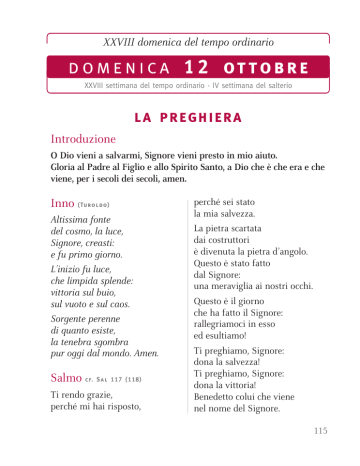 XXVIII domenica del tempo ordinario d o m e n i c a 1 2 ottobre XXVIII settimana del tempo ordinario - IV settimana del salterio la preghiera Introduzione O Dio vieni a salvarmi, Signore vieni presto in mio aiuto. Gloria al Padre al Figlio e allo Spirito Santo, a Dio che è che era e che viene, per i secoli dei secoli, amen. Inno ( Tu r o l d o ) Altissima fonte del cosmo, la luce, Signore, creasti: e fu primo giorno. L’inizio fu luce, che limpida splende: vittoria sul buio, sul vuoto e sul caos. Sorgente perenne di quanto esiste, la tenebra sgombra pur oggi dal mondo. Amen. Salmo c f. S a l 1 1 7 ( 1 1 8 ) Ti rendo grazie, perché mi hai risposto, perché sei stato la mia salvezza. La pietra scartata dai costruttori è divenuta la pietra d’angolo. Questo è stato fatto dal Signore: una meraviglia ai nostri occhi. Questo è il giorno che ha fatto il Signore: rallegriamoci in esso ed esultiamo! Ti preghiamo, Signore: dona la salvezza! Ti preghiamo, Signore: dona la vittoria! Benedetto colui che viene nel nome del Signore. 115 Vi benediciamo dalla casa del Signore. Il Signore è Dio, egli ci illumina. Formate il corteo con rami frondosi fino agli angoli dell’altare. Sei tu il mio Dio e ti rendo grazie, sei il mio Dio e ti esalto. Rendete grazie al Signore, perché è buono, perché il suo amore è per sempre. Ripresa della Parola di Dio del giorno Eliminerà la morte per sempre. Il Signore Dio asciugherà le lacrime su ogni volto, l’ignominia del suo popolo farà scomparire da tutta la terra (Is 25,8). Cantico di Zaccaria o di Maria o di Simeone (vedi bandella) Lode e intercessione Rit.: Dio della vita, ascoltaci! n Oggi facciamo memoria della tua risurrezione: la speranza che ne promana sia per noi balsamo che cura ogni ferita. n Ti affidiamo coloro che soffrono e piangono, perché possano incontrare fratelli e sorelle capaci di mostrare loro il tuo amore che guarisce. n Affinché coloro che disperano e non vedono la luce possano sperimentare la tua presenza vivificante. Padre nostro Orazione (vedi Colletta) 116 domenica 12 ottobre - XXVIII domenica del tempo ordinario la messa antifona d’ingresso Sal 129 (130),3-4 Se consideri le nostre colpe, Signore, chi potrà resistere? Ma presso di te è il perdono, o Dio di Israele. Gloria p. 304 c o l l e t ta Ci preceda e ci accompagni sempre la tua grazia, Signore, perché, sorretti dal tuo paterno aiuto, non ci stanchiamo mai di operare il bene. Per il nostro Signore Gesù Cristo... oppure O Padre, che inviti il mondo intero alle nozze del tuo Figlio, donaci la sapienza del tuo Spirito, perché possiamo testimoniare qual è la speranza della nostra chiamata, e nessun uomo abbia mai a rifiutare il banchetto della vita eterna o a entrarvi senza l’abito nuziale. Per il nostro Signore Gesù Cristo... 117 p r i m a l e t t u r a Is 25,6-10a Dal libro del profeta Isaìa 6 Preparerà il Signore degli eserciti per tutti i popoli, su questo monte, un banchetto di grasse vivande, un banchetto di vini eccellenti, di cibi succulenti, di vini raffinati. 7 Egli strapperà su questo monte il velo che copriva la faccia di tutti i popoli e la coltre distesa su tutte le nazioni. 8 Eliminerà la morte per sempre. Il Signore Dio asciugherà le lacrime su ogni volto, l’ignominia del suo popolo farà scomparire da tutta la terra, poiché il Signore ha parlato. 9 E si dirà in quel giorno: «Ecco il nostro Dio; in lui abbiamo sperato perché ci salvasse. Questi è il Signore in cui abbiamo sperato; rallegriamoci, esultiamo per la sua salvezza, 10poiché la mano del Signore si poserà su questo monte». – Parola di Dio. s a l m o r e s p o n s o r i a l e 22 (23) Rit. Abiterò per sempre nella casa del Signore. 1 Il Signore è il mio pastore: non manco di nulla. Su pascoli erbosi mi fa riposare, ad acque tranquille mi conduce. 3 Rinfranca l’anima mia. Rit. 2 Mi guida per il giusto cammino a motivo del suo nome. 118 domenica 12 ottobre - XXVIII domenica del tempo ordinario 4 Anche se vado per una valle oscura, non temo alcun male, perché tu sei con me. Il tuo bastone e il tuo vincastro mi danno sicurezza. Rit. 5 Davanti a me tu prepari una mensa sotto gli occhi dei miei nemici. Ungi di olio il mio capo; il mio calice trabocca. Rit. 6 Sì, bontà e fedeltà mi saranno compagne tutti i giorni della mia vita, abiterò ancora nella casa del Signore per lunghi giorni. Rit. s e c o n d a l e t t u r a Fil 4,12-14.19-20 Dalla Lettera di san Paolo apostolo ai Filippési Fratelli, 12so vivere nella povertà come so vivere nell’abbondanza; sono allenato a tutto e per tutto, alla sazietà e alla fame, all’abbondanza e all’indigenza. 13Tutto posso in colui che mi dà la forza. 14Avete fatto bene tuttavia a prendere parte alle mie tribolazioni. 19 Il mio Dio, a sua volta, colmerà ogni vostro bisogno secondo la sua ricchezza con magnificenza, in Cristo Gesù. 20 Al Dio e Padre nostro sia gloria nei secoli dei secoli. Amen. – Parola di Dio. 119 c a n t o a l va n g e lo c f. E f 1 , 1 7 - 1 8 Alleluia, alleluia. Il Padre del Signore nostro Gesù Cristo illumini gli occhi del nostro cuore per farci comprendere a quale speranza ci ha chiamati. Alleluia, alleluia. va n g e lo M t 2 2 , 1 - 1 4 ( l e t t. b r e v e 2 2 , 1 - 1 0 ) X Dal Vangelo secondo Matteo In quel tempo, 1Gesù riprese a parlare con parabole [ai capi dei sacerdoti e ai farisei] e disse: 2«Il regno dei cieli è simile a un re, che fece una festa di nozze per suo figlio. 3Egli mandò i suoi servi a chiamare gli invitati alle nozze, ma questi non volevano venire. 4 Mandò di nuovo altri servi con quest’ordine: Dite agli invitati: “Ecco, ho preparato il mio pranzo; i miei buoi e gli animali ingrassati sono già uccisi e tutto è pronto; venite alle nozze!”. 5Ma quelli non se ne curarono e andarono chi al proprio campo, chi ai propri affari; 6altri poi presero i suoi servi, li insultarono e li uccisero. 7Allora il re si indignò: mandò le sue truppe, fece uccidere quegli assassini e died