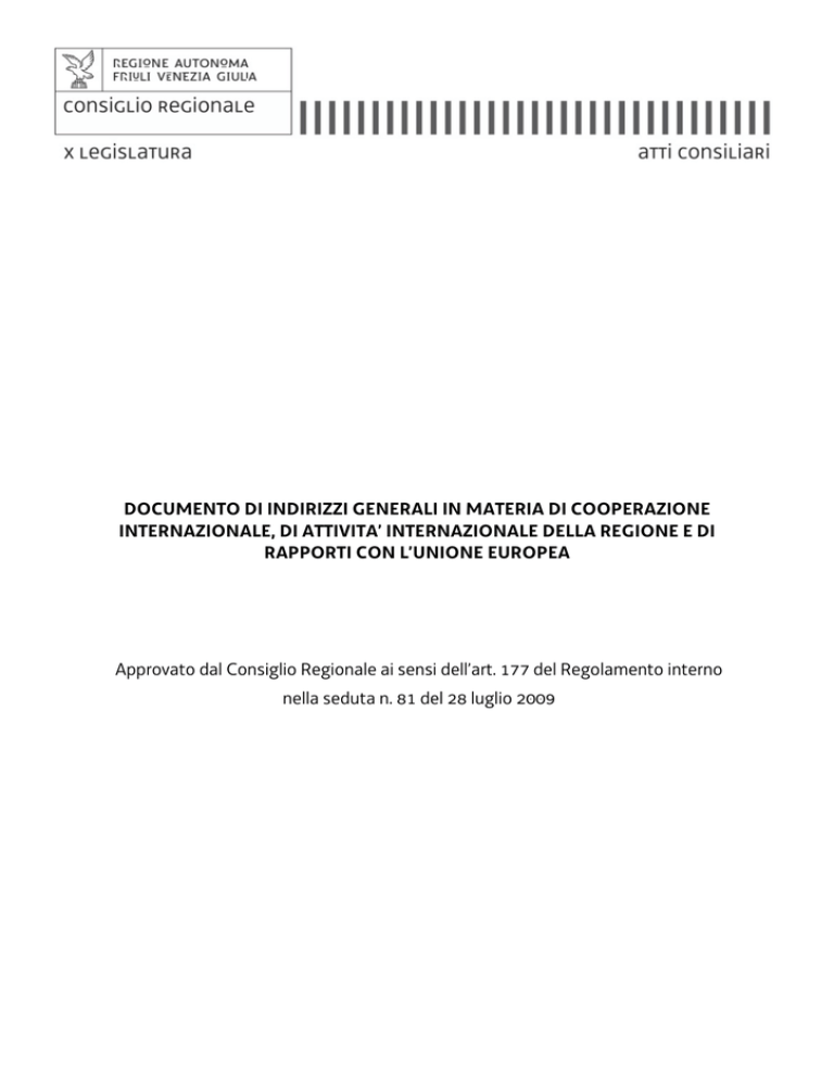 DOCUMENTO DI INDIRIZZI GENERALI IN MATERIA DI COOPERAZIONE INTERNAZIONALE, DI ATTIVITA’ INTERNAZIONALE DELLA REGIONE E DI RAPPORTI CON L’UNIONE EUROPEA Approvato dal Consiglio Regionale ai sensi dell’art. 177 del Regolamento interno nella seduta n. 81 del 28 luglio 2009 DOCUMENTO DI INDIRIZZI GENERALI IN MATERIA DI COOPERAZIONE INTERNAZIONALE, DI ATTIVITA’ INTERNAZIONALE DELLA REGIONE E DI RAPPORTI CON L’UNIONE EUROPEA Il Consiglio regionale considerato che l’art. 18 della legge statutaria 17/2007, sulla forma di governo, nel disciplinare i rapporti tra il Presidente della Regione e il Consiglio regionale per quanto riguarda l’attività internazionale della Regione, affida al Presidente della Regione la responsabilità di tale attività prevedendo che essa debba essere esercitata “nel rispetto degli indirizzi del Consiglio regionale”; considerato che, a tal fine, lo stesso articolo 18, al comma 2, prevede che il Consiglio approvi un “documento pluriennale di indirizzi in materia di cooperazione internazionale e di attività internazionale della Regione”; considerato che tale disposizione legislativa è stata attuata dal regolamento interno del Consiglio regionale, con l’art. 177, commi da 1 a 3, ove si prevede: - che il documento abbia validità per l’intera legislatura, fatta salva la possibilità di aggiornarlo nel corso della legislatura stessa, con le stesse modalità con cui è stato approvato; - che il documento debba essere predisposto dalla V Commissione permanente, la quale può acquisire elementi di informazione e documentazione dalla Giunta; - che il documento una volta licenziato dalla Commissione debba essere sottoposto all’esame dell’Assemblea che lo approva con apposita mozione a maggioranza assoluta dei componenti; considerato inoltre che l’art. 17, comma 1, della legge statutaria 17/2007, affida al Presidente della Regione il compito di promuovere la più ampia partecipazione della Regione alle decisioni della UE, “nel quadro degli indirizzi stabiliti dal Consiglio regionale”; considerato che, in attesa dell’adeguamento dello statuto speciale della Regione alla riforma costituzionale del 2001, i poteri della Regione in materia di politica internazionale sono quelli previsti dal titolo V della parte II della Cost. come riformato dalla legge cost. 3/2001 (applicabile anche alla Regione per la parte che ne amplia la sfera di autonomia); considerato che la norma fondamentale in materia è l’art. 117 della Costituzione, che definisce le competenze dello Stato e delle Regioni in materia di rapporti internazionali e con l’Unione europea, attribuendo allo Stato la competenza legislativa esclusiva in materia di politica estera, di rapporti internazionali dello Stato e di rapporti dello Stato con la UE, e alla Regione le materie dei “rapporti internazionali e con la UE delle Regioni” e del “commercio con l’estero”, nel rispetto dei principi fondamentali stabiliti dalla legislazione statale; considerato che, per quanto riguarda i rapporti internazionali, l’art. 117, nono comma, prevede che le Regioni, nelle materie di loro competenza, possono concludere accordi con Stati e intese con enti territoriali interni ad altro Stato, nei casi e nei modi e con le forme disciplinati da leggi dello Stato e che inoltre l’art. 117, quinto comma, prevede che le Regioni provvedono all’attuazione ed esecuzione degli accordi internazionali nelle materie di loro competenza e nel rispetto delle norme di procedura stabilite da legge dello Stato; considerato che, per quanto riguarda i rapporti con l’Unione Europea, l’art. 117, quinto comma, prevede che le Regioni, nelle materie di loro competenza, partecipano alle decisioni dirette alla formazione degli atti normativi comunitari (cd. fase ascendente del diritto comunitario) e provvedono alla loro attuazione ed esecuzione (cd. fase discendente), tutto ciò nel rispetto delle norme di procedura stabilite da legge dello Stato; considerato che a tali norme costituzionali è stata data attuazione, in tema di rapporti internazionali delle Regioni, con l’art. 6 della legge 131/2003(Legge La Loggia) e in tema di rapporti comunitari, con l’art. 5 della legge 131/2003 e gli articoli 5, 16 e 16 bis della legge 11/2005 (Legge Buttiglione); considerato che le citate leggi 131/2003 e 11/2005 contengono una clausola di salvaguardia della specialità e inoltre l’art. 11 della legge La Loggia attribuisce espressamente alle norme di attuazione degli statuti speciali la facoltà di prevedere “disposizioni specifiche per la disciplina delle attività regionali di competenza in materia di rapporti internazionali e comunitari”; considerato che tuttavia non esiste ancora per la nostra Regione una specifica normativa di attuazione statutaria che deve essere ancora elaborata dalla Commissione paritetica; considerato che la Regione Friuli Venezia Giulia, per la sua collocazione geografica, caratterizzata dalla prossimità con gli stati del centro – est Europa da poco entrati nella UE o in procinto di entrarvi, è al centro di questa nuova Europa ed è destinata a rivestire un ruolo di cerniera con le realtà istituzionali, sociali ed economiche che ne fanno parte; considerato altresì che tale collocazione geografica pone questa Regione al centro di fondamentali direttrici di traffico sia nella direzione est-ovest (“Corridoio 5”), che in quella nord-sud (Corridoio adriatico-baltico); considerato che tale collocazione geografica, assieme alle caratteristiche economiche del tessuto produttivo di questa Regione, caratterizzato da piccole e medie imprese orientate ai mercati esteri, rende opportuno definire strategie che favoriscano la competitività del sistema produttivo regionale e supportino il processo di internazionalizzazione delle imprese regionali; ritenuto pertanto di definire, nell’ambito del documento di indirizzi previsto dall’art. 18, comma 2, della legge 17/2007, le linee strategiche del