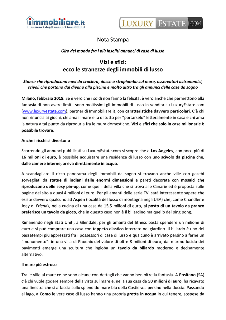 Nota Stampa Giro del mondo fra i più insoliti annunci di case di lusso Vizi e sfizi: ecco le stranezze degli immobili di lusso Stanze che riproducono navi da crociera, docce a strapiombo sul mare, osservatori astronomici, scivoli che portano dal divano alla piscina e molto altro tra gli annunci delle case da sogno Milano, febbraio 2015. Se è vero che i soldi non fanno la felicità, è vero anche che permettono alla fantasia di non avere limiti: sono moltissimi gli immobili di lusso in vendita su LuxuryEstate.com (www.luxuryestate.com), partner di Immobiliare.it, con caratteristiche davvero particolari. C’è chi non rinuncia ai giochi, chi ama il mare e fa di tutto per “portarselo” letteralmente in casa e chi ama la natura a tal punto da riprodurla fra le mura domestiche. Vizi e sfizi che solo in case milionarie è possibile trovare. Anche i ricchi si divertono Scorrendo gli annunci pubblicati su LuxuryEstate.com si scopre che a Los Angeles, con poco più di 16 milioni di euro, è possibile acquistare una residenza di lusso con uno scivolo da piscina che, dalle camere interne, arriva direttamente in acqua. A scandagliare il ricco panorama degli immobili da sogno si trovano anche ville con gazebi sorvegliati da statue di indiani dalle enormi dimensioni e pareti decorate con mosaici che riproducono delle sexy pin-up, come quelli della villa che si trova alle Canarie ed è proposta sulle pagine del sito a quasi 4 milioni di euro. Per gli amanti delle serie TV, sarà interessante sapere che esiste davvero qualcuno ad Aspen (località del lusso di montagna negli USA) che, come Chandler e Joey di Friends, nella cucina di una casa da 15,5 milioni di euro, al posto di un tavolo da pranzo preferisce un tavolo da gioco, che in questo caso non è il biliardino ma quello del ping pong. Rimanendo negli Stati Uniti, a Glendale, per gli amanti del fitness basta spendere un milione di euro e si può comprare una casa con tappeto elastico interrato nel giardino. Il biliardo è uno dei passatempi più apprezzati fra i possessori di case di lusso e qualcuno è arrivato persino a farne un “monumento”: in una villa di Phoenix del valore di oltre 8 milioni di euro, dal marmo lucido dei pavimenti emerge una scultura che ingloba un tavolo da biliardo moderno e decisamente alternativo. Il mare più estroso Tra le ville al mare ce ne sono alcune con dettagli che vanno ben oltre la fantasia. A Positano (SA) c’è chi vuole godere sempre della vista sul mare e, nella sua casa da 50 milioni di euro, ha ricavato una finestra che si affaccia sullo splendido mare blu della Costiera… persino nella doccia. Passando al lago, a Como le vere case di lusso hanno una propria grotta in acqua in cui tenere, sospese da apposite gru, le barche sempre pronte a essere calate per un giro: nello specifico una delle ville con questa caratteristica è in vendita sul portale per 28 milioni di euro. Andando all’estero, in Galizia è in vendita per 2,5 milioni di euro una villa che non solo ha diretto sbocco sulla spiaggia, ma conta perfino su un chioschetto privato, in pieno stile Billionaire. In Brasile c’è chi non si accontenta del mare e della vista spettacolare dalla propria terrazza da 1,5 milioni di euro, e allora taglia parte della balconata per ricavarci una magnifica piscina a sfioro sulla spiaggia di San Paolo. C’è poi chi, forse per combattere la nostalgia di lussuose vacanze, si è fatto realizzare in casa una sala che riproduce esattamente il bar di una nave da crociera, con tanto di soffitto celeste e nuvole bianche: questa villa si trova in Sud Africa e vale poco più di 1 milione di euro. Per gli amanti della natura Esistono proprietari che amano la natura a tal punto da non volerci rinunciare nemmeno quando sono fra le mura domestiche: in Arizona, per 1,5 milioni di euro, è in vendita una villa caratterizzata da un’enorme voliera con tanto di gabbiette e alberi su cui gli amici alati possono volare liberamente. C’è chi, nel suo giardino Zen in Thailandia, in una villa da oltre 12 milioni di euro, ha fatto realizzare con la pietra dei tentacoli di polpo che fuoriescono dall’erbetta. Nel nostro Paese, a Santa Marinella (RM), è in vendita per 2,8 milioni di euro una casa sospesa a 20 metri dal suolo con tanto di osservatorio astronomico privato. Quando la vita non consente di perdere tempo a osservare le stelle, c’è chi se le fa dipingere sul soffitto: una casa di Miami che vale oltre 15 milioni di euro offre nella camera da letto una riproduzione perfetta della Via Lattea. Per ulteriori informazioni: Ufficio Stampa Gruppo Immobiliare.it Andrea Polo - Vittoria Giannuzzi – Federica Tordi 348.0186418 - 392.9252595 – 391.4738883 02.87107413 – 08 - 09; 02.00661180 - 54 - 59 [email protected] MY PR per Immobiliare.it Roberto Grattagliano – Simone Rossi – Filippo Quartu – Paola Gianderico 02.54123452 [email protected], [email protected], [email protected], [email protected]