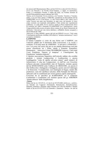 do misura dell’illuminamento Phot, nel lat FACULA, dim di FAX-CIS face, torcia cui Fiàccola e in Favilla (Ved Fiamma…), eppoi, in onomastica, Fedra e il mitologico Fetonte, il figlio del Sole, cui Fetònte (Genere di uccelli Pelecaniformi) questo adottato dal 1820. Tòrcia, cui la locuzione Torcia elettrica, con Torcètto, Torcièra e Torcière, infine, è un esot franc attinto a TORCHE, considerato un discendente del lat TORQUERE torcere (Ved Inciso...) e che Torcia abbia a che vedere con il verbo Torcere non pare una forzatura; in ogni caso, nel passato, le torce erano costruite con materiale attorcigliàto e fatte ruotare per segnalazioni codificate. La culla della Torcia elettrica spetta ai Paesi anglosassoni dove fu costruita nel 1896 e chiamata FLASHLIGHT luce lampeggiante, causa l’impossibilità della tecnica di poter allora contare di un flusso ininterrotto di elettricità. I brevetti per una torcia tubolare e affidabile furono assegnati a David Misell dal 1895. Attraverso il franc RIDER, questo dal ted ant RIDAN torcere, l’ital conta l’omologismo prefissato Arridàre (AD allativo) “termine marinaresco” con il sostantivo Arridatòio. LAMPONE Il lemma Lampòne ci viene da una forma sett L’AMPON, con l’articolo saldato per il fenomeno della concrezione, e la vocale e restituita. È di tema med, da AMPOMA - A privativo e POMA(O) non è un pomo nel senso che per la sua minuta dimensione non può essere classificato tra i Pomi, simile a Pometto, Pomodoro, Pomarancia... Attraverso il franc FRAMBOISE lampone, l’ital conta l’esot Framboise “liquore al lampone” e l’omologismo fig Framboèsia “malattia tropicale”. L’identico meccanismo linguistico dell’articolo saldato che avrebbe prodotto i termini Lampasciòne o Lambasciòne o ancora Lambàggiòne “sorta di cipolla selvatica amara” quali tentativi di italianizzarre il volg mer Lampasciuni; vrs dall’inc con Cresciòne (erbacea piccante commestibile) snm di Nasturzio, termine questo dal lat SENECIONEM sotto l’influsso di CRESCERE, cui ancora il dim Sollècciola o Salèggiola o Solèggiola, questo snm di Calderugia e di Senecione. I Lampasciùni, così omologato in lingua, stando alle preferenze, sono dei cipollacci selvatici, della Famiglia dei Muscari, utilizzati cotti in condimento per il loro gustoso sapore amarognolo. Crescione ha lo specifico gr KARDAMON cui il composto Cardamònio o Cardamòne con Amòmo questo dal gr AMOMON “pianta erbacea” delle Zingiberàcee. \ Statua Stàtua dal lat inv STATUA, è il devb da STATUERE deliberare, stabilire, cui Statuàle con l’opposto Antistatuàle, Statualizzàre, Statualizzaziòne, Statuària, Statuàrio e Statuìna, eppoi Statuìre con il Pp ital Statuìto e Statùto fedele al Pp lat STATUTUS con Statutàle e Statutàrio, Statùra inv dal lat 351 STATURA lo stare ritto con Staturàle e, dai risvolti verbali STATUIRESTITUERE, i prefissati Destituìre da DE STITUERE con Destituìto e Destituziòne, Istituìre o l’aferetico Stituìre col proprio Pp Istituìto o Instituìre da IN STITUERE con Istituèndo o Instituèndo, Istitutìvo, Istitùto o Institùto dal Pp lat INSTITUTUM, Istitutòre o Institutòre con Istitutrìce o Institutrìce, Istituziòne o Instituziòne con Istituzionàle, Istituzionalìsmo, Istituzionalizzàre e Istutizionalizzaziòne. Restituìre da RE STITUERE con Restituìbile, Restituìto Restitutìvo, Restitutòre, Restitutòrio e Restituziòne, Sostituìre da SUBSTITUERE con la forma sostantivata Sostitùto fedele al Pp lat SUB STITUTUS e la forma aggettivata Sostituìto dal Pp ital, cui Sostituìbile con Sostituibilità con l’opposto Insostituìbile, eppoi Sostitutìvo, Sostitutòre e Sostituziòne. \ La statua più alta al mondo è di un Budda in Cina, alta 128 metri. \ La rad è l’antichissima STHA fermarsi cui Stàbile con Stabilimènto, Stabilìre, Stabilità, Stabilitùra e Stabilizzaziòne, l’ingl STEADY stabile cui il glb composto Steadicam “strumento per la stabilità della cinepresa questa in ingl CAMERA. i composti e prefissati Astàbile (A privativo), Bistàbile (BIS due volte), Fotostàbile, Instàbile e Instabilità (IN negativo), Destabilizzàre con Destabilizzaziòne, Metastàbile, Monostàbile, Prestabilìre con Prestabilìto, Ristabilìre con Ristabilimènto e Ristabilìto, Termostàbile; Stàbbio (nome di strumento di STARE vale “stalla” e snm di Concime), Stabbiàre, Stabulàre e Stabulaziòne. Stàre, usato anche come snm di Essere, dal lat inv STARE, già gr HISTANAI di HISTEMI io sto, con Instàre o Istàre “insistere” e Stàto questo sostantivato dal Pp STATUS con un obsoleto Sùto, il prefissato Antistàto, Statàle, Statalìsmo e Statalìstico, Statalizzàre con Statalizzaziòne, Statàrio, Stàtico, variante obsoleta Stàdico, dal lat STATICUNM e Staticità con i contrari Astàtico con Asticità (pref A privativo), con un desueto Stàdico; attraverso il franc ETAGE tratto dal lat STATICUM si conta il lemma glb Etagere-étager “mobile a scaffale” snm di Cantoniera. Già gr STATIKOS, il percorso prosegue col prefissato Antistàtico, Stàtica, Staticamènte, Staticìsmo con Staticìsta, Staticità, Statìna (termine chimico, col relativo suff INA), Statìno, Statìsta, Statìstica con Statìstico, Statìvo con un parasnm Statìvo attraverso il ted STATIV sostegno, Statizzàre con Statizzaziòne, Statòre attraverso l’ingl STATOR, l’inv dal lat Status, la locuzione glb lat-ingl Status symbol, la locuzione Status quo con la variante Statu quo “stato attuale” in correlazione con Quo ante “stato precedente” direttamente dalla locuzione lat IN STATU QUO ANTE nelle stato precedente; eppoi un prefissato Enstatìte “minerale” dal gr ENSTATES che si oppone, il pref-suff *STATO dal gr STATES-STATOS di HISTEMI io sto (Ved Cellulosa in Terra…) per composizioni quali Statocìste o Statocìsti (col gr KYSTIS sacco), Statòlito o Statòlite (col suff LITO o LITE) con Statolìtico,