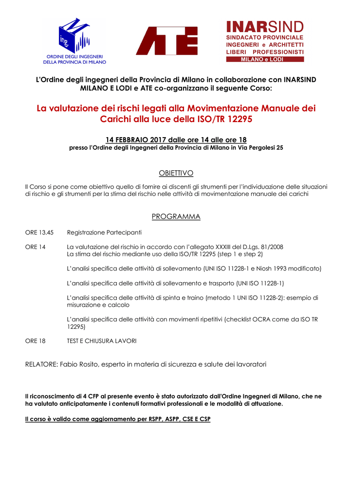 L'Ordine degli ingegneri della Provincia di Milano in collaborazione con INARSIND MILANO E LODI e ATE co-organizzano il seguente Corso: La valutazione dei rischi legati alla Movimentazione Manuale dei Carichi alla luce della ISO/TR 12295 14 FEBBRAIO 2017 dalle ore 14 alle ore 18 presso l’Ordine degli Ingegneri della Provincia di Milano in Via Pergolesi 25 OBIETTIVO Il Corso si pone come obiettivo quello di fornire ai discenti gli strumenti per l’individuazione delle situazioni di rischio e gli strumenti per la stima del rischio nelle attività di movimentazione manuale dei carichi PROGRAMMA ORE 13.45 Registrazione Partecipanti ORE 14 La valutazione del rischio in accordo con l’allegato XXXIII del D.Lgs. 81/2008 La stima del rischio mediante uso della ISO/TR 12295 (step 1 e step 2) L’analisi specifica delle attività di sollevamento (UNI ISO 11228-1 e Niosh 1993 modificato) L’analisi specifica delle attività di sollevamento e trasporto (UNI ISO 11228-1) L’analisi specifica delle attività di spinta e traino (metodo 1 UNI ISO 11228-2): esempio di misurazione e calcolo L’analisi specifica delle attività con movimenti ripetitivi (checklist OCRA come da ISO TR 12295) ORE 18 TEST E CHIUSURA LAVORI RELATORE: Fabio Rosito, esperto in materia di sicurezza e salute dei lavoratori Il riconoscimento di 4 CFP al presente evento è stato autorizzato dall'Ordine Ingegneri di Milano, che ne ha valutato anticipatamente i contenuti formativi professionali e le modalità di attuazione. Il corso è valido come aggiornamento per RSPP, ASPP, CSE E CSP L'Ordine degli ingegneri della Provincia di Milano in collaborazione con INARSIND MILANO E LODI e ATE co-organizzano il seguente Corso: La valutazione dei rischi legati alla Movimentazione Manuale dei Carichi alla luce della ISO/TR 12295 14 FEBBRAIO 2017 dalle ore 14 alle ore 18 Pregasi compilare in stampatello e trasmettere via e-mail a: [email protected] ING. ARCH. GEOM. ALTRO BARRARE LA CASELLA CORRETTA Nominativo del partecipante al seminario: Intestazione fattura: Indirizzo: Località: Prov: Partita IVA: Codice Fiscale: Telefono: Fax: e-mail: Per il rilascio dei CFP vi preghiamo di indicare i seguenti dati: Codice Fiscale del partecipante Albo, Numero e Provincia iscrizione Vi preghiamo inoltre di barrare la casella corrispondente all’aggiornamento al quale siete interessati: RSPP, ASPP CSE, CSP Quota di Partecipazione: € 50,00 IVA inclusa per gli iscritti ad INARSIND Quota di Partecipazione:: € 60,00 IVA inclusa per tutti gli altri partecipanti allegare copia del bonifico bancario effettuato sulle seguenti coordinate: IBAN: IT09L 05696 01612 000007945X48 intestato a: Inarsind – Milano e Lodi presso la Banca Popolare di Sondrio – agenzia 13 – viale Monte Santo 8 – Milano. Data Firma Per informazioni contattare la segreteria INARSIND MILANO E LODI: tel. 392 6427512 [email protected] http://www.inarsindmilano.it Autorizzo il trattamento dei miei dati personali ai sensi del D.lgs 196/03 Data Firma