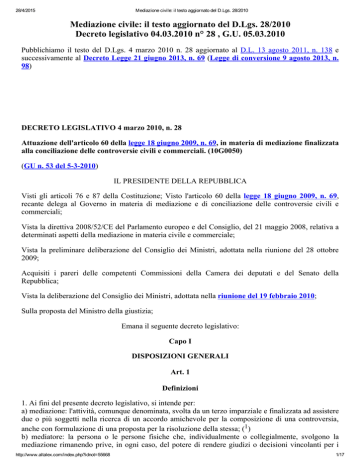 28/4/2015 Mediazione civile: il testo aggiornato del D.Lgs. 28/2010 Mediazione civile: il testo aggiornato del D.Lgs. 28/2010 Decreto legislativo 04.03.2010 n° 28 , G.U. 05.03.2010 Pubblichiamo il testo del D.Lgs. 4 marzo 2010 n. 28 aggiornato al D.L. 13 agosto 2011, n. 138 e successivamente al Decreto Legge 21 giugno 2013, n. 69 (Legge di conversione 9 agosto 2013, n. 98) DECRETO LEGISLATIVO 4 marzo 2010, n. 28 Attuazione dell'articolo 60 della legge 18 giugno 2009, n. 69, in materia di mediazione finalizzata alla conciliazione delle controversie civili e commerciali. (10G0050) (GU n. 53 del 532010) IL PRESIDENTE DELLA REPUBBLICA Visti gli articoli 76 e 87 della Costituzione; Visto l'articolo 60 della legge 18 giugno 2009, n. 69, recante delega al Governo in materia di mediazione e di conciliazione delle controversie civili e commerciali; Vista la direttiva 2008/52/CE del Parlamento europeo e del Consiglio, del 21 maggio 2008, relativa a determinati aspetti della mediazione in materia civile e commerciale; Vista la preliminare deliberazione del Consiglio dei Ministri, adottata nella riunione del 28 ottobre 2009; Acquisiti i pareri delle competenti Commissioni della Camera dei deputati e del Senato della Repubblica; Vista la deliberazione del Consiglio dei Ministri, adottata nella riunione del 19 febbraio 2010; Sulla proposta del Ministro della giustizia; Emana il seguente decreto legislativo: Capo I DISPOSIZIONI GENERALI Art. 1 Definizioni 1. Ai fini del presente decreto legislativo, si intende per: a) mediazione: l'attività, comunque denominata, svolta da un terzo imparziale e finalizzata ad assistere due o più soggetti nella ricerca di un accordo amichevole per la composizione di una controversia, anche con formulazione di una proposta per la risoluzione della stessa; (1) b) mediatore: la persona o le persone fisiche che, individualmente o collegialmente, svolgono la mediazione rimanendo prive, in ogni caso, del potere di rendere giudizi o decisioni vincolanti per i http://www.altalex.com/index.php?idnot=55668 1/17 28/4/2015 Mediazione civile: il testo aggiornato del D.Lgs. 28/2010 destinatari del servizio medesimo; c) conciliazione: la composizione di una controversia a seguito dello svolgimento della mediazione; d) organismo: l'ente pubblico o privato, presso il quale puo' svolgersi il procedimento di mediazione ai sensi del presente decreto; e) registro: il registro degli organismi istituito con decreto del Ministro della giustizia ai sensi dell'articolo 16 del presente decreto, nonche', sino all'emanazione di tale decreto, il registro degli organismi istituito con il decreto del Ministro della giustizia 23 luglio 2004, n. 222. (1) La lettera che recitava: "a) mediazione: l'attivita', comunque denominata, svolta da un terzo imparziale e finalizzata ad assistere due o piu' soggetti sia nella ricerca di un accordo amichevole per la composizione di una controversia, sia nella formulazione di una proposta per la risoluzione della stessa;" è stata così sostituita dall’ art. 84, comma 1, lett. 0a), D.L. 21 giugno 2013, n. 69, convertito, con modificazioni, dalla L. 9 agosto 2013, n. 98; per l’applicabilità di tale disposizione vedi il comma 2 dell’ art. 84 del medesimo D.L. n. 69/2013. Art. 2 Controversie oggetto di mediazione 1. Chiunque puo' accedere alla mediazione per la conciliazione di una controversia civile e commerciale vertente su diritti disponibili, secondo le disposizioni del presente decreto. 2. Il presente decreto non preclude le negoziazioni volontarie e paritetiche relative alle controversie civili e commerciali, ne' le procedure di reclamo previste dalle carte dei servizi. Capo II DEL PROCEDIMENTO DI MEDIAZIONE Art. 3 Disciplina applicabile e forma degli atti 1. Al procedimento di mediazione si applica il regolamento dell'organismo scelto dalle parti. 2. Il regolamento deve in ogni caso garantire la riservatezza del procedimento ai sensi dell'articolo 9, nonche' modalita' di nomina del mediatore che ne assicurano l'imparzialita' e l'idoneita' al corretto e sollecito espletamento dell'incarico. 3. Gli atti del procedimento di mediazione non sono soggetti a formalita'. 4. La mediazione puo' svolgersi secondo modalita' telematiche previste dal regolamento dell'organismo. Capo II DEL PROCEDIMENTO DI MEDIAZIONE Art. 4 Accesso alla mediazione 1. La domanda di mediazione relativa alle controversie di cui all'articolo 2 è presentata mediante deposito di un'istanza presso un organismo nel luogo del giudice territorialmente competente per la controversia. In caso di più domande relative alla stessa controversia, la mediazione si svolge davanti http://www.altalex.com/index.php?idnot=55668 2/17 28/4/2015 Mediazione civile: il testo aggiornato del D.Lgs. 28/2010 all'organismo territorialmente competente presso il quale è stata presentata la prima domanda. Per determinare il tempo della domanda si ha riguardo alla data del deposito dell'istanza. (1) 2. L'istanza deve indicare l'organismo, le parti, l'oggetto e le ragioni della pretesa. 3. All'atto del conferimento dell'incarico, l'avvocato è tenuto a informare l'assistito della possibilità di avvalersi del procedimento di mediazione disciplinato dal presente decreto e delle agevolazioni fiscali di cui agli articoli 17 e 20. L'avvocato informa altresì l'assistito dei casi in cui l'esperimento del procedimento di mediazione è condizione di procedibilità della domanda giudiziale. L'informazione deve essere fornita chiaramente e per iscritto. In caso di violazione degli obblighi di informazione, il contratto tra l'avvocato e l'assistito è annullabile. Il documento che contiene l'informazione è sottoscritto dall'assistito e deve essere allegato all'atto introduttivo dell'eventuale giudizio. Il giudice che verifica la mancata allegazione del documento, se non provvede ai sensi dell'articolo 5, comma 1 bis, informa la parte della facoltà di chiedere la mediazione. (2) (1) Il comma che recitava: "1. La domanda di media