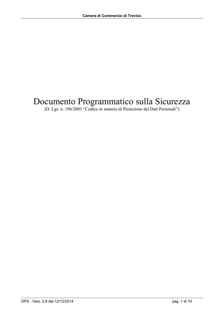 Camera di Commercio di Treviso Documento Programmatico sulla Sicurezza (D. Lgs. n. 196/2003 “Codice in materia di Protezione dei Dati Personali”) DPS - Vers. 2.8 del 12/12/2014 pag. 1 di 10 Camera di Commercio di Treviso 1. Introduzione al Documento ................................................................................................... 3 1.1 Novità introdotte rispetto alla precedente emissione ............................................................................ 3 1.2 Scopo e campo di applicazione del documento .................................................................................... 4 1.3 Riferimenti ............................................................................................................................................. 4 1.4 Termini e definizioni .............................................................................................................................. 4 2. Il Documento Programmatico ................................................................................................ 6 2.1 Disciplinare tecnico ............................................................................................................................... 6 2.2 Elenco dei Trattamenti .......................................................................................................................... 6 2.3 Compiti e Responsabilità ....................................................................................................................... 7 2.4 Analisi dei Rischi ................................................................................................................................... 7 2.5 Sicurezza Fisica e Sicurezza Logica ..................................................................................................... 7 2.6 Ripristino dei dati ................................................................................................................................... 8 2.7 Interventi formativi ................................................................................................................................. 9 2.8 Trattamenti affidati all'esterno ............................................................................................................... 9 DPS - Vers. 2.8 del 12/12/2014 pag. 2 di 10 Camera di Commercio di Treviso 1. Introduzione al Documento L’ 1 gennaio 2004 è entrato in vigore il nuovo “Codice in Materia di Protezione dei Dati Personali” (approvato con Decreto Legislativo 30 giugno 2003, n. 196) che sostituisce ogni altra norma in tema di privacy. Tale Codice ribadisce il principio che i dati personali oggetto di trattamento debbano essere custoditi e controllati, anche in relazione alle conoscenze acquisite in base al progresso tecnico, alla natura dei dati e alle specifiche caratteristiche del trattamento, in modo da ridurre al minimo, mediante l'adozione di idonee e preventive misure di sicurezza, i rischi di distruzione o perdita, anche accidentale, dei dati stessi, di accesso non autorizzato o di trattamento non consentito o non conforme alle finalità della raccolta (cfr. art.31). Nel quadro dei più generali obblighi di sicurezza sopra descritti o previsti da speciali disposizioni, i titolari del trattamento sono comunque tenuti ad adottare misure di sicurezza volte ad assicurare un livello adeguato di protezione dei dati personali. Il trattamento di dati personali è consentito solo se sono adottate le seguenti misure di sicurezza minime, nei modi previsti dall’apposito disciplinare tecnico. - Autenticazione informatica; - Adozione di procedure di gestione delle credenziali di autenticazione; - Utilizzazione di un sistema di autorizzazione; - Aggiornamento periodico dell'individuazione dell'ambito del trattamento consentito ai singoli incaricati e addetti alla gestione o alla manutenzione degli strumenti elettronici; - Protezione degli strumenti elettronici e dei dati rispetto a trattamenti illeciti di dati, ad accessi non consentiti e a determinati programmi informatici; - Adozione di procedure per la custodia di copie di sicurezza, il ripristino della disponibilità dei dati e dei sistemi; - [Tenuta di un aggiornato Documento Programmatico sulla Sicurezza]* ______________________________________________________________________________ *Dal 10 febbraio 2012 non è più obbligatorio adottare e quindi tenere aggiornato tale Documento a seguito dell’abolizione dello stesso prevista dall’art. 45 del decreto-legge n. 5 del 9 febbraio 2012 (“Disposizioni urgenti in materia di semplificazione e di sviluppo”) convertito con modificazioni dalla Legge n. 35 del 4.04.2012 . In particolare tale decreto-legge ha soppresso: - la lettera g) dell’art. 34, comma 1 del D.Lgs. n. 196/2003 (che prevedeva, tra le varie misure minime, l’adozione del DPS); - i paragrafi da 19 a 19.8 del Disciplinare Tecnico costituente l’allegato B al D.Lgs. n. 196/2003 (che prevedevano i contenuti che doveva avere il DPS); - il paragrafo 26 del Disciplinare Tecnico costituente l’allegato B al D.Lgs. n. 196/2003 (che prevedeva l’obbligo, per i titolari del trattamento, di riferire nella relazione accompagnatoria al bilancio di esercizio dell’avvenuto aggiornamento del DPS). 1.1 Novità introdotte rispetto alla precedente emissione Versione/Release n° : 2.8 Descrizione modifiche: Aggiornamento del Documento Programmatico sulla Sicurezza Motivazioni : Aggiornamento Banche Dati DPS - Vers. 2.8 del 12/12/2014 Data Versione/Release : 12/12/2014 pag. 3 di 10 Camera di Commercio di Treviso 1.2 Scopo e campo di applicazione del Documento Nonostante l’intervenuta abrogazione del Documento Programmatico sulla Sicurezza da parte dell’art. 45 del Decreto-Legge n. 5 del 9.02.2012 (convertito con modificazioni dalla Legge n. 35 del 4.04.2012), rimane comunque fermo l’obbligo, a carico del Titolare, di adottare le altre misure minime di sicurezza, previste dal sopra citato Decr