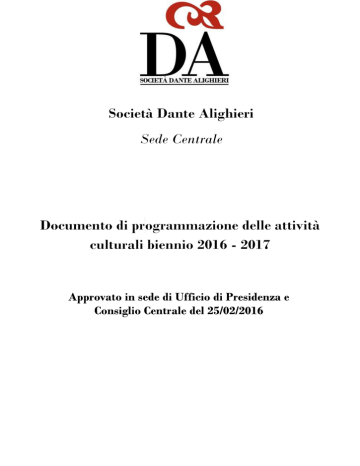 Documento di programmazione delle attività culturali per il biennio 2016-2017 INDICE SCOPO DEL DOCUMENTO ........................................................................................................... 3 TITOLO I. PROCEDURA ................................................................................................................ 5 TITOLO II OBIETTIVI FONDAMENTALI ................................................................................. 6 TITOLO III ANNIVERSARI ED EVENTI 2016-2017 ................................................................ 10 TITOLO IV DANTE ALIGHIERI 1265-1321 .............................................................................. 13 ALLEGATO ..................................................................................................................................... 15 2 Documento di programmazione delle attività culturali per il biennio 2016-2017 Documento di programmazione delle attività culturali della Società Dante Alighieri per il biennio 2016 – 2017 SCOPO DEL DOCUMENTO Visti gli articoli dello Statuto e la tradizione più che secolare della Società Dante Alighieri e in particolare l'articolo 1 dello Statuto come modificato con deliberazioni del 25 maggio 2014: “La Società Dante Alighieri. istituita nel 1889 ed eretta in Ente Morale con Regio Decreto n. 347 del 18 luglio 1893, regolata nella sue attività dalla Legge n. 411 del 3 agosto 1985, è un'associazione non lucrativa di utilità sociale ai sensi e per gli effetti della Legge n.186 del 27 luglio 2004, che esercita la propria attività attraverso la promozione della cultura e dell'arte, per la tutela e la diffusione della lingua e della cultura italiane nel mondo, ravvivando i legami dei connazionali all'estero con la madre patria e alimentando tra gli stranieri l'amore per la cultura, la civiltà e la lingua italiana”. Considerata l’opportunità di integrare, potenziare, aggregare e coordinare ad obiettivi comuni le oltre 4 mila iniziative culturali realizzate ogni anno dalla Sede Centrale e dai Comitati della Dante in Italia e all’estero. A tal fine, la Società Dante Alighieri ha deciso di proporre al Consiglio Centrale, contestualmente alla bozza di bilancio previsionale per il 2016, l'approvazione di un Documento di programmazione delle attività culturali per il biennio 2016-2017 che costituisca strumento di indirizzo e di promozione delle attività ordinariamente svolte, anche con lo scopo di aggregarle in termini di produzione collettiva alimentando il sito Internet, il canale Youtube e tutti gli strumenti forniti dai “social” su direttrici ben definite. Si ridurrà in questo modo la sensazione di azioni disparate e, singolarmente prese, di piccolo momento. Il documento verrà presentato ogni anno insieme ai documenti di bilancio in modo che la durata biennale consenta una messa a punto continua degli obiettivi attraverso il monitoraggio die risultati nel frattempo raggiunti nella prima fase di attuazione. Le scelte in termini di contenuti culturali consigliate dal presente documento non vanno considerate come esclusive. I Comitati nella propria autonomia continuano a poter realizzare liberamente iniziative non contemplate 3 Documento di programmazione delle attività culturali per il biennio 2016-2017 dal Documento programmatico. Essi saranno tuttavia consapevoli che operando sulle linee direttrici del presente documento potranno inserire le proprie attività in programmi comuni, godendo in partenza del patronato della Sede Centrale, usufruendo dell’utilizzo dei loghi che verranno diffusi per le singole iniziative e della promozione attraverso gli strumenti di comunicazione in via di realizzazione anche a favore dei Comitati. In premessa, al fine di evidenziare la funzione sociale di ispirazione pubblica svolta tradizionalmente dalla nostra associazione, il Presidente della Società ha deciso a partire dall'approvazione del presente documento la completa gratuità dei contenuti intellettuali, creativi, di cui ha piena disponibilità, con qualsiasi mezzo, nel settore della cultura - ad eccezione di quelli funzionali alla didattica e all'insegnamento nelle scuole di lingua per stranieri della Società, e anche questi ultimi nei limiti necessari alla copertura dei costi sostenuti per la loro produzione e diffusione. Il sito e i social networks verranno così arricchiti di centinaia di titoli e documenti fino ad oggi riservati ai soci. I soci della Dante, in questo modo, diventano promotori e sostenitori di una finestra di produzione creativa a disposizioni di tutti, in Italia e all'estero. Verrà al più presto predisposto, in analogia al presente Documento, un Documento di programmazione delle attività di insegnamento della lingua italiana agli stranieri e della certificazione della conoscenza della lingua italiana nel Progetto Lingua Italiana Dante Alighieri per il biennio 2016-2016. In tale documento verranno dettagliati obiettivi quantitativi, metodologie e standard di qualità. I due Documenti di programmazione, considerati unitariamente, costituiranno il Documento di programmazione delle attività dell'associazione con competenza biennale che verrà poi redatto annualmente aggiornandolo con gli elementi desunti dal monitoraggio delle attività svolte. 4 Documento di programmazione delle attività culturali per il biennio 2016-2017 TITOLO I. - PROCEDURA Art.1 Il Documento di programmazione delle attività culturali è un documento annuale con competenza biennale che ha lo scopo di indirizzare, aggregare, potenziare le oltre 4 mila iniziative ed eventi culturali realizzati annualmente dalla Società Dante Alighieri in tutte le sue articolazioni associative. Esso è approvato dal Consiglio Centrale, su proposta del consiglio di Presidenza, contestualmente al progetto di bilancio previsionale per l’anno in corso, entro il mese di febbraio di ciascun anno. Viene acquisito il parere degli organi sociali "di supporto" di cui all'articol