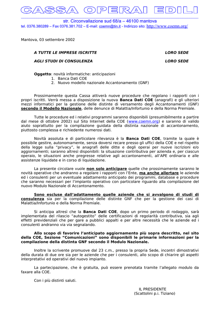 ________________________________________________________________________________ str. Circonvallazione sud 68/a – 46100 mantova tel. 0376.380289 – Fax 0376.381.702 – E-mail: [email protected] - Indirizzo sito: http://www.coemn.org/ Mantova, 03 settembre 2002 A TUTTE LE IMPRESE ISCRITTE LORO SEDE AGLI STUDI DI CONSULENZA LORO SEDE Oggetto: novità informatiche: anticipazioni 1. Banca Dati COE 2. Nuovo modello nazionale Accantonamento (GNF) Prossimamente questa Cassa attiverà nuove procedure che regolano i rapporti con i propri iscritti. Verrà messa a disposizione la nuova Banca Dati COE (anagrafi) e gli ulteriori mezzi informatici per la gestione delle distinte di versamento degli Accantonamenti (GNF) secondo il Modello Nazionale, delle denunce di Malattia/Infortunio e della Norma Premiale. Tutte le procedure ed i relativi programmi saranno disponibili (presumibilmente a partire dal mese di ottobre 2002) sul Sito Internet della COE (www.coemn.org) e saranno di valido aiuto soprattutto per la compilazione guidata della distinta nazionale di accantonamento, piuttosto complessa e richiedente numerosi dati. Novità assoluta e di particolare rilevanza è la Banca Dati COE, tramite la quale è possibile gestire, autonomamente, senza doversi recare presso gli uffici della COE e nel rispetto della legge sulla “privacy”, le anagrafi delle ditte e degli operai per nuove iscrizioni e/o aggiornamenti; saranno altresì disponibili: la situazione contributiva per azienda e, per ciascun operaio, le situazioni anche pregresse relative agli accantonamenti, all’APE ordinaria e alle assistenze liquidate e in corso di liquidazione. La presente circolare vuole non solo anticipare quelle che prossimamente saranno le novità operative che andranno a regolare i rapporti con l’Ente, ma anche allertare le aziende ed i consulenti per un eventuale adattamento anticipato dei programmi, database e procedure che saranno necessari per l’impianto operativo con particolare riguardo alla compilazione del nuovo Modulo Nazionale di Accantonamento. Sono escluse dall’adattamento quelle aziende che si avvalgono di studi di consulenza sia per la compilazione delle distinte GNF che per la gestione dei casi di Malattia/Infortunio e della Norma Premiale. Si anticipa altresì che la Banca Dati COE, dopo un primo periodo di rodaggio, sarà implementata del rilascio “autogestito” delle certificazioni di regolarità contributiva, sia agli effetti previdenziali che per gare a pubblici appalti e per altre necessità che le aziende ed i consulenti andranno via via segnalando. Allo scopo di favorire l’anticipato aggiornamento più sopra descritto, nel sito della COE, Sezione “Comunicazioni” sono disponibili le primarie informazioni per la compilazione della distinta GNF secondo il Modulo Nazionale. Inoltre la scrivente promuove dal 23 c.m., presso la propria Sede, incontri dimostrativi della durata di due ore sia per le aziende che per i consulenti, allo scopo di chiarire gli aspetti interpretativi ed operativi del nuovo impianto. La partecipazione, che è gratuita, può essere prenotata tramite l’allegato modulo da faxare alla COE. Con i più distinti saluti. IL PRESIDENTE (Scattolini p.i. Tiziano) Alla Cassa Operai Edili di Mantova Fax 0376/381702 Il/la sottoscritt___ ______________________________________________________ Titolare Socio Dipendente dell’Impresa/Studio di consulenza ____________________________________________ con codice di iscrizione COE n. _________, chiede di partecipare al Seminario promosso dalla Cassa Operai Edili di Mantova. _______________________ firma del richiedente Orario gradito: dalle ore__________ _______________________________ timbro e firma dell’Impresa o dello Studio di consulenza alle ore __________ ________________________________________________________________________________ str. Circonvallazione sud 68/a – 46100 mantova tel. 0376.380289 – Fax 0376.381.702 – E-mail: [email protected] - Indirizzo sito: www.coemn.org 1 RIEPILOGO 2 MOD.1 3 5 6 4 12 11 7 9 13 8 10 14 15 16 17 18 19 20 24 21 22 23 25 36 37 26 38 27 39 40 28 41 29 42 43 30 44 31 46 45 47 32 48 33 49 34 50 35 51 52 1 MOD.2 2 3 4 7 6 8 9 10 11 15 5 16 17 18 19 20 21 26 27 28 29 30 31 12 22 13 23 14 24 25 35 36 37 38 45 46 47 39 40 49 48 32 33 34 41 42 43 44 50 51 52 53 DISTINTA DI VERSAMENTO ACCANTONAMENTO (GNF) E CONTRIBUTI MODULO NAZIONALE __________________________________________________________ • Generalità La nuova distinta, valida per tutto il territorio nazionale, è composta di 2 Moduli: MODULO 1. comprende: - l'elencazione dei cantieri e relativa situazione; - il riepilogo degli imponibili, delle ore e delle quote di accantonamento (GNF) e contributi da versare. MODOLO 2: riguarda l'elencazione dei lavoratori occupati nel mese, le ore da ciascuno effettuate e, oltre a dati situazionali, anche l'importo di GNF da versare alla Cassa Edile. Il modulo può contenere 3 operai ripetibile in caso di necessità ulteriore, incrementando il numero progressivo di pagina. • Strutturazione della compilazione Poiché alcune Casse edili adottano il sistema di lettura ottica, i dati vanno indicati con grafica adeguata. In ciascun quadretto va indicato un solo carattere; l’allineamento è indicato per ciascun campo nelle istruzioni che seguono. Gli importi vanno arrotondati all'unità di Euro: l'arrotondamento è effettuato per eccesso se la prima cifra decimale è uguale o superiore a 5, per difetto se inferiore a 5. ISTRUZIONI PER LA COMPILAZIONE MOD. 1: 1: denuncia riepilogativa dei cantieri Campo 1 2 3 4 INTESTAZIONE Cassa edile di Codice impresa Impresa Codice consulente DATI DA INDICARE Mantova Codice attribuito dalla COE Ragione sociale Nessuno 5 6 Partita Iva Mese/anno Codice partita iva impresa 7 Allegate pagine 8 Cantiere Codificazione univoca in ambito aziendale sn 9 Denominazione e/o luogo del cantiere Individuazione cantiere sn 10 CAP Cap ove è ubicato il cantiere sn Mese e anno MM AA 