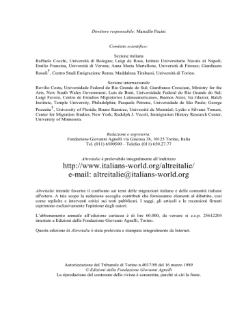 Direttore responsabile: Marcello Pacini Comitato scientifico: Sezione italiana Raffaele Cocchi, Università di Bologna; Luigi de Rosa, Istituto Universitario Navale di Napoli; Emilio Franzina, Università di Verona; Anna Maria Martellone, Università di Firenze; Gianfausto † Rosoli , Centro Studi Emigrazione Roma; Maddalena Tirabassi, Università di Torino. Sezione internazionale Rovilio Costa, Universidade Federal do Rio Grande do Sul; Gianfranco Cresciani, Ministry for the Arts, New South Wales Government; Luis de Boni, Universidade Federal do Rio Grande do Sul; Luigi Favero, Centro de Estudios Migratorios Latinoamericanos, Buenos Aires; Ira Glazier, Balch Institute, Temple University, Philadelphia; Pasquale Petrone, Universidade de São Paulo; George † Pozzetta , University of Florida; Bruno Ramirez, Université de Montréal; Lydio e Silvano Tomasi, Center for Migration Studies, New York; Rudolph J. Vecoli, Immigration History Research Center, University of Minnesota. Redazione e segreteria: Fondazione Giovanni Agnelli via Giacosa 38, 10125 Torino, Italia Tel. (011) 6500500 – Telefax (011) 650.27.77 Altreitalie è prelevabile integralmente all’indirizzo http://www.italians-world.org/altreitalie/ e-mail: [email protected] Altreitalie intende favorire il confronto sui temi delle migrazioni italiane e delle comunità italiane all'estero. A tale scopo la redazione accoglie contributi che forniscanno elementi al dibattito, così come repliche e interventi critici sui testi pubblicati. I saggi, gli articoli e le recensioni firmati esprimono esclusivamente l'opinione degli autori. L’abbonamento annuale all’edizione cartacea è di lire 60.000, da versare si c.c.p. 25612204 intestato a Edizioni della Fondazione Giovanni Agnelli, Torino. Questa edizione di Altreitalie è stata prelevata e stampata integralmente da Internet. Autorizzazione del Tribunale di Torino n.4037/89 del 16 marzo 1989 © Edizioni della Fondazione Giovanni Agnelli La riproduzione del contenuto della rivista è consentita, purchè si citi la fonte. gennaio-dicembre 1999 19 Rivista internazionale di studi sulle popolazioni di origine italiana nel mondo International journal of studies on the people of Italian origin in the world INDICE Marcello Pacini E d i t o r i a l e Italiani nel mondo e globalizzazione Saggi 7 Regina Soria The Untouchable Hollywood Italian 10 Rovílio Costa Lingua, linguas e multiculturalismo 15 Adriano Boncompagni From the Appennines to the bush: «temporary» migrants from Tuscany and the Western Australia’s «Italophobia», 1921-1939 23 Sommario | Abstract | Résumé | Resumo | Extracto 39 Rassegna Convegni L’emigrazione italiana transoceanica tra Otto e Novecento e la storia delle comunità derivate (Maddalena Tirabassi) 44 Italian Americans: A Retrospective on the Twentieth Century (Stefano Luconi e Guido Tintori) 46 Segnalazioni 50 Musei eMostre Partono i bastimenti, Le comunità eoliane negli Usa, Le comunità eoliane d’Australia (Maddalena Tirabassi) 52 Una mostra fotografica sulla presenza toscana in Australia Occidentale (Adriano Boncompagni) 54 Libri Andreina De Clementi, Di qua e di là dall’Oceano. Emigrazione e mercati nel Meridione (1860-1930) (Anna Maria Martellone) 57 Renzo Grosselli, L’emigrazione dal Trentino. Dal Medioevo alla prima guerra mondiale (Paola Corti) 59 Alberto Cabella, Elogio della libertà. Biografia di Piero Gobetti (Pietro Polito) 60 Mauro Reginato, a cura di, Dal Piemonte allo stato di Espirito Santo. Aspetti della emigrazione italiana in Brasile tra Ottocento e Novecento Maria Rosaria Ostuni, La diaspora politica dal Biellese Giorgio Jannon, Oltre gli oceani. Storia dell’emigrazione piemontese in Australia Patrizia Audenino, Paola Corti e Ada Lonni Imprenditori biellesi in Francia fra Ottocento e Novecento (Maddalena Tirabassi) 62 Philip V. Cannistraro, a cura di, The Italians of New York. Five Centuries of Struggle and Achievement (Stefano Luconi) 65 Donna R. Gabaccia, We Are What We Eat: Ethnic Food and the Making of Americans (Simone Cinotto) 68 Lewis Turco, Shaking the Family Tree: A Remembrance (Martha King) 70 Jose C. Moya, Cousins and Strangers. Spanish Immigrants in Buenos Aires, 1850-1930 (Patrizia Audenino) 71 Ludovico Incisa di Camerana, L'Argentina, gli italiani, l'Italia. Un altro destino (Paola Corti) 75 Isabel Manachino de Perez Roldan, Piemonteses en la Argentina 1876-1914 (Silvana Movino) 76 Chiara Vangelista, Terra, etnie, migrazioni. Tre donne nel Brasile contemporaneo (Eugenia Scarzanella) 77 Bill Bunbury, Rabbits and Spaghetti. Captives and Comrades. Australians, Italians and the War (Adriano Boncompagni) 78 Segnalazioni 81 Riviste Segnalazioni Tesi 84 86 Internet Dominic Candeloro H-ItAm A Virtual Piazza for Italian American Studies S i t i d i i n te r e s s e 87 104 Editoriale Italiani nel mondo e globalizzazione Marcello Pacini Oggi, da più parti, stiamo assistendo alla riscoperta degli italiani all’estero. Si tratta di una riscoperta tardiva, ma certamente interessante ove sia fondata su basi culturali e soprattutto inquadrata in uno schema di riferimento che descriva la loro realtà. Tale riscoperta si basa su una pluralità di elementi che si sono venuti intrecciando negli ultimi anni: la concessione del diritto di voto ai cittadini italiani residenti all’estero, il desiderio di vedere l’Italia presa maggiormente in considerazione a livello internazionale, con gli italiani nel mondo che possono diventare uno strumento utile di promozione degli interessi del paese; la possibilità di migliorare i rapporti con le comunità italiane grazie alle potenzialità della comunicazione sulla rete. Tutti questi motivi spingono a proporre il tema di un nuovo rapporto fra l’Italia e gli italiani all’estero cui non è estranea l’ipotesi di trovare in questi italiani un alleato utile nelle operazioni economiche e politiche di interesse dell’Italia. Di fronte a questo quadro di intenzioni progettuali emerge la necessi