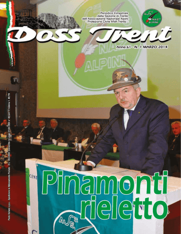 Direttore Responsabile: Roberto Gerola Sezione ANA di Trento Vicolo Benassuti, 1 Tel. 0461 985 246 - Fax 0461 230 235 E-mail: [email protected] Repertorio ROC n. 22507 In redazione: Collaboratore: Guido Vettorazzo Componenti: Giancarlo Angelini, Lorenzo Bettega, Enrico de Aliprandini, Giorgio Debiasi, Aurelio De Maria, Ivan Giovannini, Bruno Lucchini, Renzo Merler, Alberto Penasa, Marino Sandri Stampa: Litotipografia Alcione - Lavis (TN) Progetto Grafico: Renzo Merler Questo numero è stato stampato in 24.500 copie Il prossimo numero esce nel giugno del 2014 e il materiale da pubblicare deve pervenire entro il 24 maggio 2014 Occorre inviarlo a: [email protected] [email protected] oppure a: [email protected] o consegnarlo in segreteria della sezione di Trento. In copertina: Il Presidente Maurizio Pinamonti all’Assemblea Elettiva del 9 marzo scorso. (foto AGF Bernardinatti) Il Presidente con il Comitato esecutivo, i Consiglieri Sezionali e i Consiglieri di Zona, il Cappellano don Enrico Pret insieme alla Segreteria, e il Direttore del Doss Trent con il Comitato di Redazione augurano una Buona Pasqua a tutti gli Alpini, ai Soci aggregati, ai Collaboratori e alle loro Famiglie a cura di A. De Maria • 1 DICEMBRE Nella Chiesa della Santa Trinità, in occasione della celebrazione dei 450 anni della chiusura del Concilio di Trento, la Sezione è stata rappresentata dal consigliere Corrado Franzoi con Vessillo e da una delegazione di Alpini. • 4 DICEMBRE Il Vice Presidente della Sezione Attilio Martini e Ferdinando Carretta con Vessillo, hanno rappresentato la Sezione alla Caserma Cesare Battisti in occasione della celebrazione della cerimonia di Santa Barbara Patrona degli Artiglieri. • 8 DICEMBRE L’Associazione Arma Aereonautica ha celebrato la festività della Madonna di Loreto Patrona degli Aviatori, con Messa officiata nella Badia di S. Lorenzo. La Sezione è stata rappresentata dall’Alpino Aurelio de Maria e Ferdinando Carretta con Vessillo. • 10 FEBBRAIO L’ Associazione Nazionale Venezia Giulia e Dalmazia ha celebrato il giorno del ricordo. A Trento è stata celebrata la Messa nella Badia di S. Lorenzo, presente per la Sezione Ferdinando Carretta con Vessillo. A Rovereto era presente il Vice Presidente Ennio Barozzi e l’Alpino Renzo Eccher con Vessillo e numerosi Alpini con i rispettivi gagliardetti ANA. A Trieste, il giorno precedente, sempre nella “Giornata del ricordo” alla Foiba di Basovizza la Sezione era rappresentata dal Vice Presidente Marino Sandri e Ferdinando Carretta con Vessillo. • 21 FEBBRAIO Cerimonia del cambio del comandate del 5° Reggimento Alpini fra il cedente Col.f. (alp) t. ISSIMI Michele Biasiutti e il subentrante Col.f. (alp.) t. ISSIMI Carlo Cavalli alla Caserma “Menini - De Caroli” di Vipiteno. La Sezione è stata rappresentata dal Gen. Carlo Frigo e da Ferdinando Carretta con Vessillo. 3 N. 1 - MARZO 2014 UN PLEBISCITO RICONFERMA PINAMONTI Monica Sighel prima donna nel Consiglio Direttivo Sezionale R imarrà negli annali della storia Alpina l’assemblea dei delegati della Sezione Ana di Trento, nell’edizione 2014. Certamente per il plebiscito che Maurizio Pinamonti ha ottenuto nella riconferma a Presidente Sezionale (era l’unico candidato), ma soprattutto per il messaggio che le Penne Nere trentine hanno dato alla società che li circonda. Ancora una volta un messaggio al passo coi tempi, un messaggio di rinnovamento, di modernità, di fedeltà ai valori che da oltre 90 anni portano avanti: amore della patria, onore alla bandiera, trasmettere ai giovani il dovere della memoria, i principi della solidarietà. Infatti, a parte i 17.500 voti (su 17.700) a Maurizio Pinamonti, per altri tre anni Presidente Sezionale, risaltano i 13.925 voti per Monica Sighel, la prima Consigliere Sezionale donna, cinque anni di naia, caporalmaggiore, iscritta al Gruppo ANA di Cadine dove abita con i genitori adottivi (infatti è arrivata in Italia dallo Sri Lanka all’età di sette anni). Un messaggio, questo degli Alpini, dai connotati storici. di Roberto Gerola La cronaca della giornata La scaletta dell’evento si è svolta all’insegna della tradizione. Messa in Duomo alle 8.15, con il saluto dell’arcivescovo Luigi Bressan, che ha sottolineato ancora una volta il ruolo dell’ANA, la coesione, la rete di solidarietà in Trentino e fuori, la “memoria” con la chiesa di S. Zita, la Campana dei Caduti e tanti altri luoghi. Poi, la celebrazione del rito religioso da parte di don L’arcivescovo Luigi Bressan porta il suo saluto alle Penne Nere trentine, prima della Santa Messa in Duomo, sottolineando il fondamentale ruolo degli Alpini, con i propri valori, nella società. (foto AGF Bernardinatti) 4 Stefano Pret (cappellano degli Alpini) insieme ad altri sacerdoti e diaconi, con l’accompagnamento del Coro Sezionale. Al termine, in piazza Duomo, onori alla bandiera e al Vessillo Sezionale. Quindi sfilata per le vie di Trento, con in testa la Fanfara Sezionale e con il Vessillo scortato dal Consiglio Sezionale, dalle autorità, dalle rappresentanze d’arma, da oltre 200 Gagliardetti, da quasi mille Penne Nere. Punto d’arrivo la Sala della Cooperazione per l’assemblea dei 769 delegati in rappresentanza dei 269 Gruppi Ana sparsi nelle città e nelle valli del Trentino in una “rete” capillare e radicata sul territorio. I lavori (presieduti dal Presidente emerito Giuseppe Dematté) sono stati aperti con la relazione del presidente uscente Maurizio Pinamonti. In sala, anche il Presidente della Sezione ANA di Bolzano, Ferdinando Scafariello, con il Vicepresidente vicario Ruggero Galler, ma anche il neo Presidente Sezionale di Verona, Luciano Bertagnoli che poi consegnerà un contributo finanziario per il progetto a Rovereto sulla Secchia. Tra le autorità, Alessandro Andreatta (Sindaco di Trento), Gianpaolo Dai Campi (Vicesindaco di Rovereto), Tiziano Mellarini (Assessore provinciale), Diego Moltrer (Presidente del Consiglio regionale), i Con